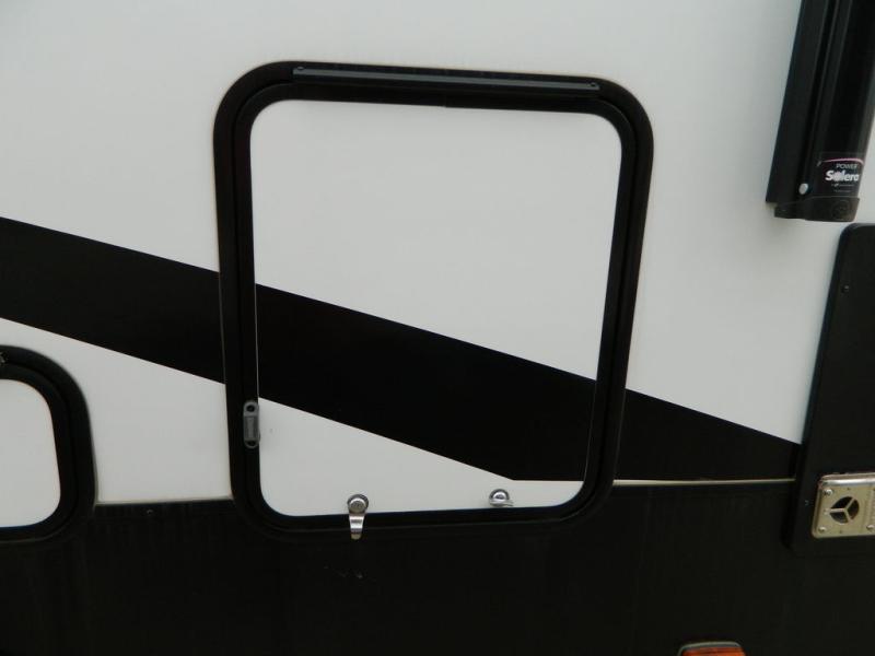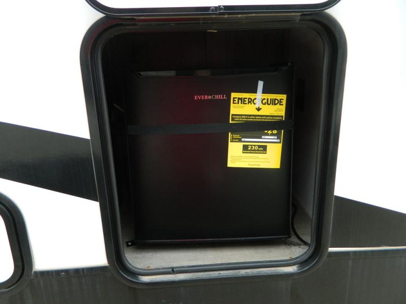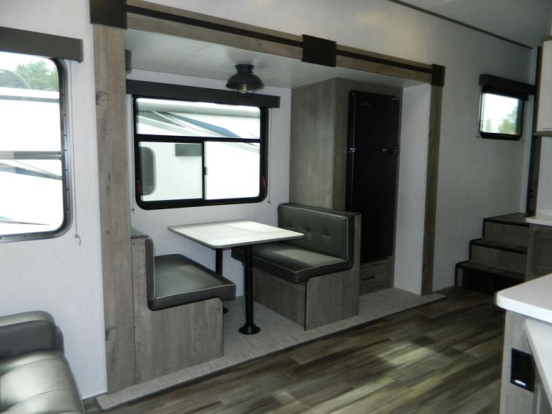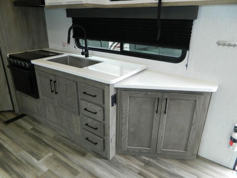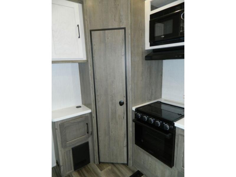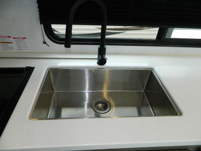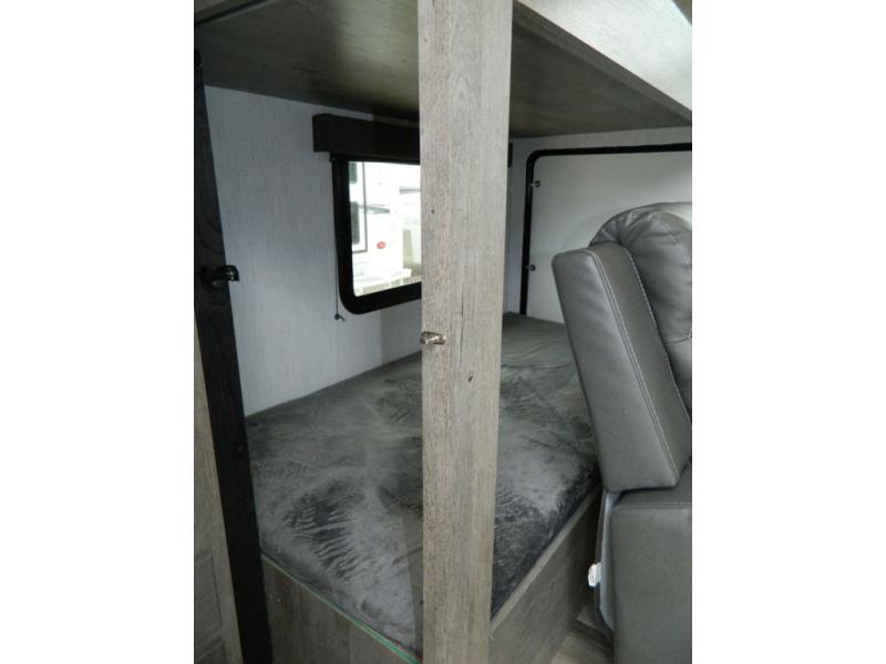 This Milestone M-One fifth wheel will catch your eye because it has an outdoor kitchen that you can use to cook up a meal worth sharing! You can pull out the 14' awning so that you have some shade while you cook, or you can simply head inside to do some extra preparations on the three-burner range. The farm sink will make it an easy job to do dishes afterwards, and the large pantry is an excellent place to store your midnight snacks. In the back of this unit is a set of bunk beds that rest behind the theater seating. There is also a ladder that leads up to the top bunk and a wardrobe to the side of the bunks for storage. The U-shaped dinette is a useful piece of furniture that allows you to sit down with a hot meal, and you can also transform the dinette into an additional bed at night.
