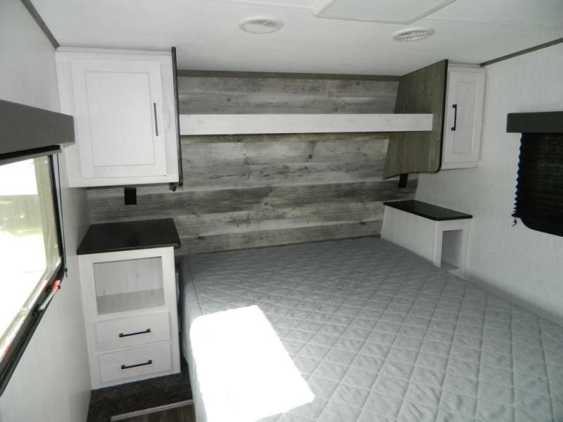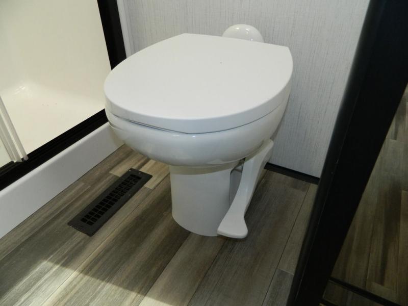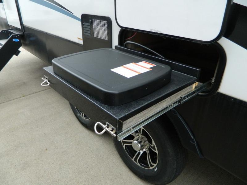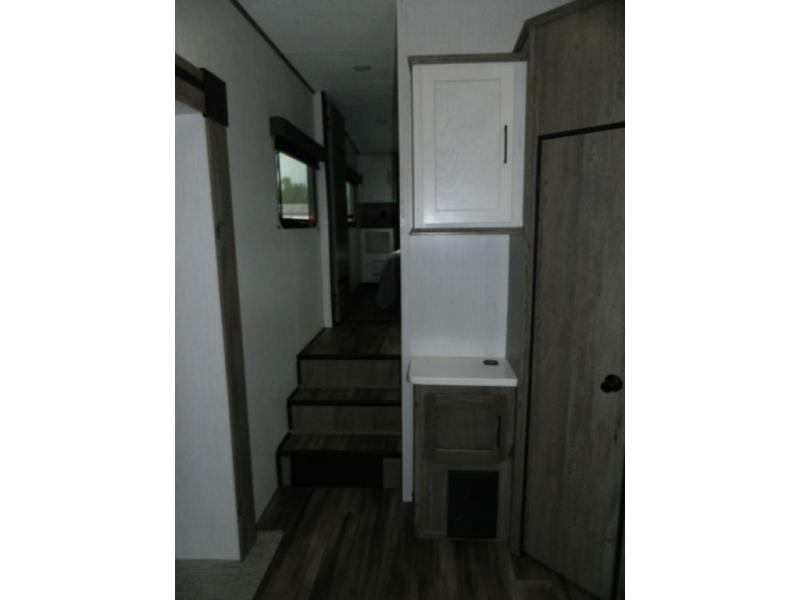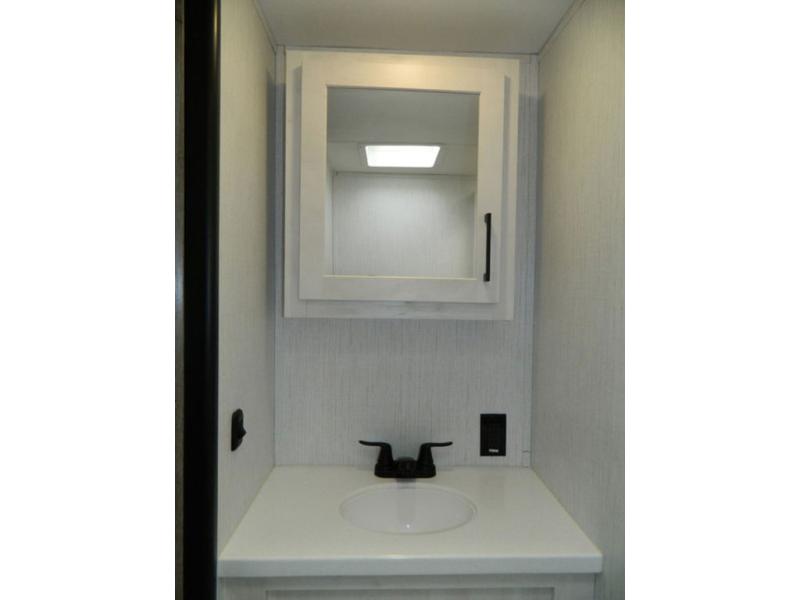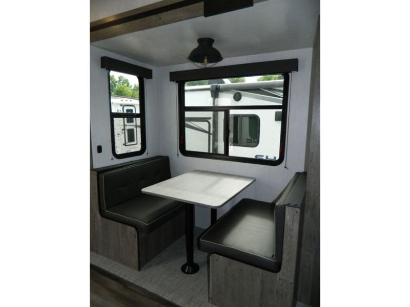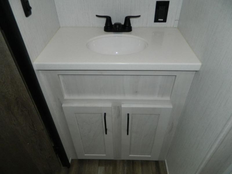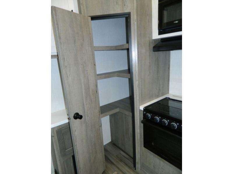 This Milestone M-One fifth wheel will catch your eye because it has an outdoor kitchen that you can use to cook up a meal worth sharing! You can pull out the 14' awning so that you have some shade while you cook, or you can simply head inside to do some extra preparations on the three-burner range. The farm sink will make it an easy job to do dishes afterwards, and the large pantry is an excellent place to store your midnight snacks. In the back of this unit is a set of bunk beds that rest behind the theater seating. There is also a ladder that leads up to the top bunk and a wardrobe to the side of the bunks for storage. The U-shaped dinette is a useful piece of furniture that allows you to sit down with a hot meal, and you can also transform the dinette into an additional bed at night.