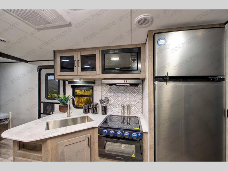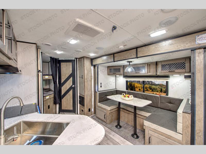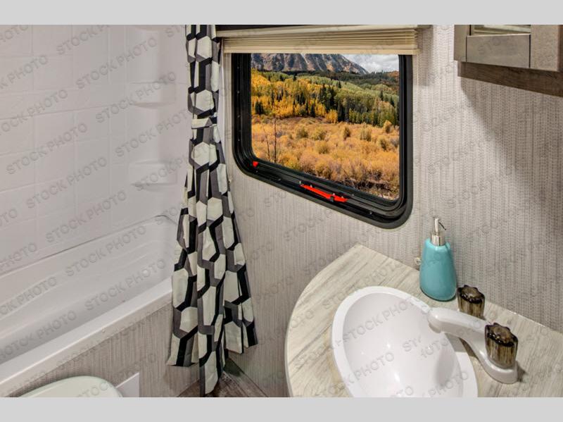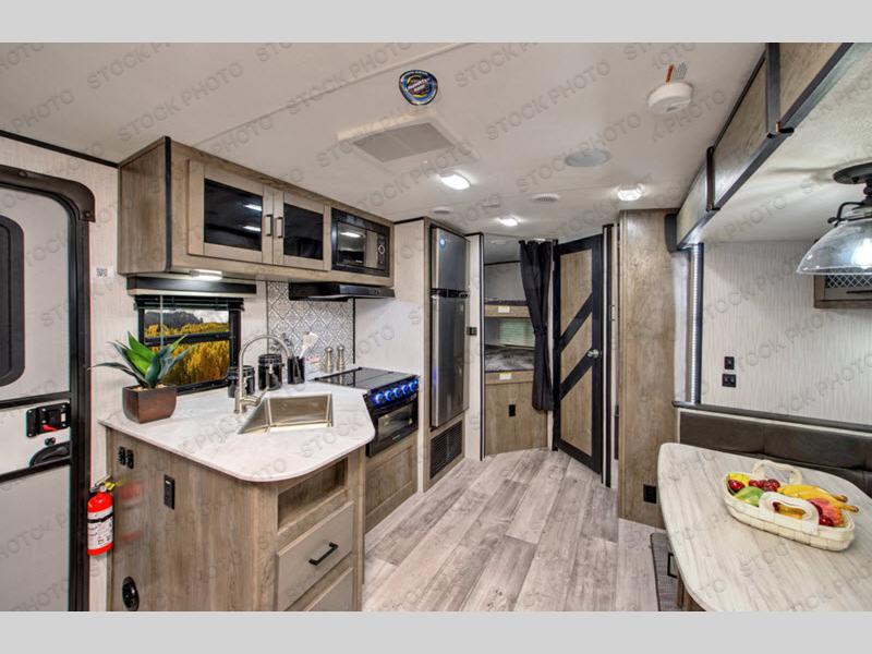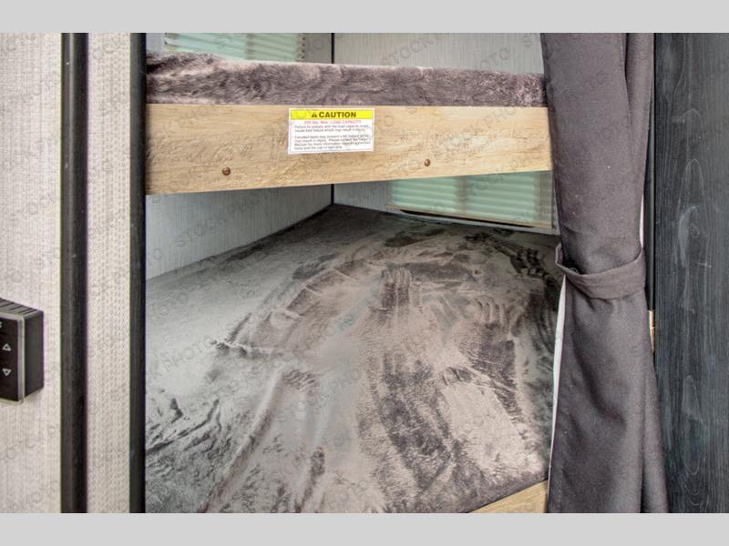 Step inside this travel trailer for a camping trip you won't soon forget. Once you arrive at your destination you can put out the 13' power awning, and the chef of the family can prepare lunch on the outside kitchen. Head inside to play a game of cards around the slide out U-shaped dinette, or everyone can take a rest before heading back outside. The kids are sure to love the double-size bunk beds, and mom and dad will enjoy the king bed in the front private bedroom. This model also includes a rotating entertainment center that will allow you to watch TV from the bedroom or the living area if you choose to add a TV!