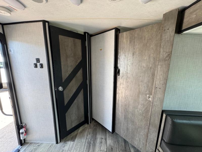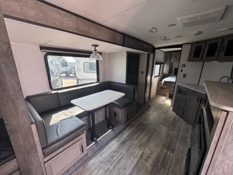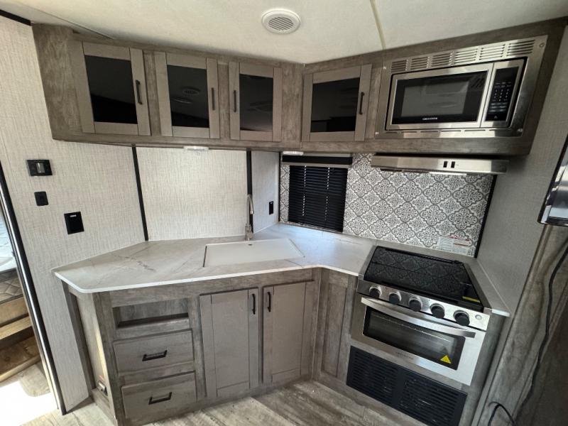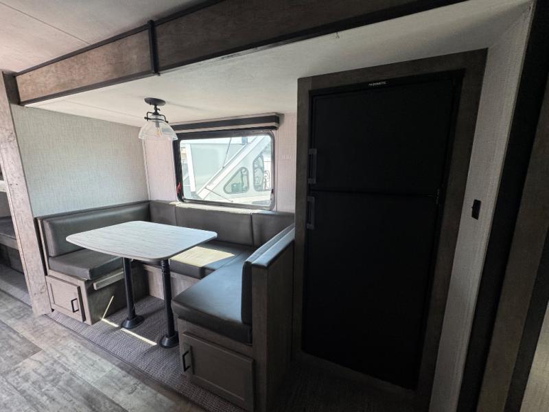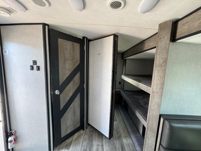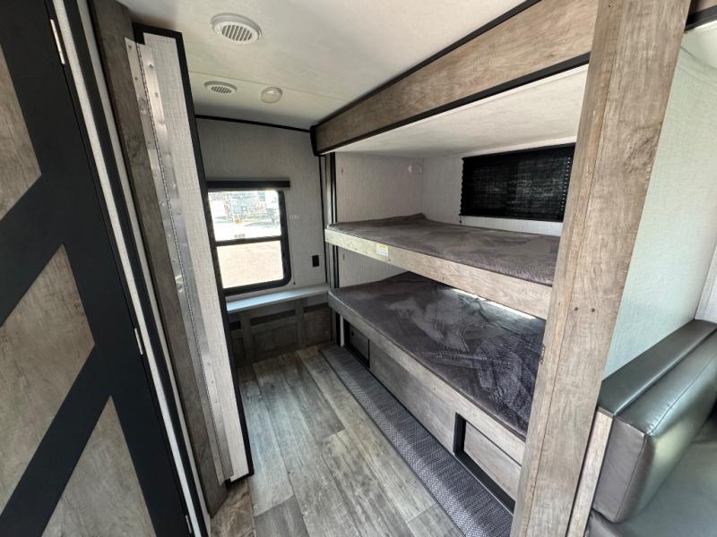This is a travel trailer the whole family will love! You can sleep seven to eight with the added bunk beds in the bunkhouse, the king bed in the front bedroom, plus the U-shaped dinette within the large slide out. The chef of the family can prepare meals on the three burner cooktop or use the microwave oven. There is plenty of counter space to prep fresh veggies, and the walk-in pantry can store paper goods and snacks. This model also includes a 18' electric awning with LED lights and outside speakers that will allow you to be the life of any party!