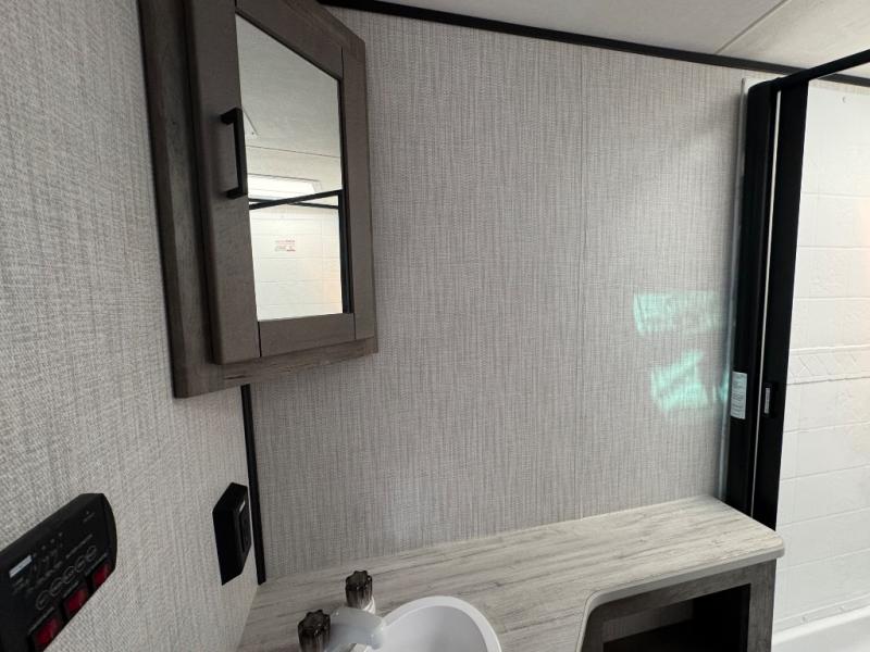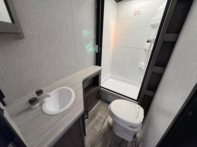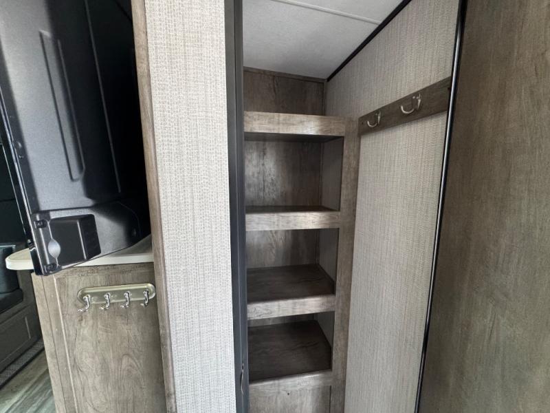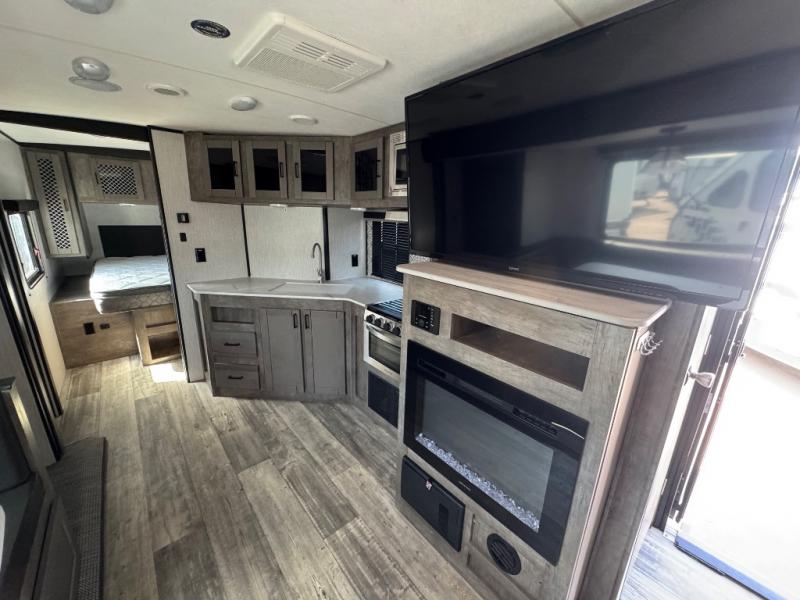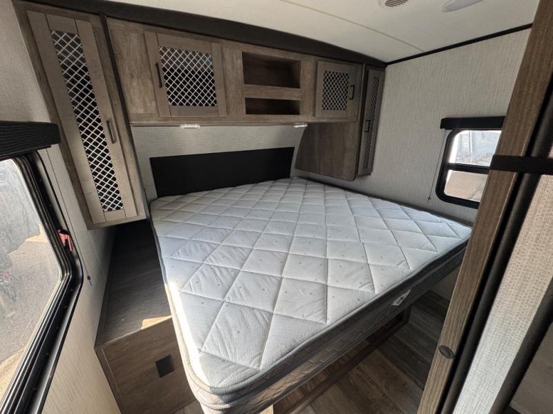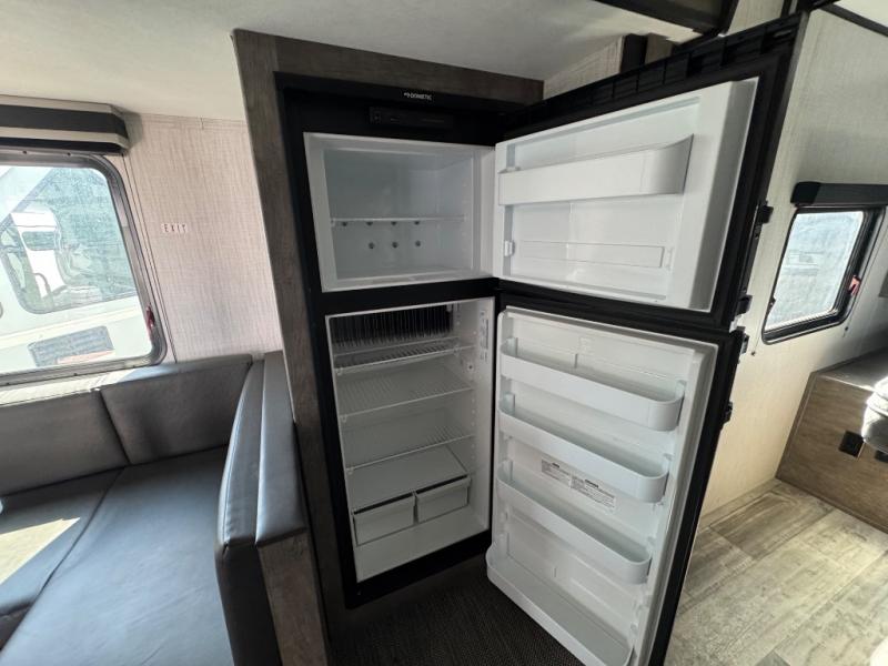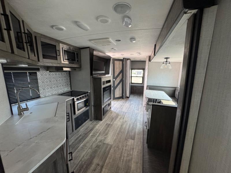 This is a travel trailer the whole family will love! You can sleep seven to eight with the added bunk beds in the bunkhouse, the king bed in the front bedroom, plus the U-shaped dinette within the large slide out. The chef of the family can prepare meals on the three burner cooktop or use the microwave oven. There is plenty of counter space to prep fresh veggies, and the walk-in pantry can store paper goods and snacks. This model also includes a 18' electric awning with LED lights and outside speakers that will allow you to be the life of any party!
