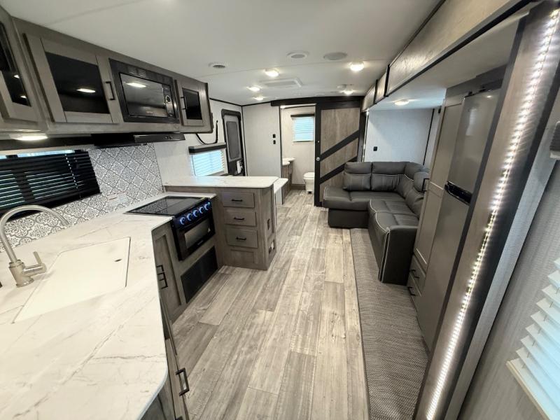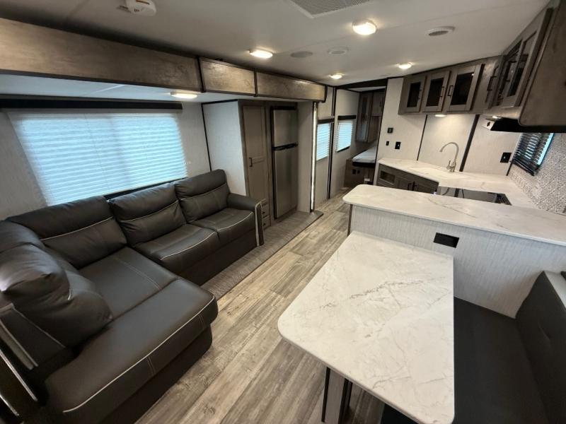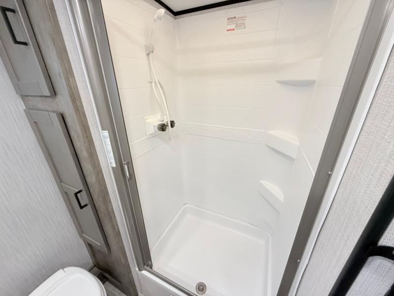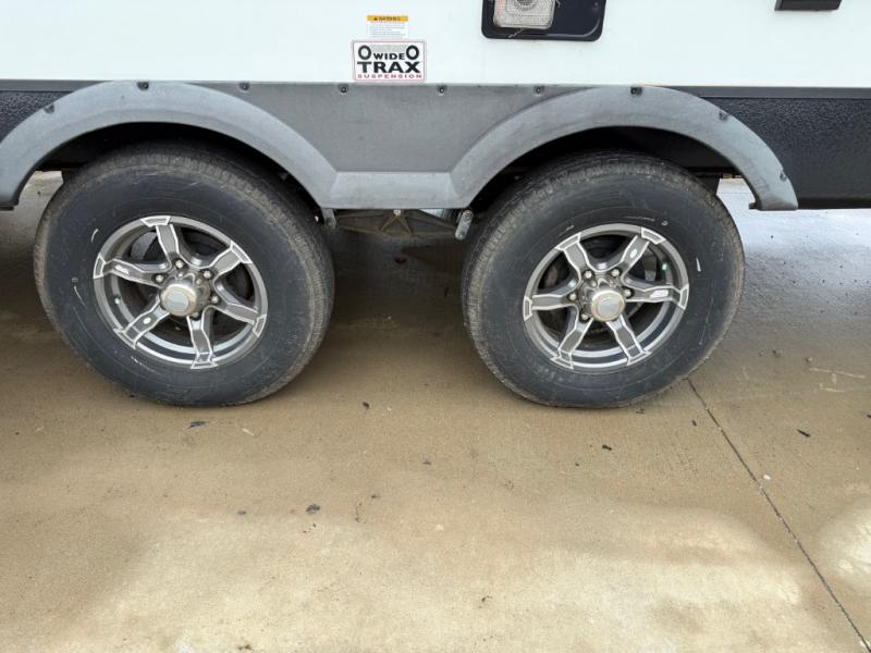With any North Trail travel trailer by Heartland you will enjoy open living spaces and comfortable at-home features. Inside, you will find a high rise kitchen faucet, infinity edge countertops, upgraded and overstuffed residential furniture, plus residential interior doors to make you feel right at home. Each unit is constructed with Azdel fortified sidewalls with "stay cool technology", a heated and enclosed underbelly, and a fully walkable roof to easily clean the top of your unit after a week at the campground. Outside, you'll find four stabilizer jacks for easy set-up, E-Z lube hubs, slam latch baggage doors, plus an outside shower to wash off sand from the lake. These travel trailers include many convenient features, including a 30,000 BTU furnace, a gas/electric DSI water heater, a dual ducted A/C system, plus many options you can choose from to maximize your camping experience.