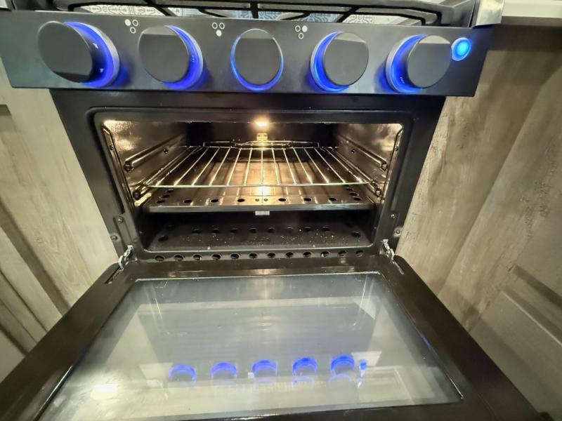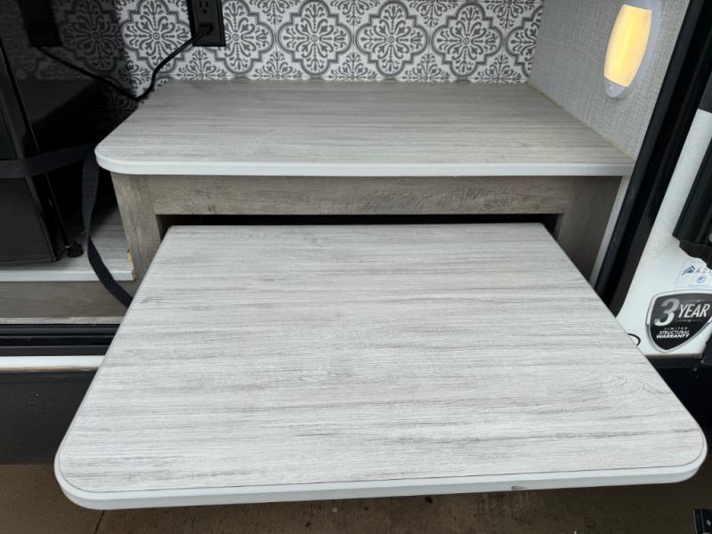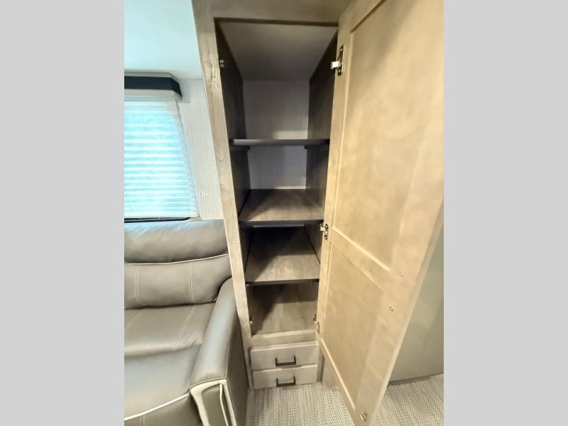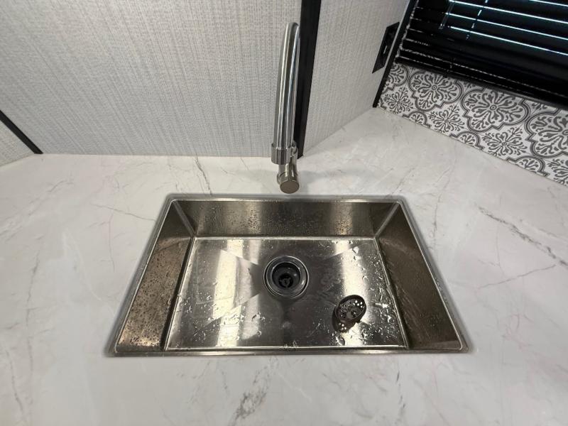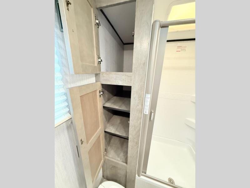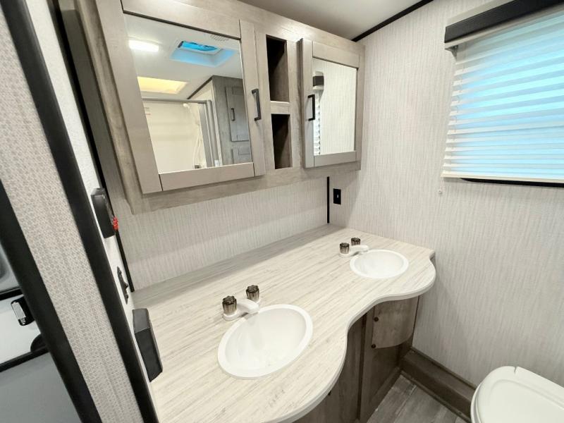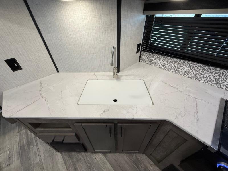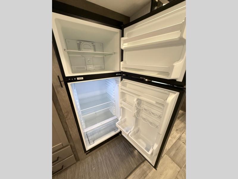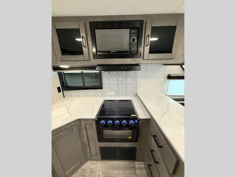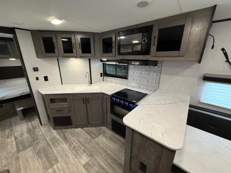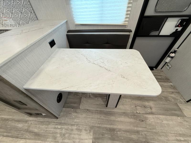 You and your spouse will thoroughly enjoy this spacious travel trailer. The large slide out will provide the chef of the family space to cook meals each day, and the added counter space will allow them space to set out the food once it's done. You can dine at the dinette that includes a bench seat on one side and two chairs on the other, or take your plate to sit outside under the 16' power awning. The L-shaped lounge will be perfect for taking a rest on or just catching up on some reading. This also model includes a full rear bath with a dual sink vanity so you and your spouse can both get ready in the morning at the same time!