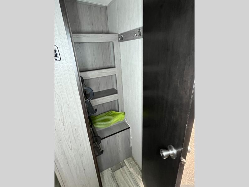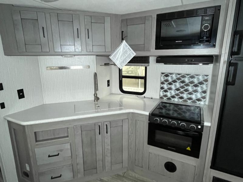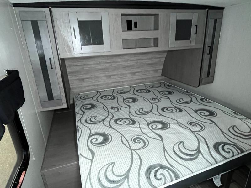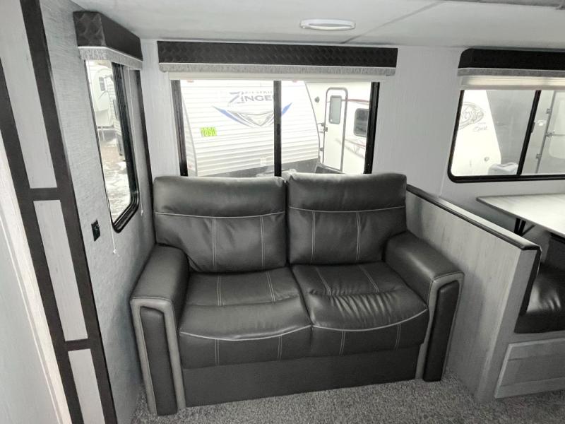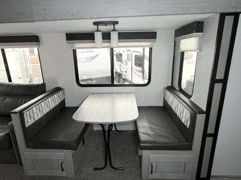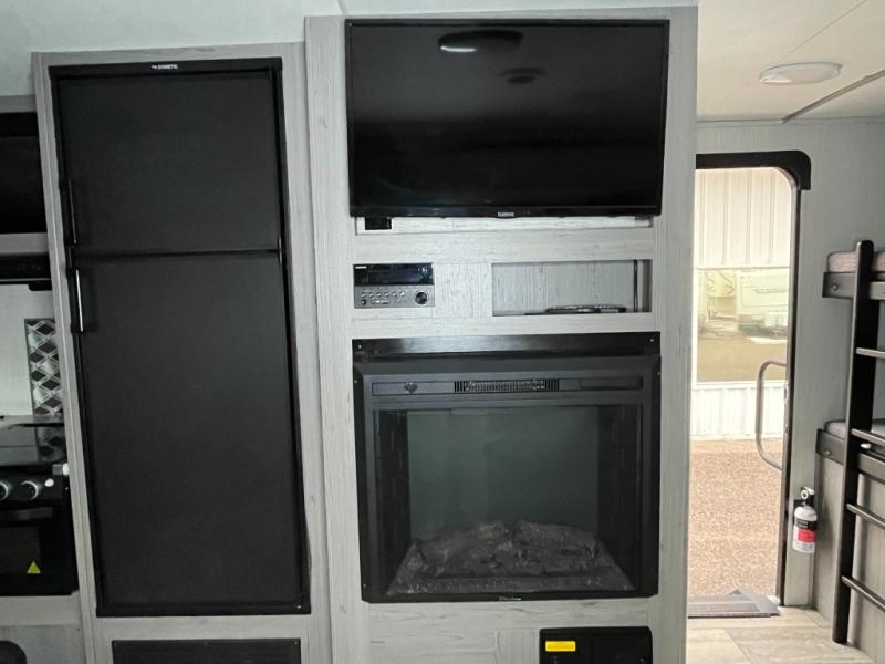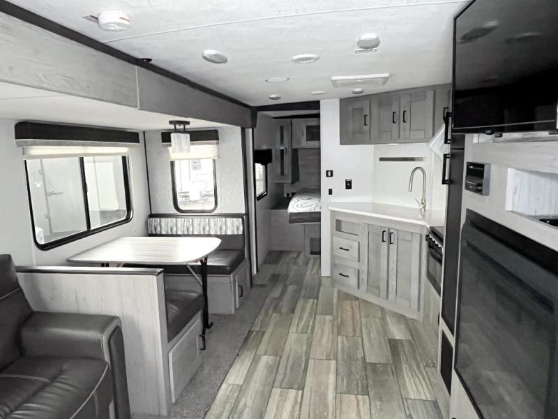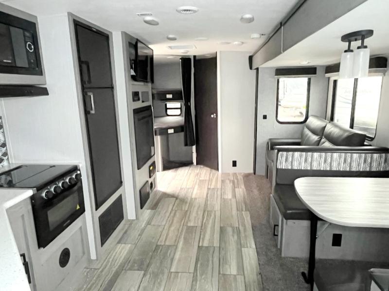 It's time to upgrade your tent to a travel trailer, and this spacious model is just for you! Within the large slide out you will find the booth dinette and sofa that will be great for meal times, sleeping space, and game night. The kids are sure to love the queen-size bunks, and mom and dad will have their own king bed in the front private bedroom. You will find plenty of storage space, including an exterior King Kong sized pass-through storage, plus a walk-in pantry inside for all the snacks and paper goods. This model also includes an outside refrigerator, counter space, and a sink so the kids can wash up and grab a cold drink after riding their bikes!