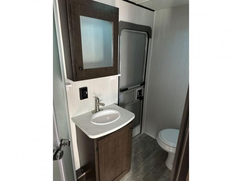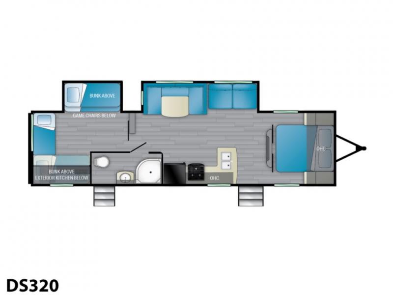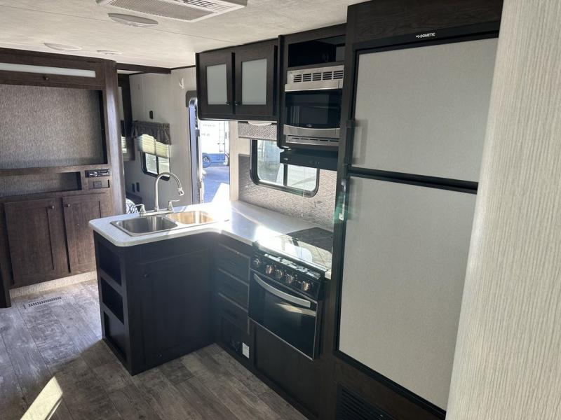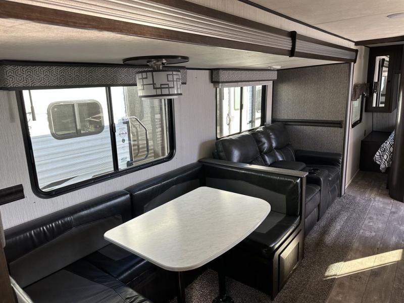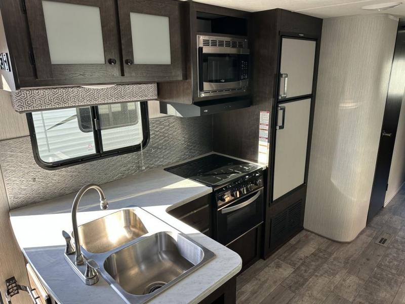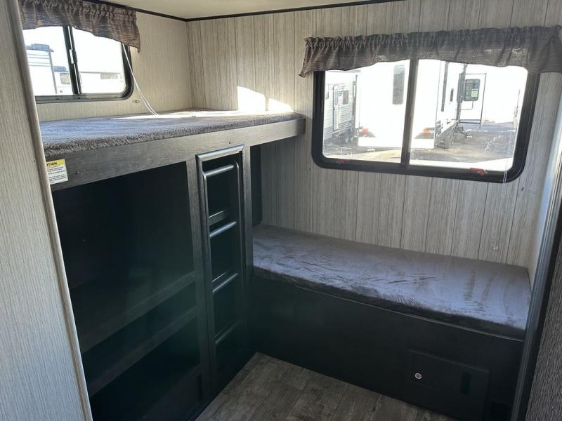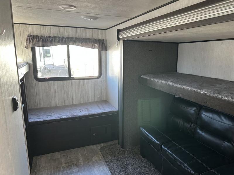 Pack your bags and hitch up this travel trailer for a fun weekend getaway with the whole family! You won't believe all of the space and sleeping spots in the rear private bunkhouse. There is not only a bunk bed above a set of gaming chairs that can convert into a bed, but also a second and third bunk with wardrobe storage underneath one. One of the dual entry doors leads directly into the full bathroom which has a radius shower for everyone to freshen up each morning. Grab some eggs and bacon from the 8 cu. ft. refrigerator then fry them up on the three burner cooktop and enjoy them at the U-shaped dinette. If you need to take a quick afternoon nap then head to either the sofa or the queen bed inside the front private bedroom!