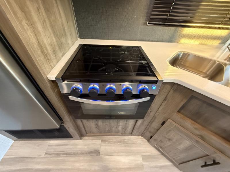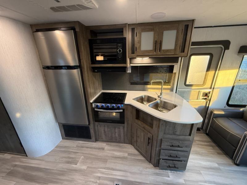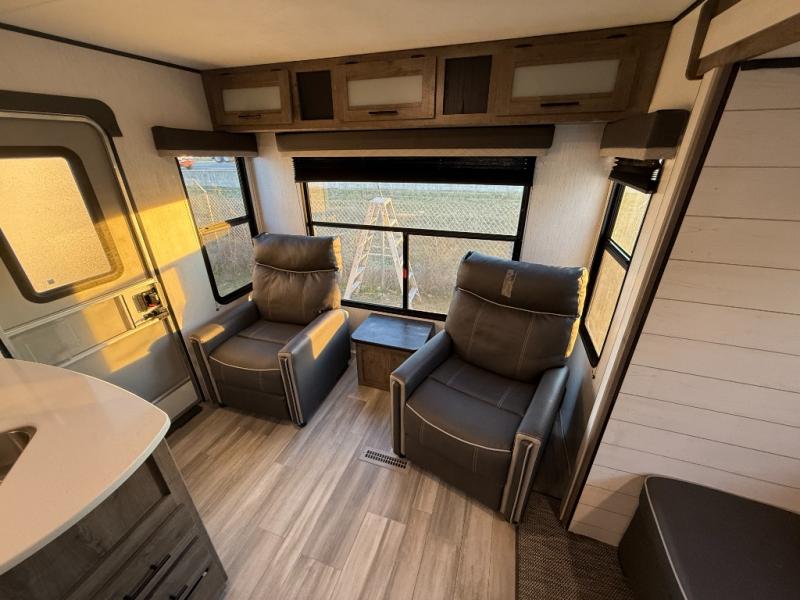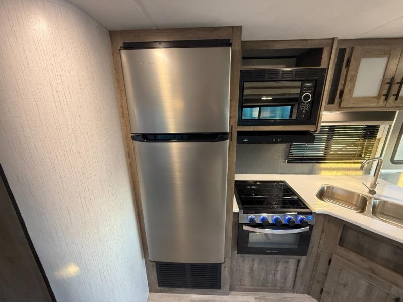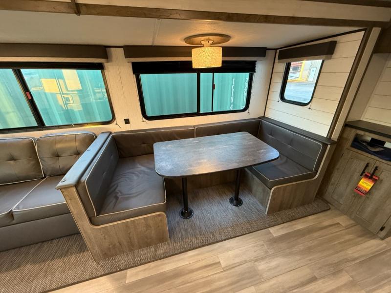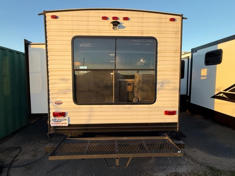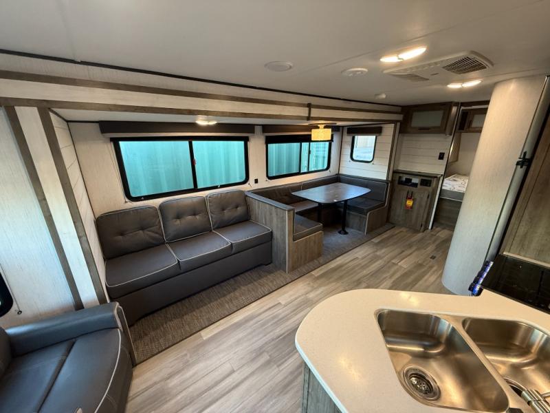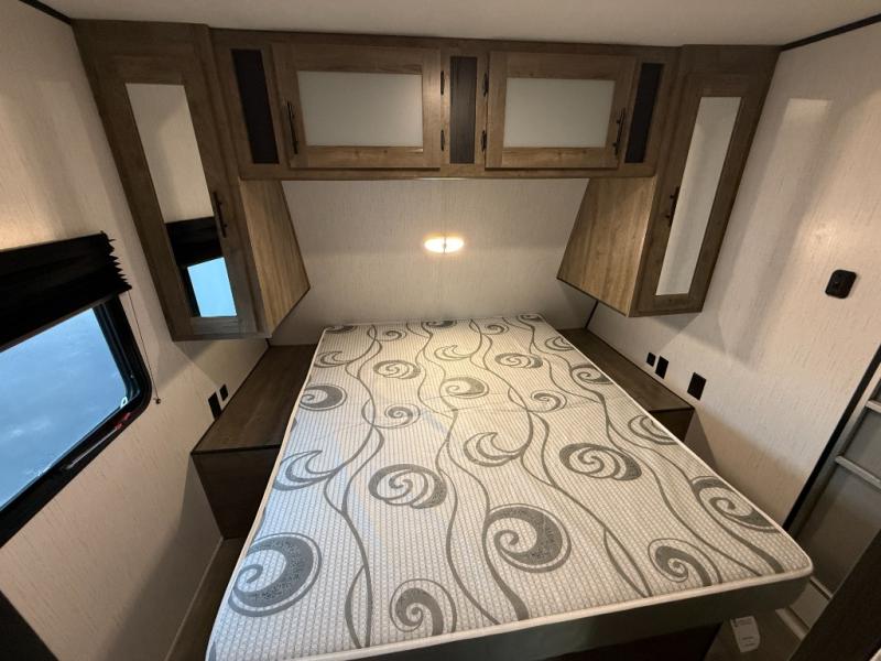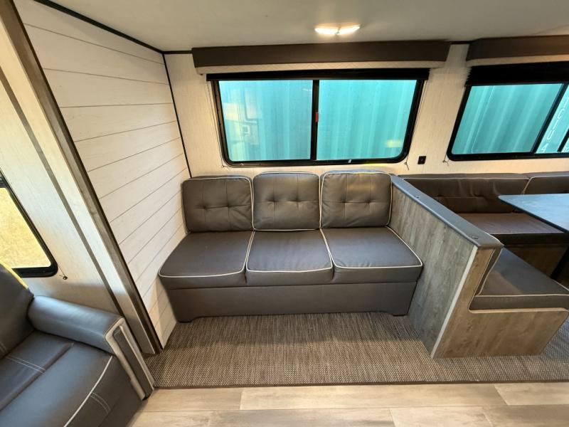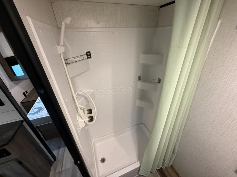 You will have everything you need for a great weekend of camping in this travel trailer! The rear two recliners have a table in between so you can set your cup of coffee on it while you read your book. The sofa is a great place for an afternoon nap and the U-shaped dinette offers a comfortable spot to eat, play games, and even sleep. The full bathroom has a shower so you can start each morning feeling clean and fresh, and the front private bedroom has a queen bed for a good night's rest!