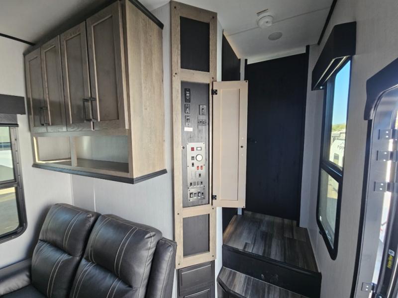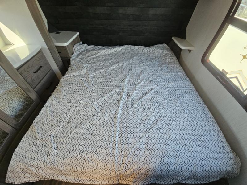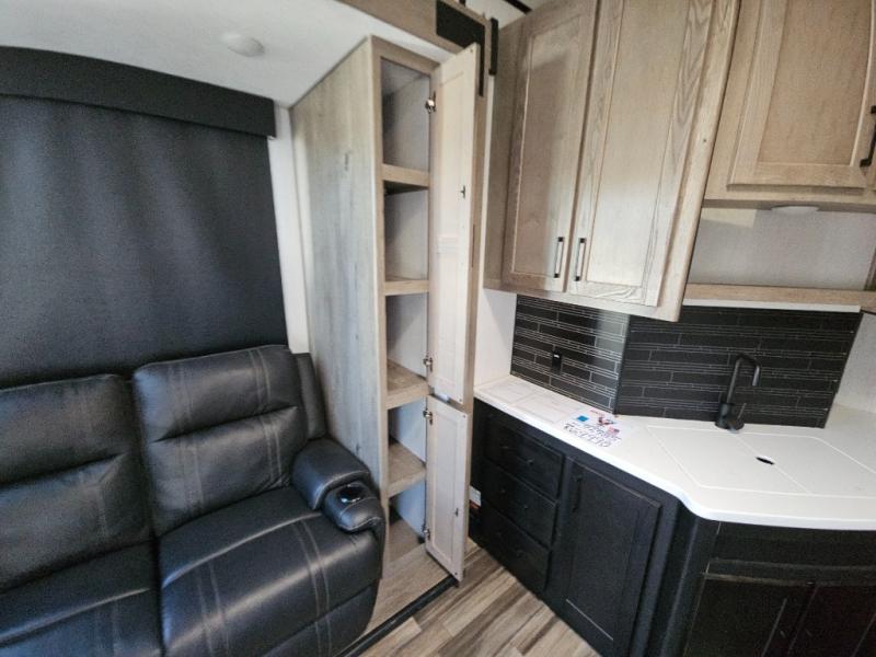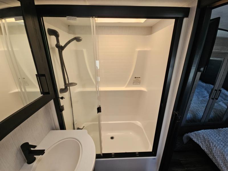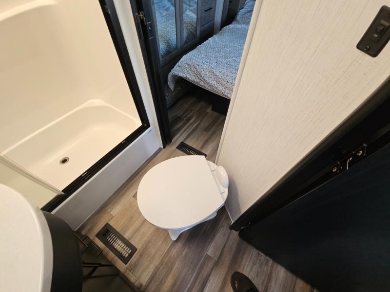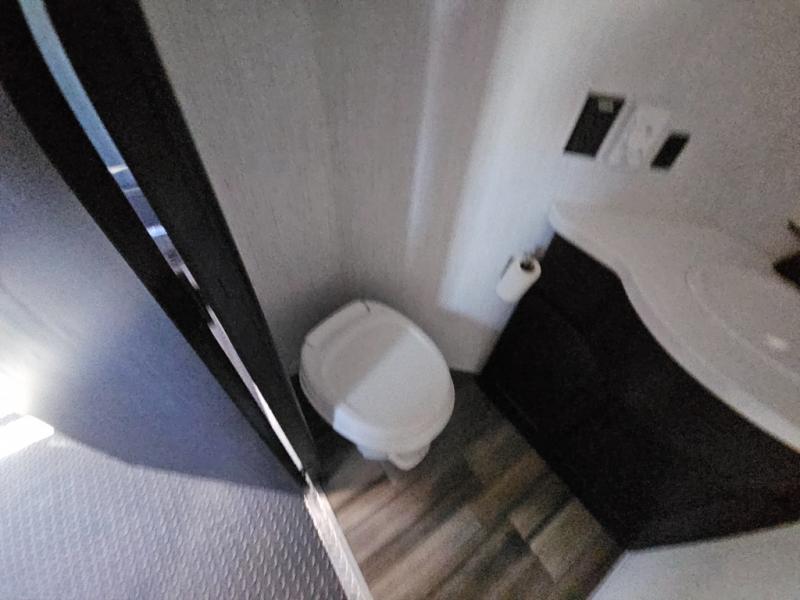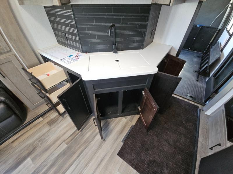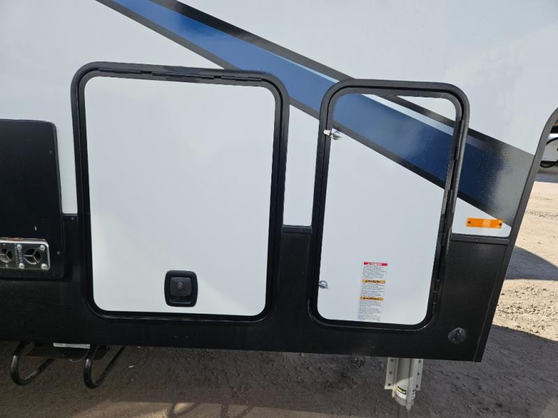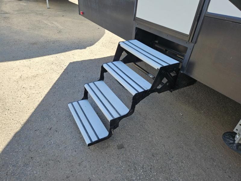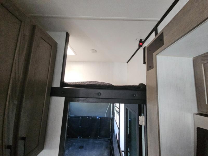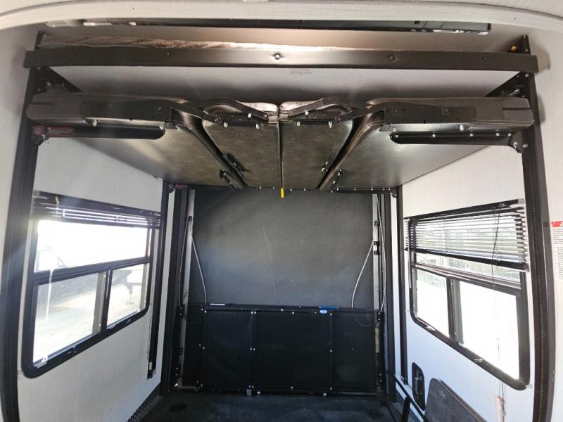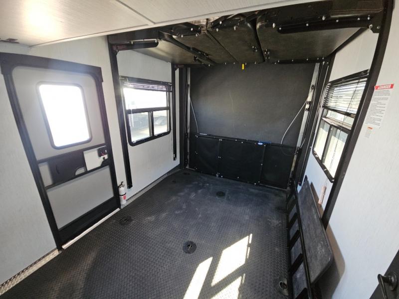 Pack your bags and load up your ATVs into this Road Warrior with the zero gravity ramp door! The garage area not only has an overhead loft area above a half bathroom and an entrance/exit door, but also the option to add an electric queen bed with split bench seat and bed below it too. There is a three burner cooktop for you to prepare your best home cooked meals, and two sofas to relax on after a fun day on the trails. The front private bedroom has a king bed, a wardrobe slide to keep your clothes looking nice, and an entrance into the dual entry bathroom. The cold crack resistant flooring will be easy to clean so you don't have to worry about mud staining the floor!