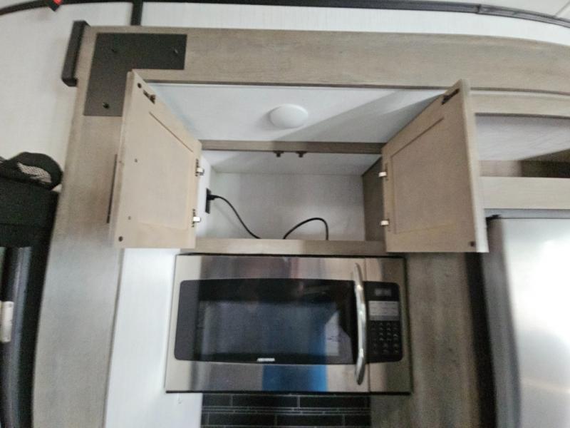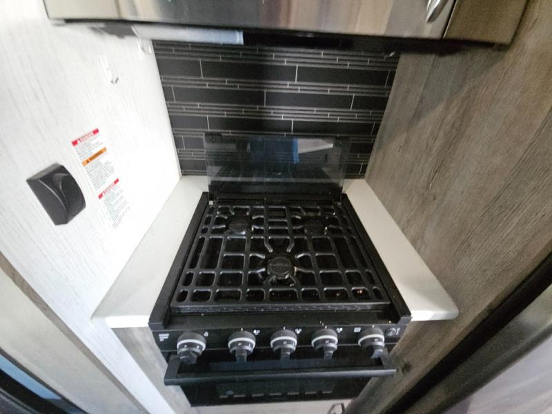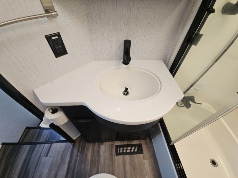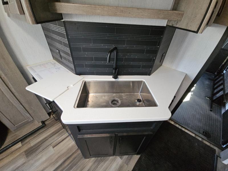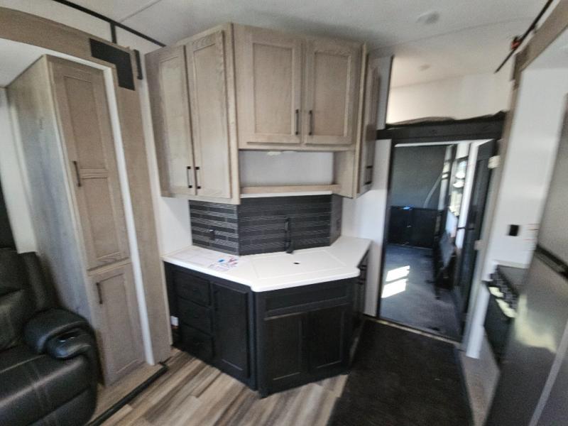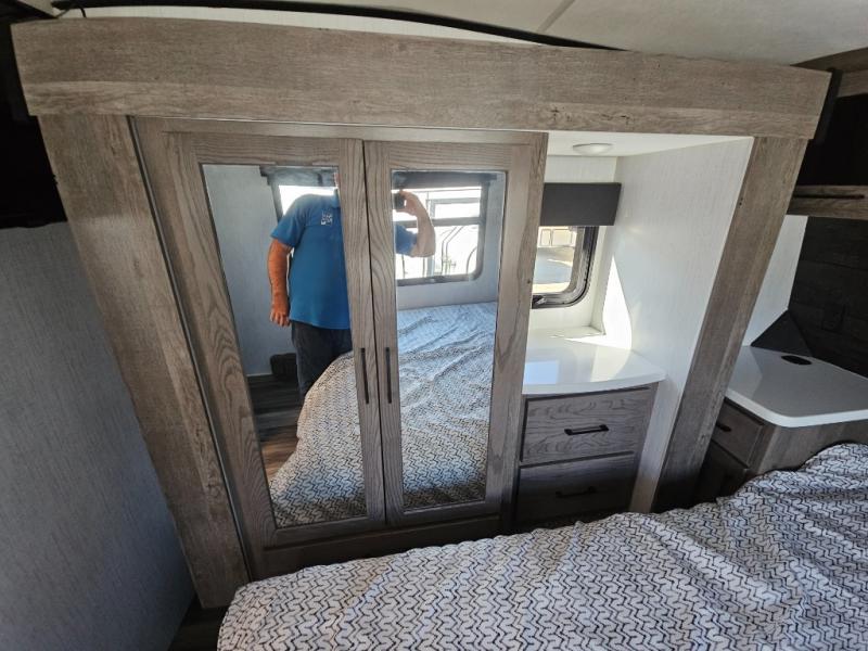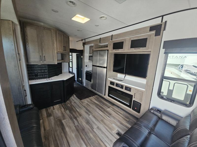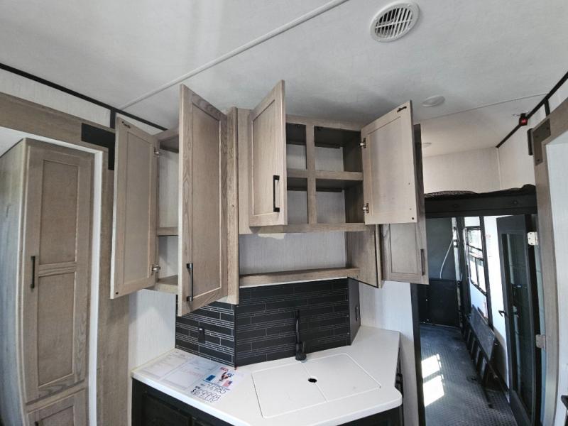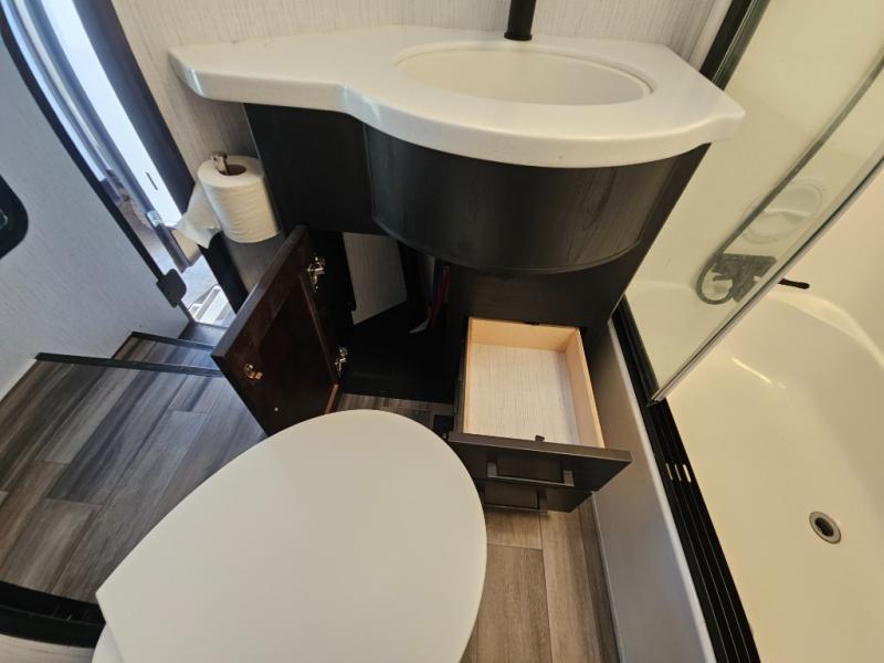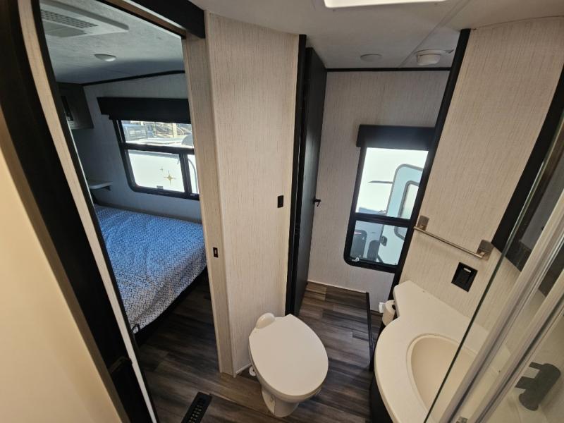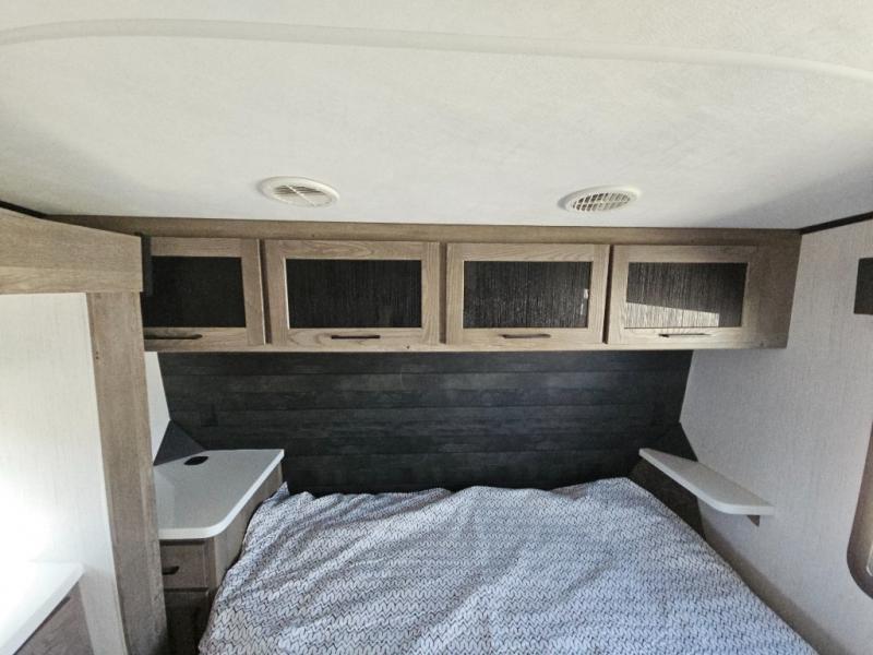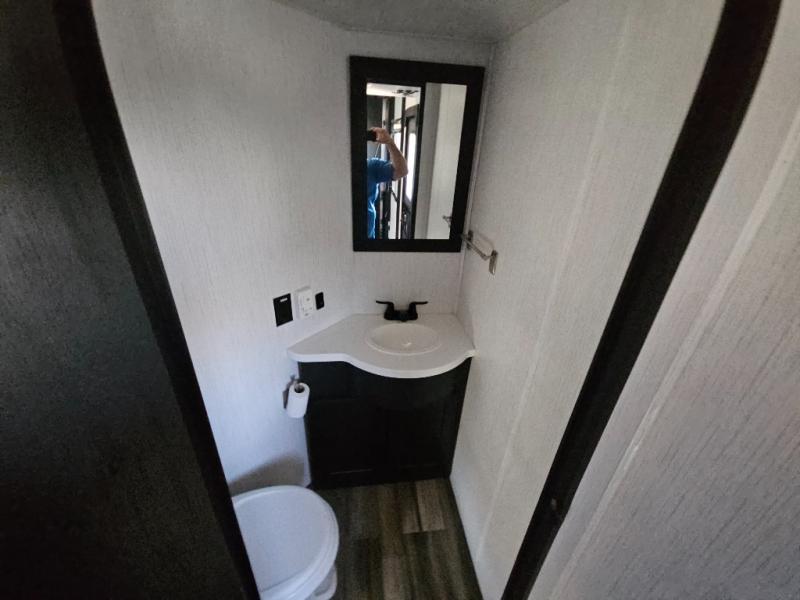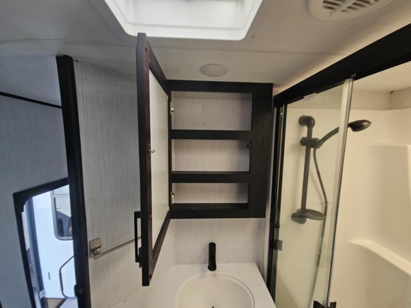 Pack your bags and load up your ATVs into this Road Warrior with the zero gravity ramp door! The garage area not only has an overhead loft area above a half bathroom and an entrance/exit door, but also the option to add an electric queen bed with split bench seat and bed below it too. There is a three burner cooktop for you to prepare your best home cooked meals, and two sofas to relax on after a fun day on the trails. The front private bedroom has a king bed, a wardrobe slide to keep your clothes looking nice, and an entrance into the dual entry bathroom. The cold crack resistant flooring will be easy to clean so you don't have to worry about mud staining the floor!