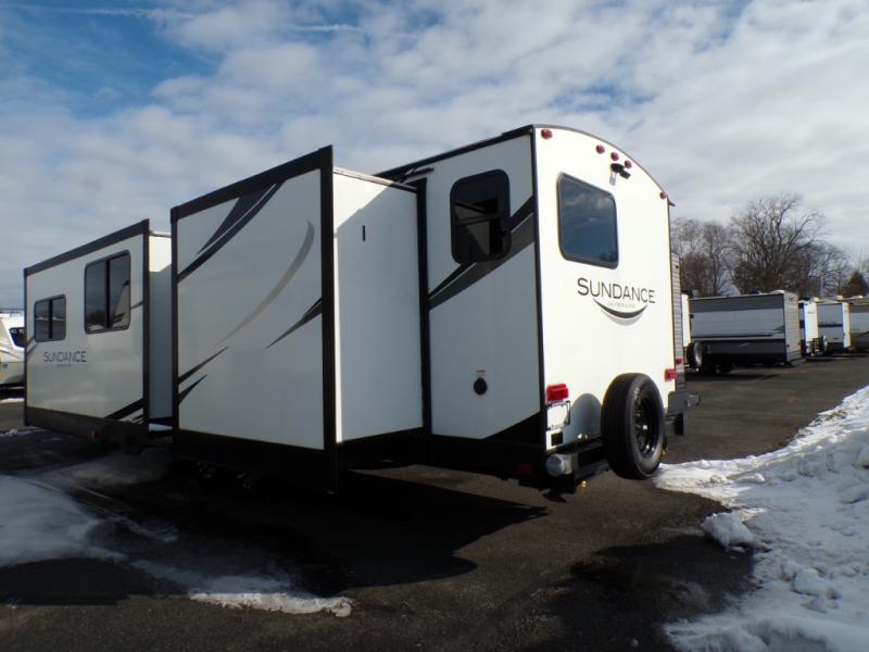 Are you looking for the ultimate travel trailer that will accommodate everyone's wish list? This Sundance travel trailer will give you the opportunity to have the kids playing outdoors while you make dinner on the outside kitchen, and your friends can gather around the campfire or under the 20' awning. You can also prepare and cook some of the food inside with the three-burner cooktop and counter space. Once everyone is tired or it's time for bed, you can get cleaned up in the full bathroom with an interior entrance and a handy second exterior entry door. You can then relax on the sofa and dinette before heading to the front master bedroom or rear private bunkhouse. There is more to see and love, so check it out today!