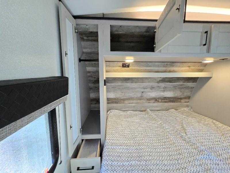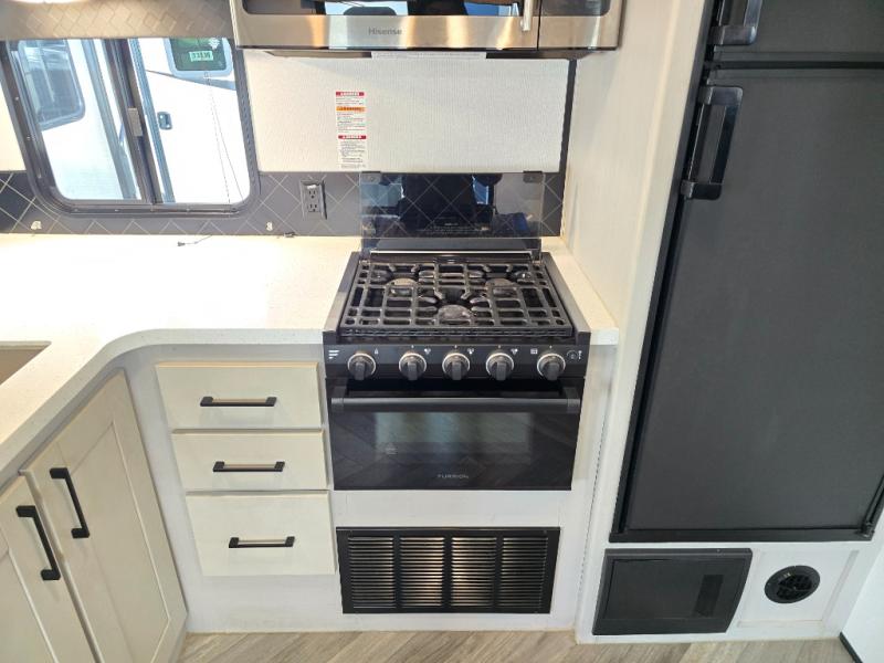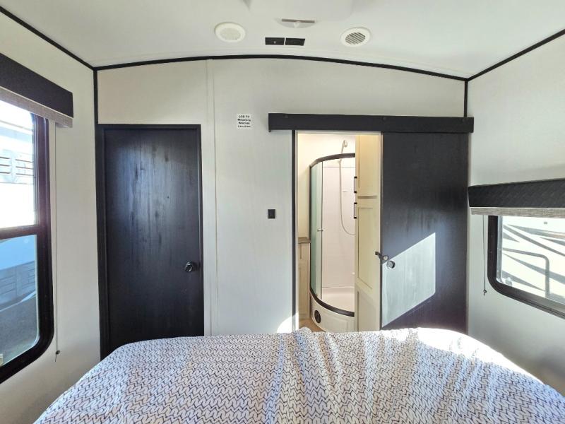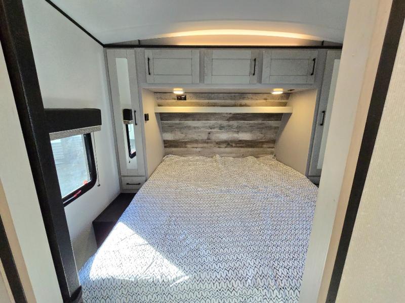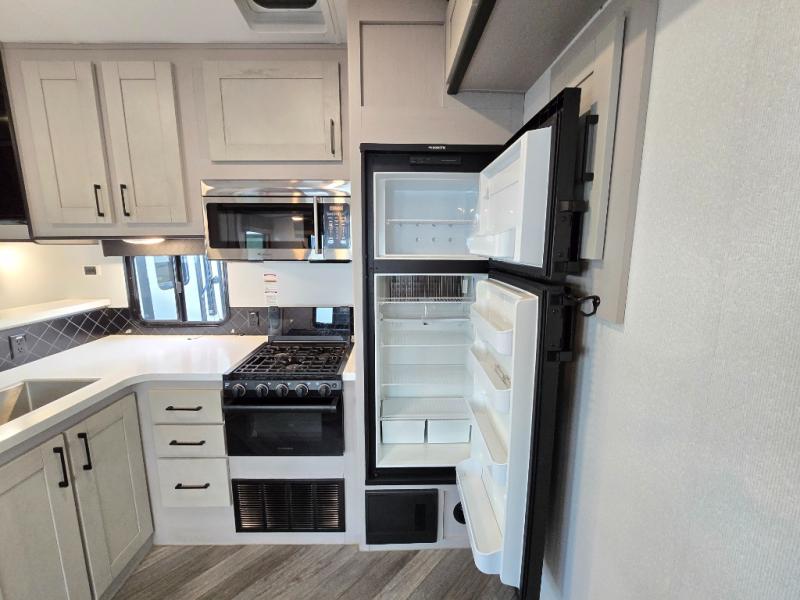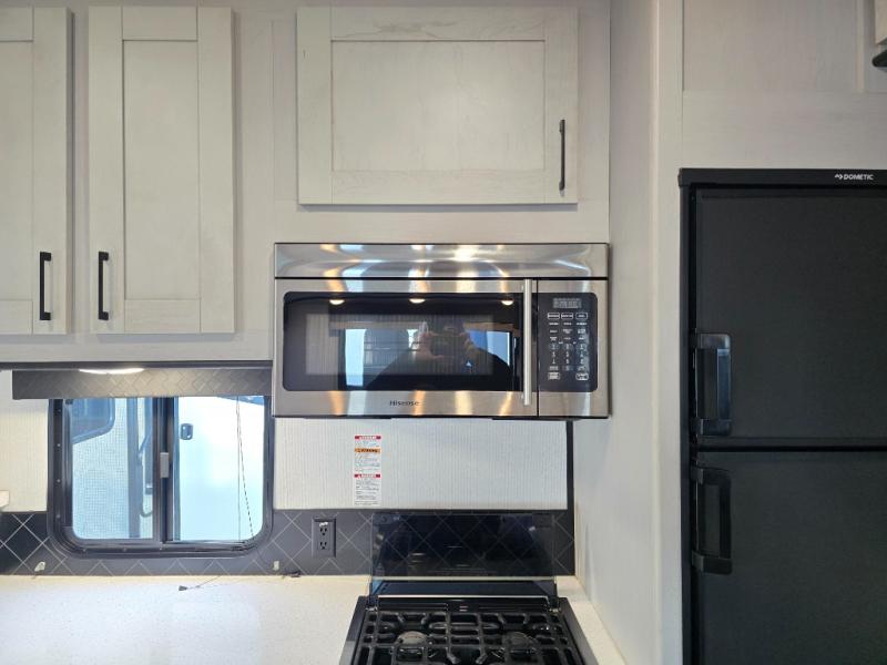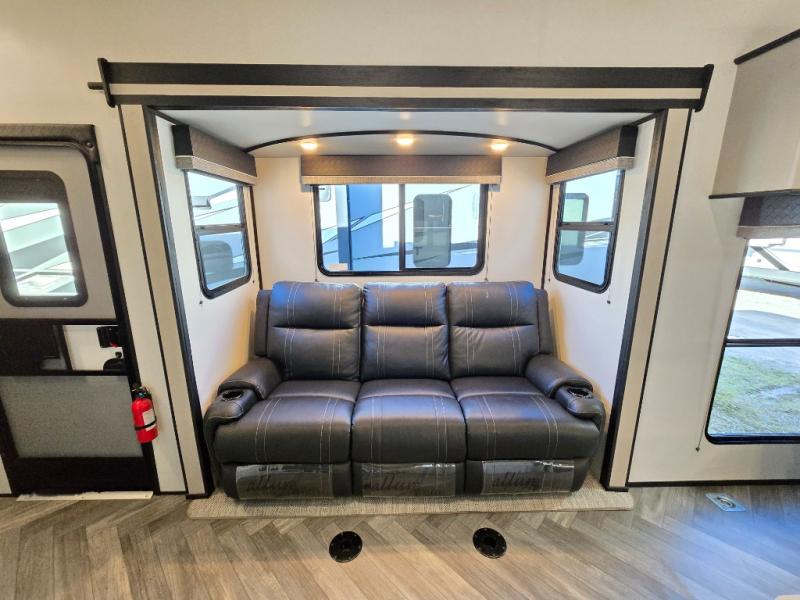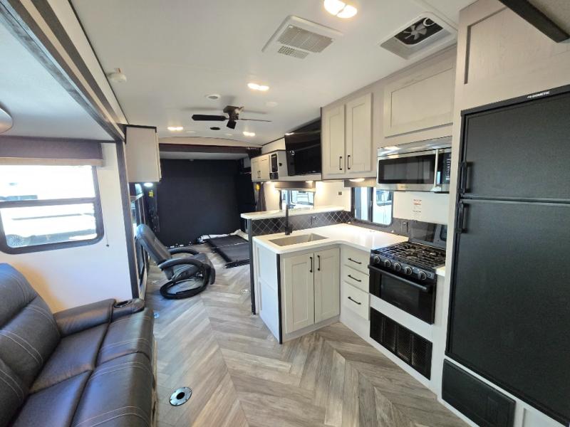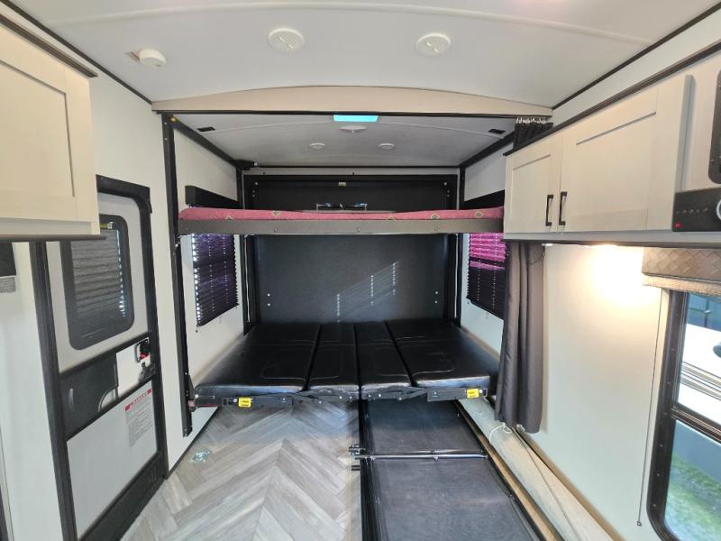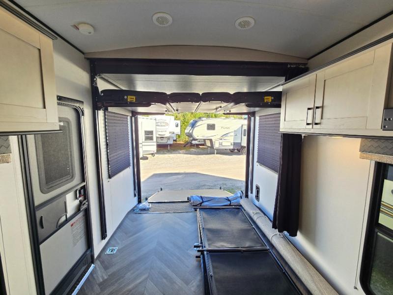 You won't want to camp any other way once you step inside this toy hauler! The garage has 14' of cargo space, an entrance/exit door, and a power queen bed above the opposing sofa with dinette to enjoy your meals and play games. You could even sit at the sofa slide with table and socialize with the chef while they prepare dinner on the three burner range. The dual entry bathroom has a radius shower for you to clean up in and enters directly into the front private bedroom which has a king bed for a good night's rest!