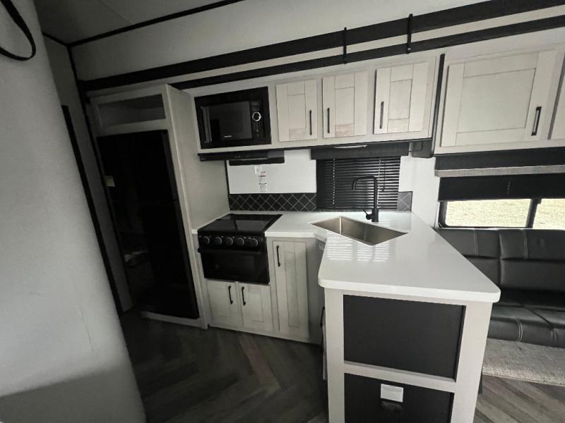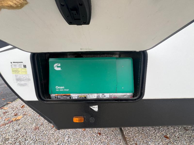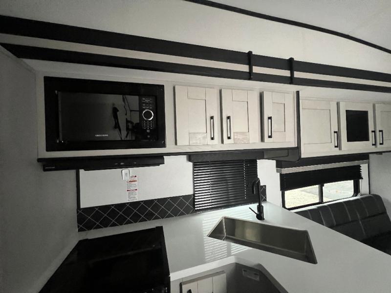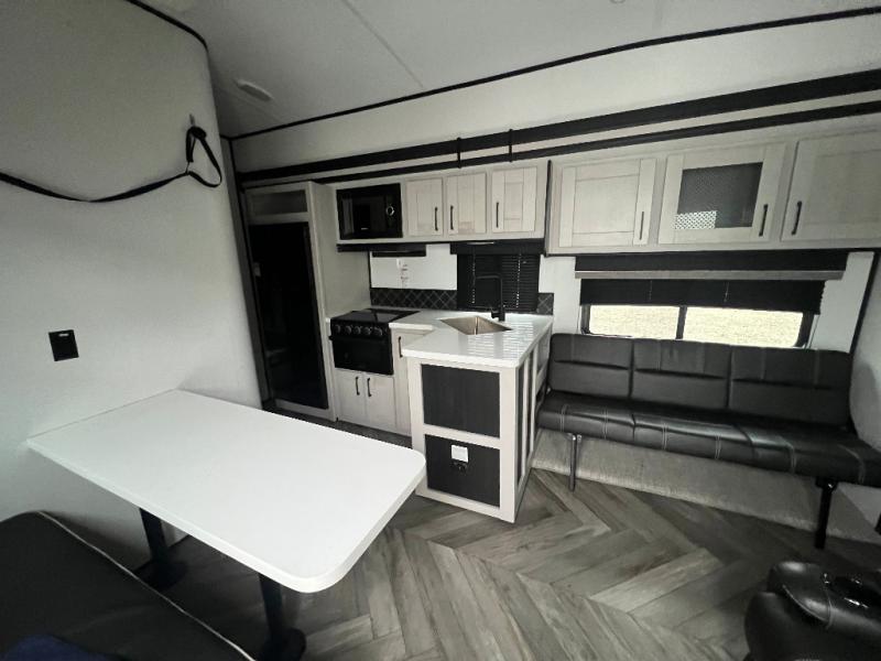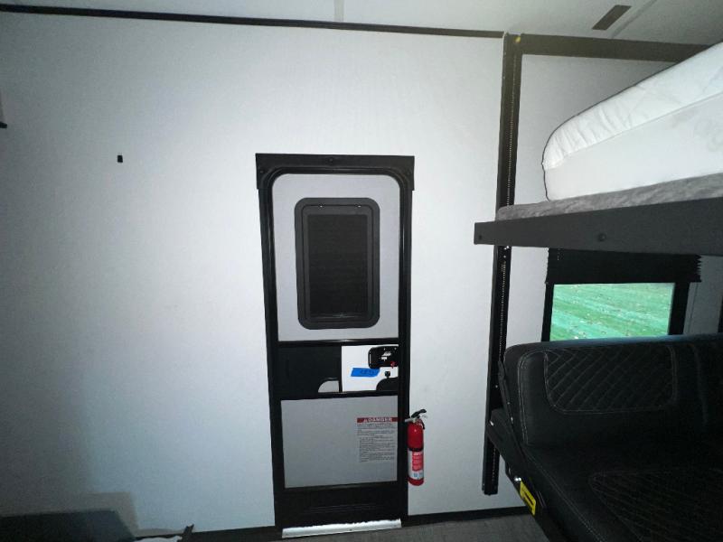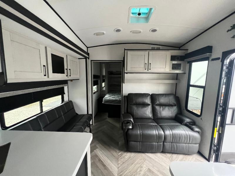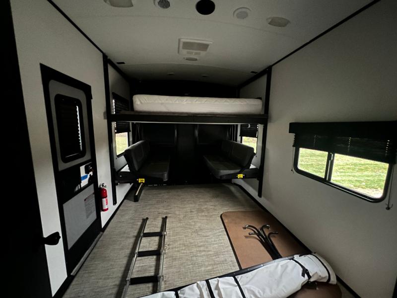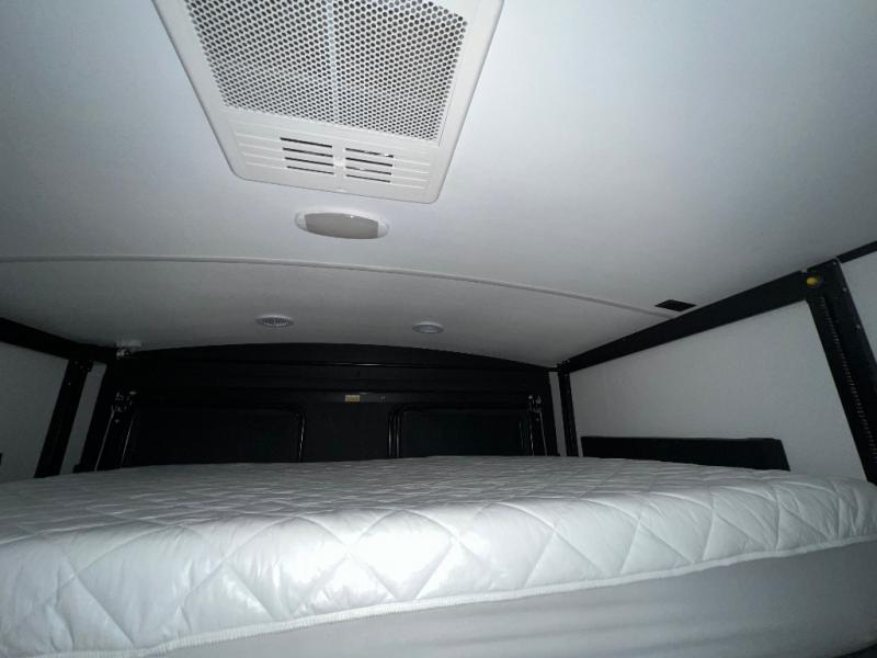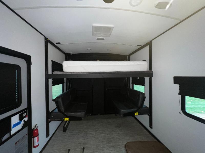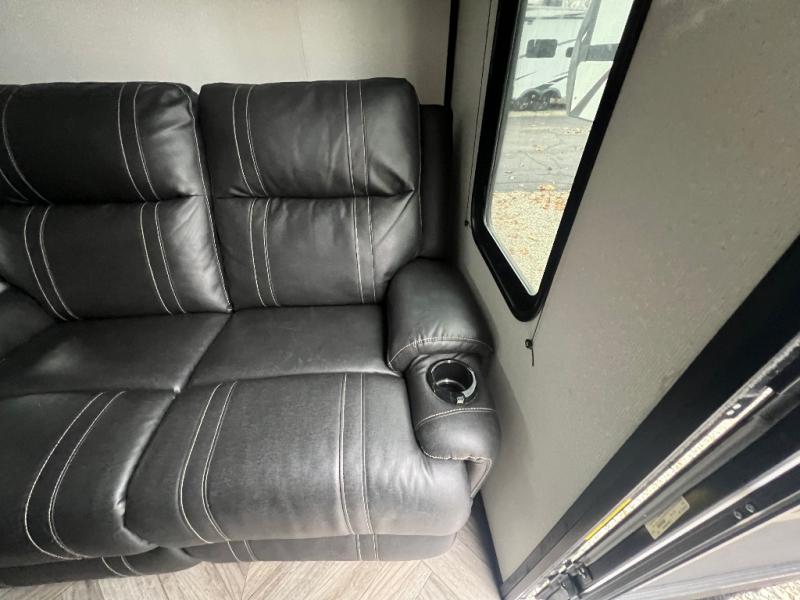 This toy hauler is packed full of amenities! From the power queen bed above an opposing sofa with a dinette to the single booth dinette, the two sofas, and the front private bedroom with a king bed. There is also a full bathroom for you to freshen up in each morning, a 8 cu. ft. refrigerator to keep your orange juice cold, and a three burner range to fry up some bacon. The dual entry doors are convenient, and the 19' electric awning will keep you protected whether rain or shine!