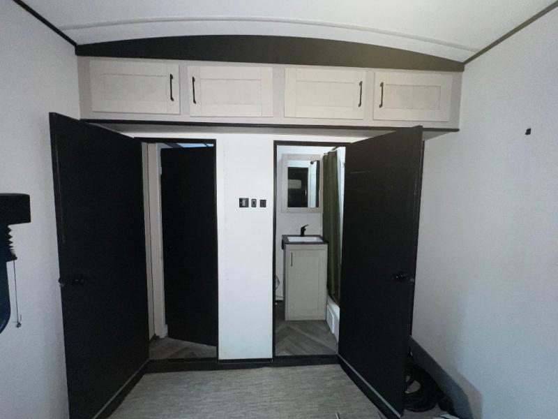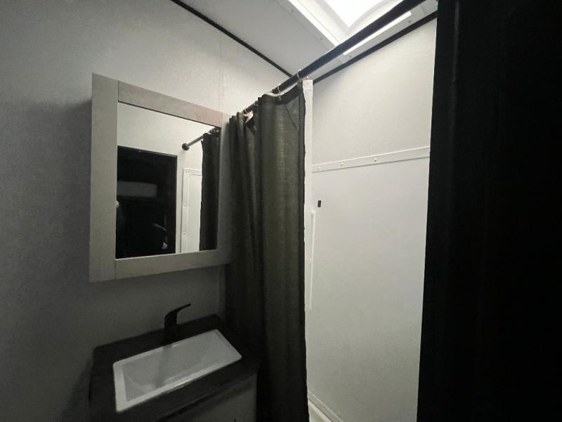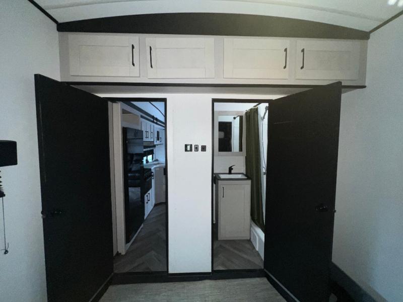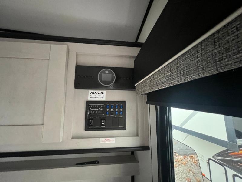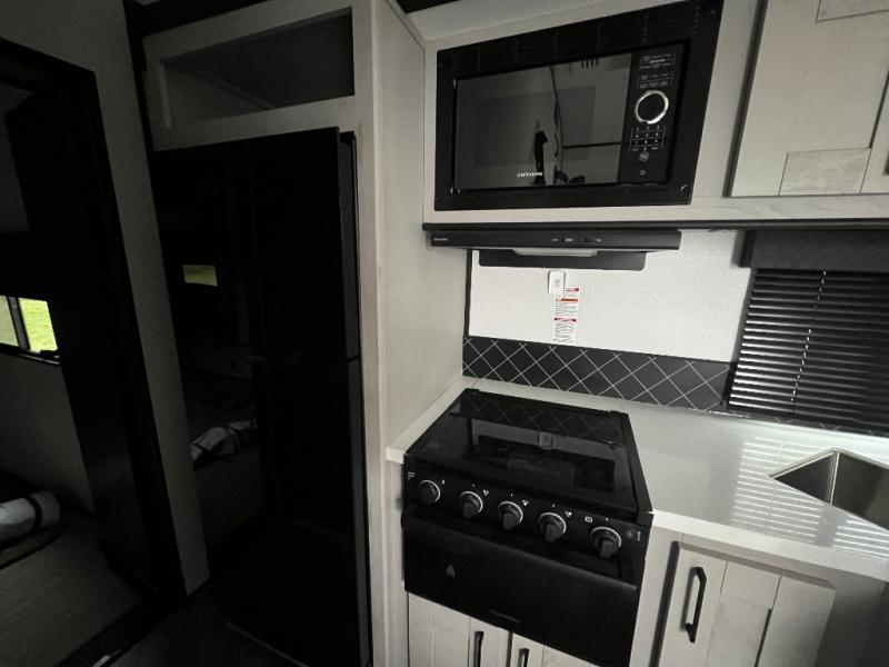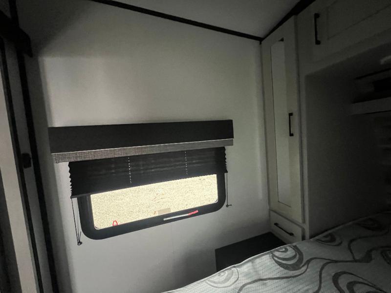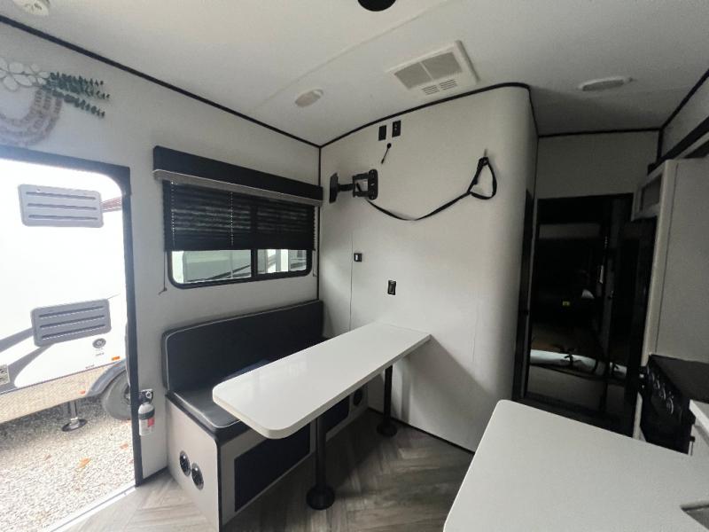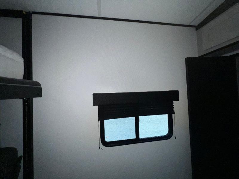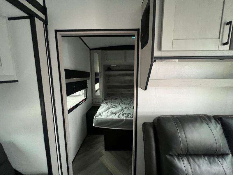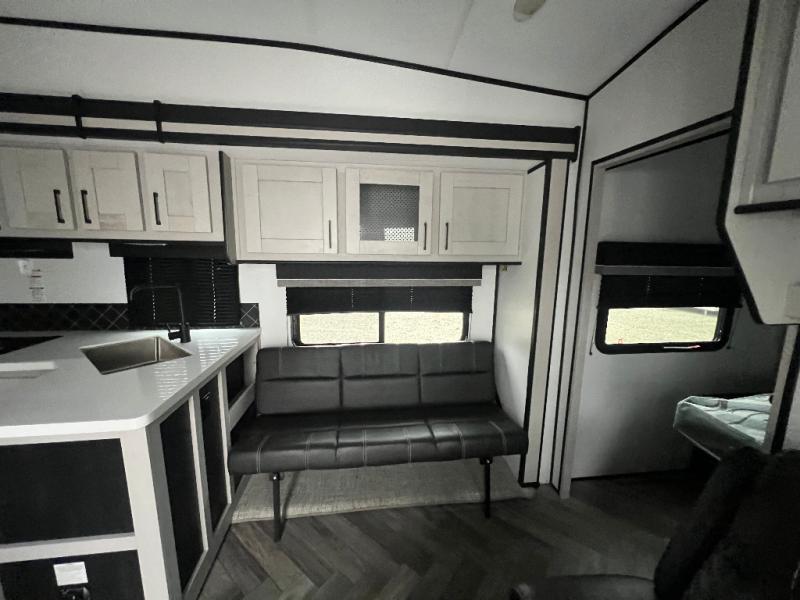 This toy hauler is packed full of amenities! From the power queen bed above an opposing sofa with a dinette to the single booth dinette, the two sofas, and the front private bedroom with a king bed. There is also a full bathroom for you to freshen up in each morning, a 8 cu. ft. refrigerator to keep your orange juice cold, and a three burner range to fry up some bacon. The dual entry doors are convenient, and the 19' electric awning will keep you protected whether rain or shine!