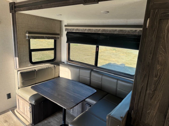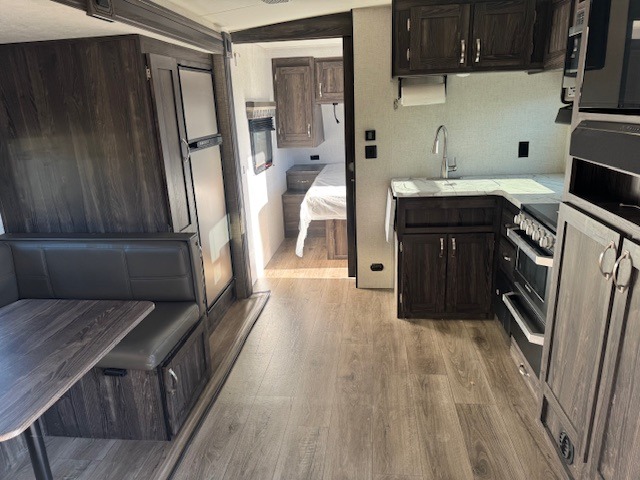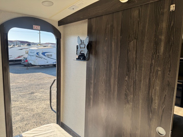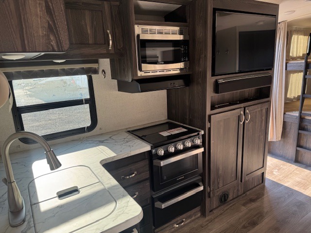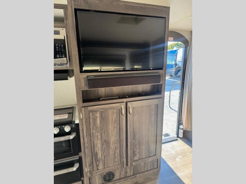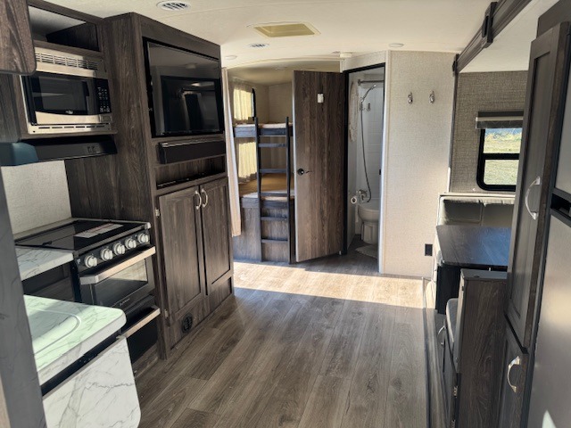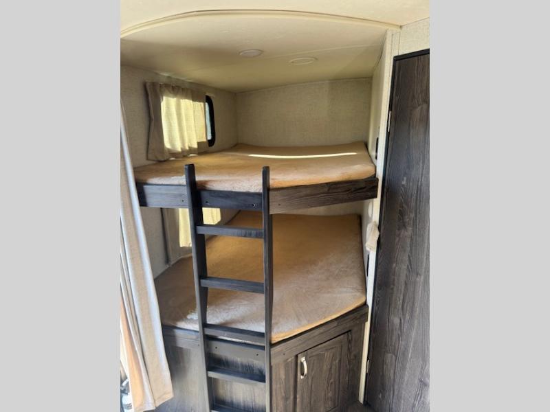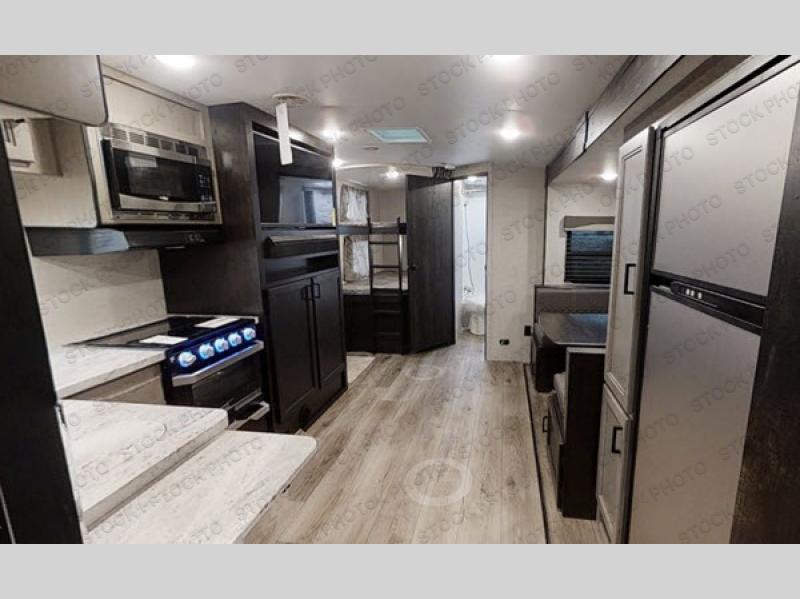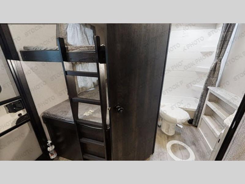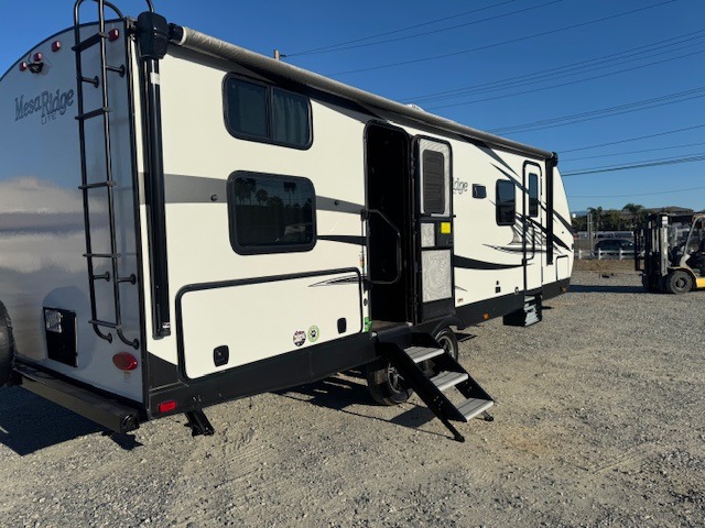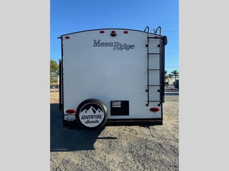 You are going to love spending time in this Mesa Ridge Lite travel trailer! There is a large slide with a U-shaped dinette, pantry, and 8-cubic foot refrigerator, and since the dinette sits across from the 39" TV, you can sit back and enjoy your shows. Beneath the TV is a second pantry, and that will be very convenient for all of your snacks and cereals. When you enter this trailer through the main entry door, you will find a closet to your right so that you can keep your jackets hung up, and there is a second exterior entry door that leads into the front private bedroom so that you can go for that early morning run without waking up your kids who are sleeping on the double-size bunks next to the other entry door.