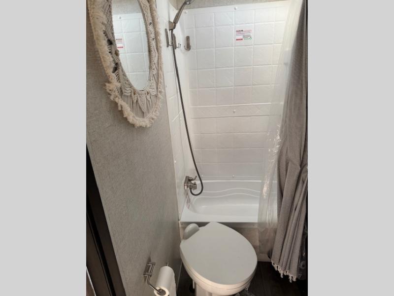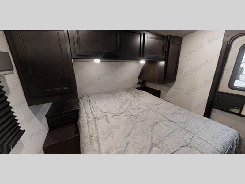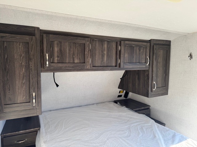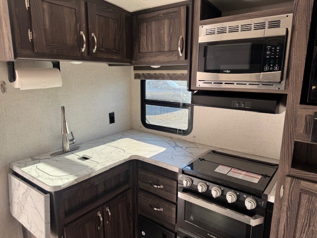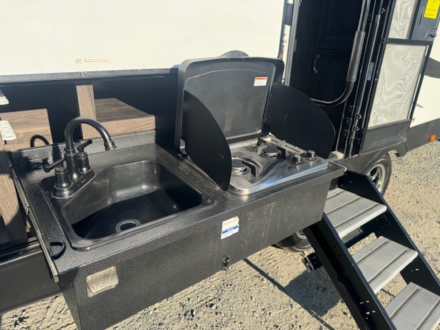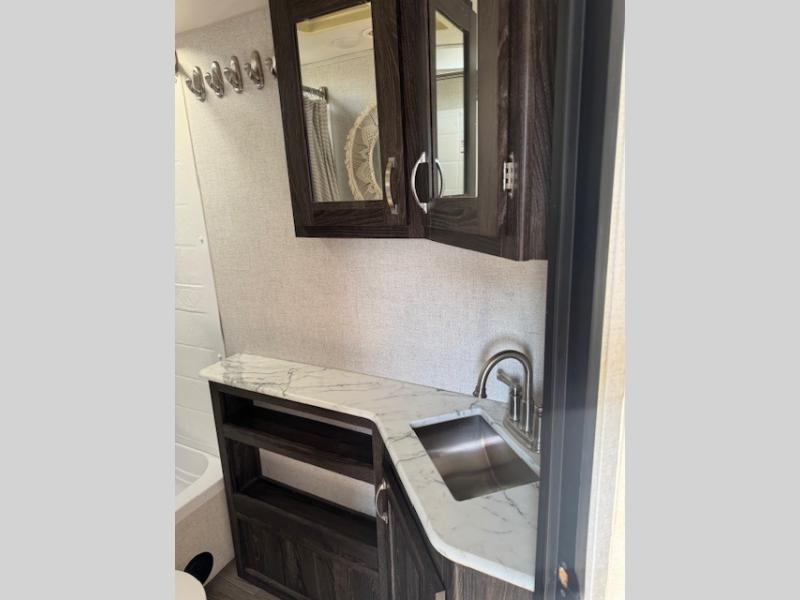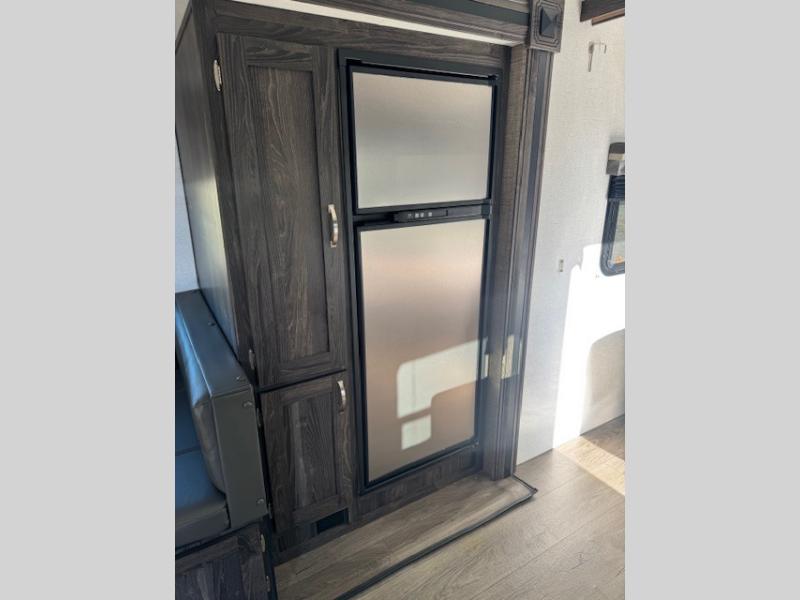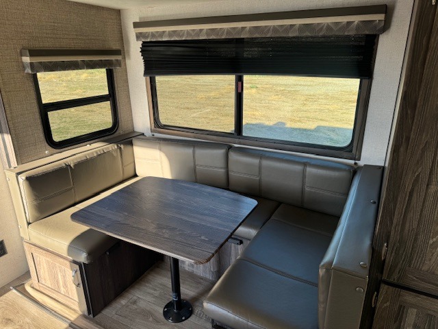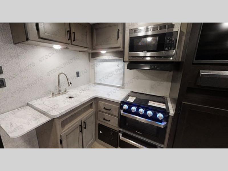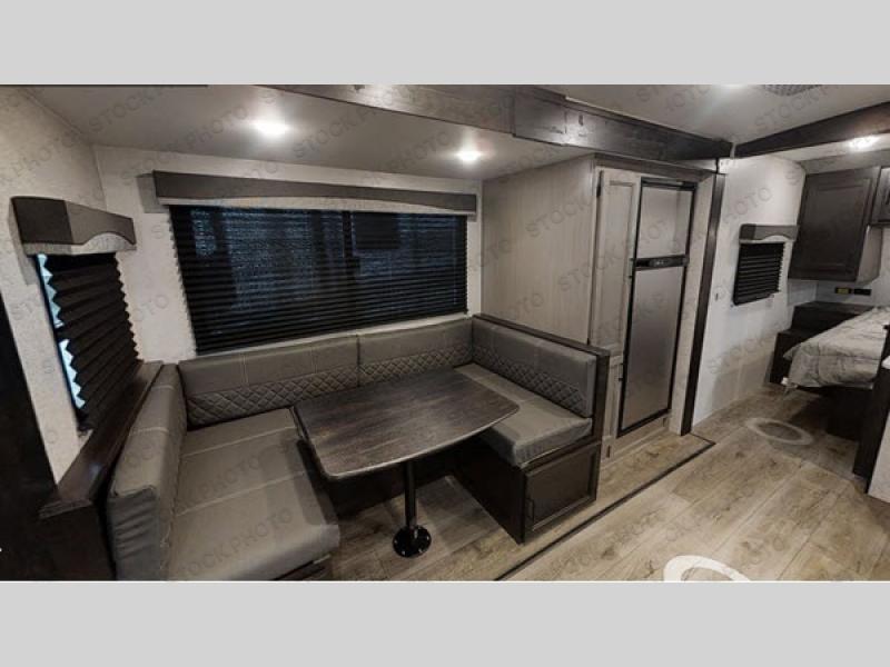 You are going to love spending time in this Mesa Ridge Lite travel trailer! There is a large slide with a U-shaped dinette, pantry, and 8-cubic foot refrigerator, and since the dinette sits across from the 39" TV, you can sit back and enjoy your shows. Beneath the TV is a second pantry, and that will be very convenient for all of your snacks and cereals. When you enter this trailer through the main entry door, you will find a closet to your right so that you can keep your jackets hung up, and there is a second exterior entry door that leads into the front private bedroom so that you can go for that early morning run without waking up your kids who are sleeping on the double-size bunks next to the other entry door.