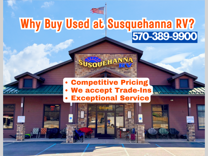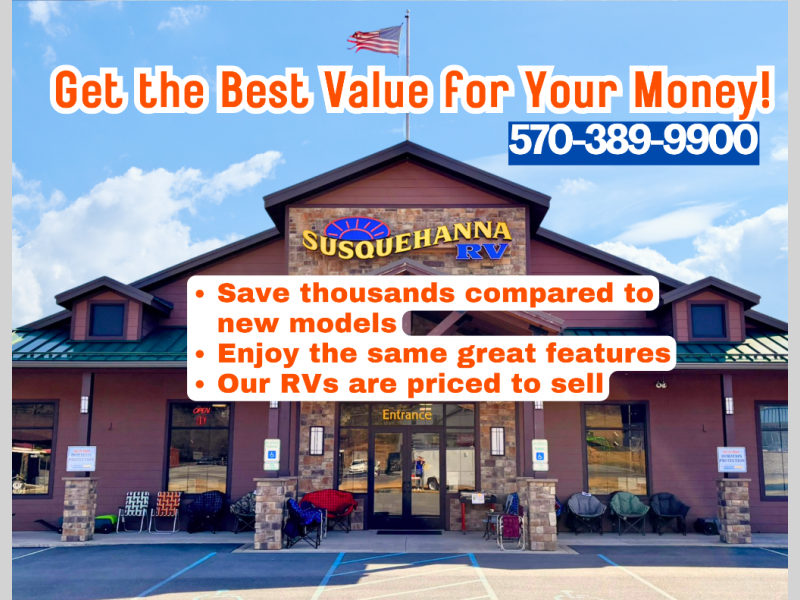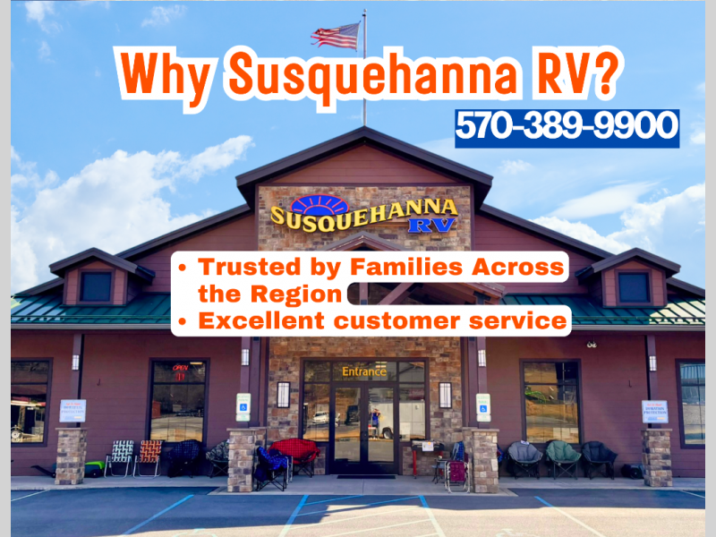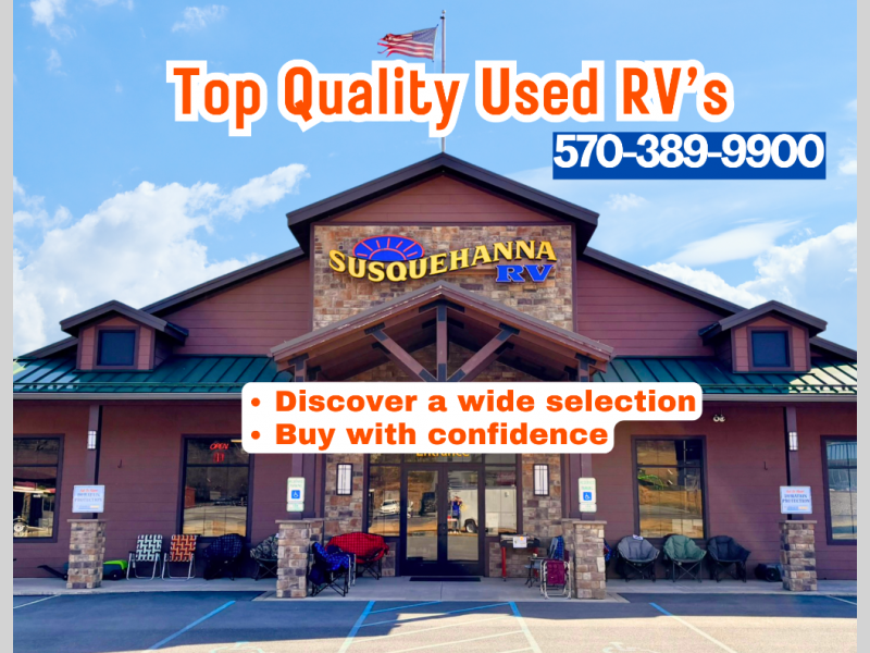 We are a premier dealer for all camping needs. If you are traveling from anywhere in Pennsylvania we have you covered. We service York, Harrisburg, Lancaster, Reading, Lewisburg, Williamsport, Philadelphia, Pittsburgh, State College, Lewistown, Bloomsburg, Allentown, Scranton, Wilkes-Barre, Lebanon, Manheim, Duncannon, Shamokin Dam, Elysburg, Danville, Sunbury, Berwick, Mt. Carmel, Hershey, Pottsville, Frackville, Centralia, Wilkes -Barre, Scranton, Long Pond, and more. In New Jersey, Delaware, West Virginia, New York, or the Maryland regions; we are the RV dealer to see. Please browse our huge RV inventory today at WWW.SUSQRV.COM.