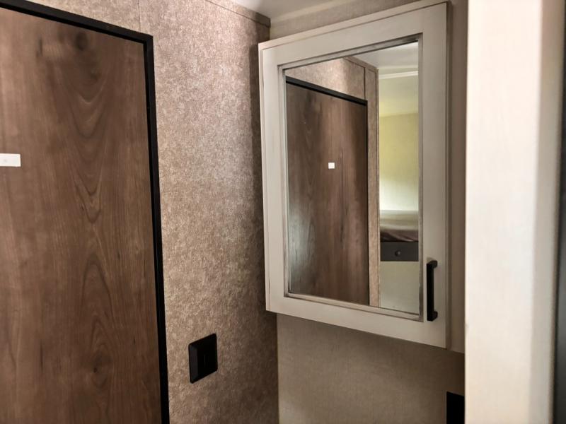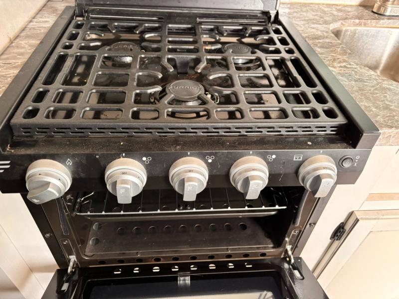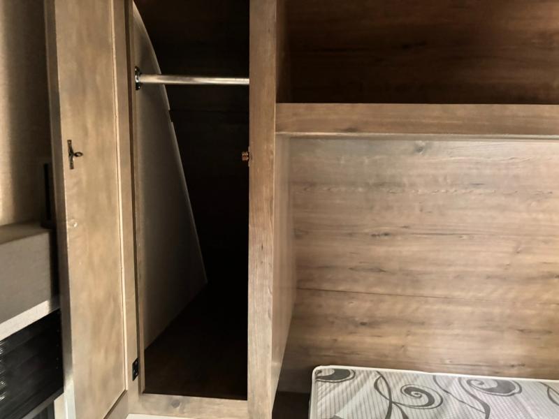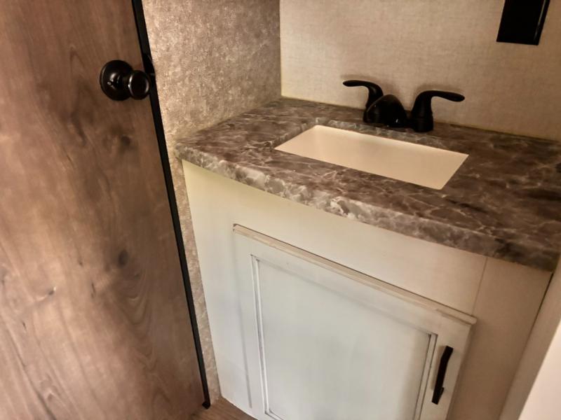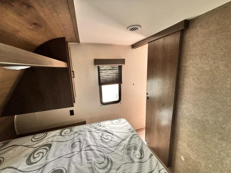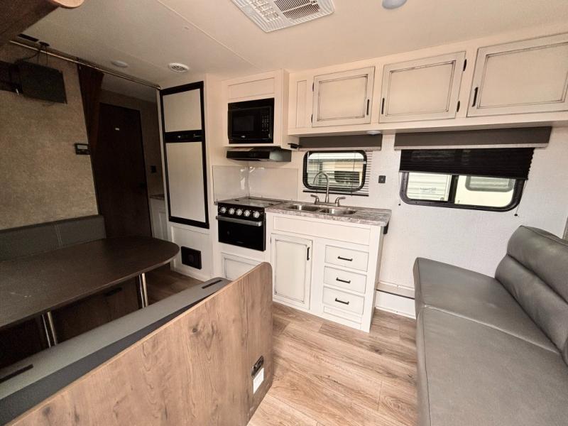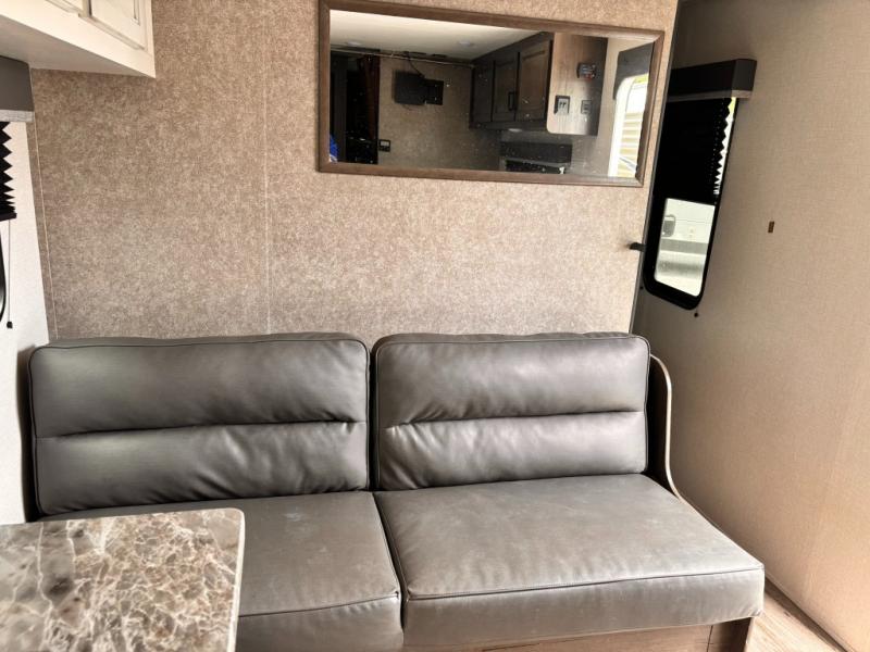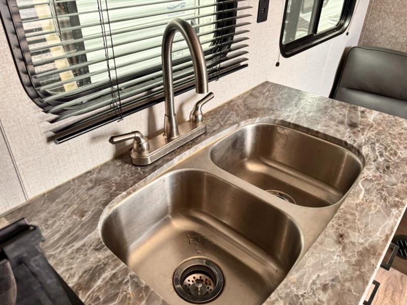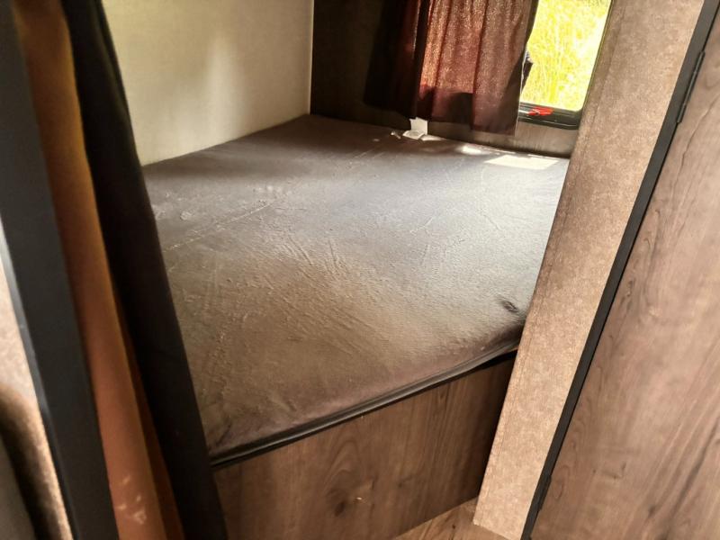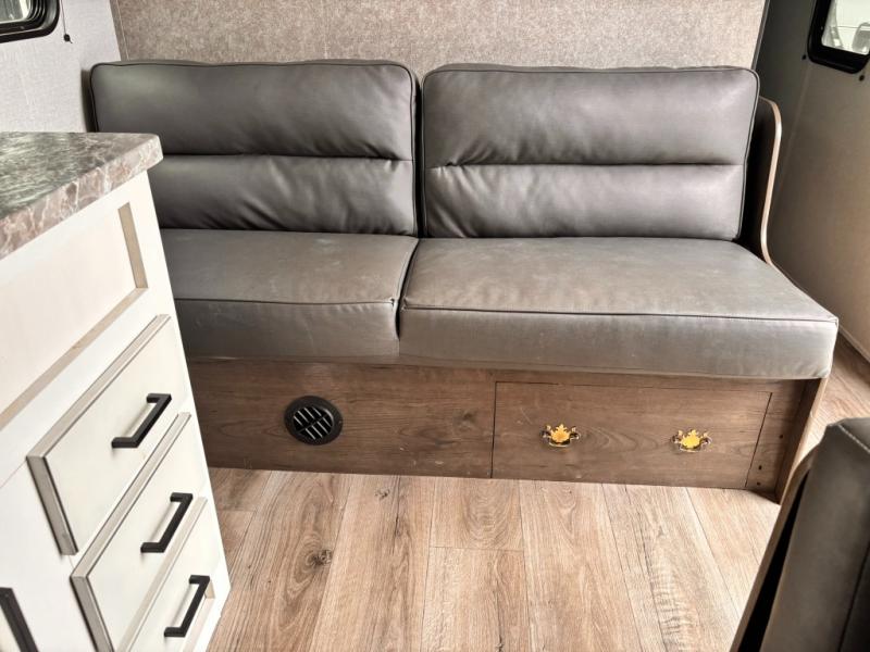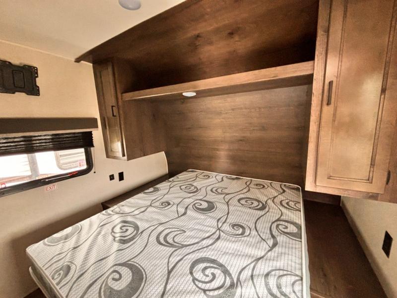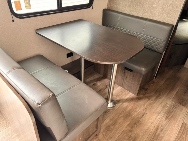 Whether you're camping with family or a group of friends, you will love every minute spent in this travel trailer. The double size bunks are perfect for the kids or the adults since they have a 600 lb. capacity, and the rear corner bath is right next to the bunks for convenience. If it's raining outside, get comfortable on the jackknife sofa and watch a show on the LED TV, or play a board game at the booth dinette. You may want to take a rest, and the front private bedroom will be perfect for that. This model also includes a lighted pass-through storage so you can easily grab your fishing poles for night fishing!