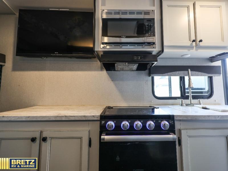 - Exterior: Power awning with LED lights, exterior speakers, and a 30-amp service