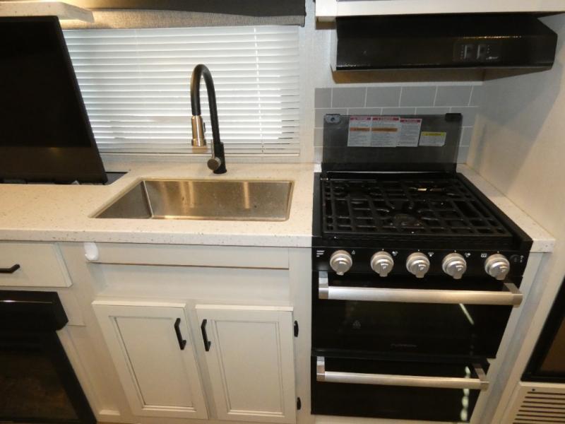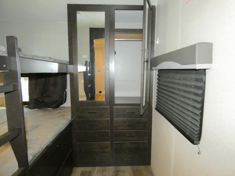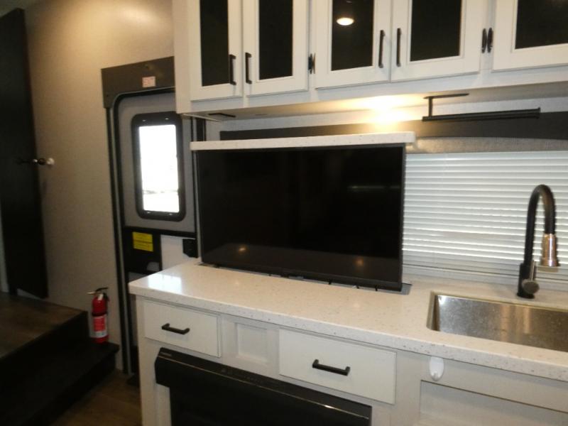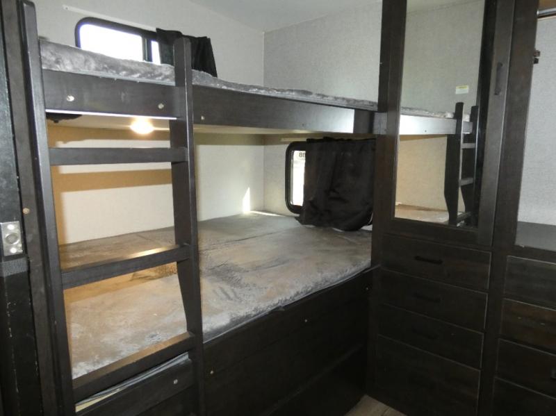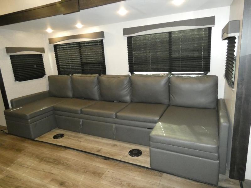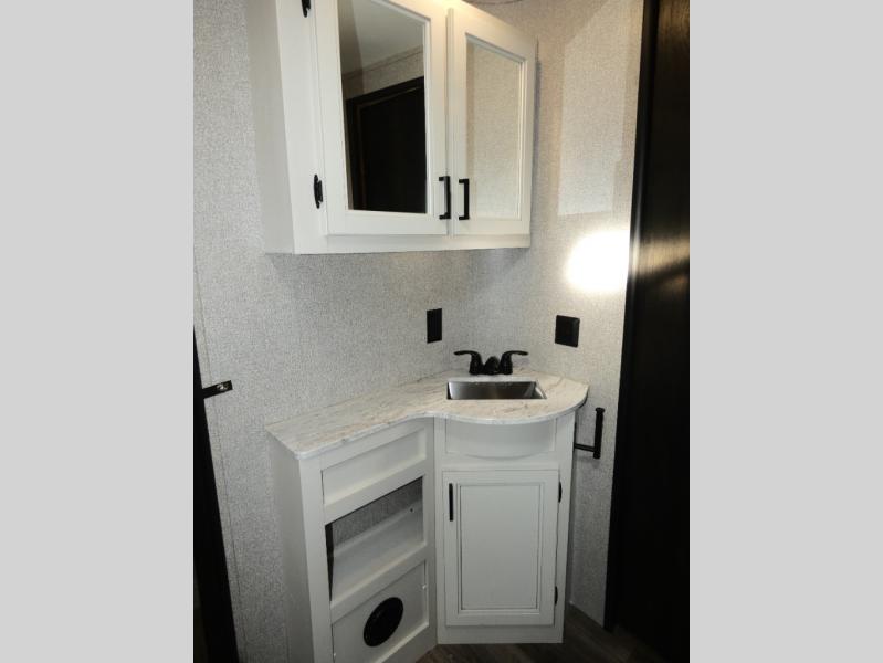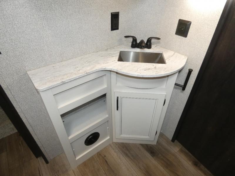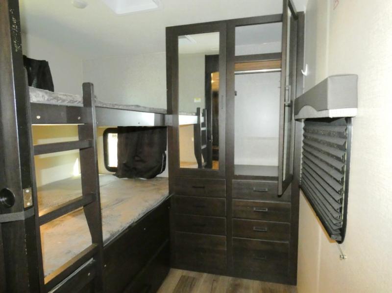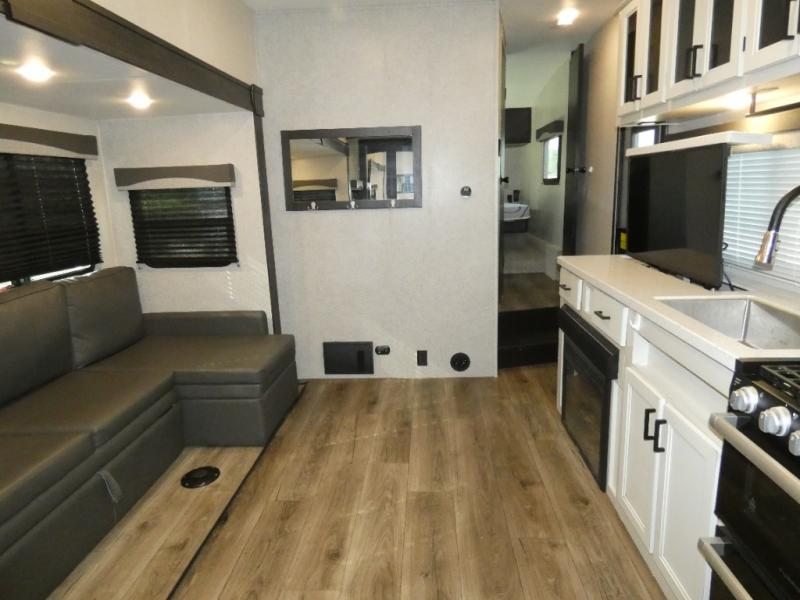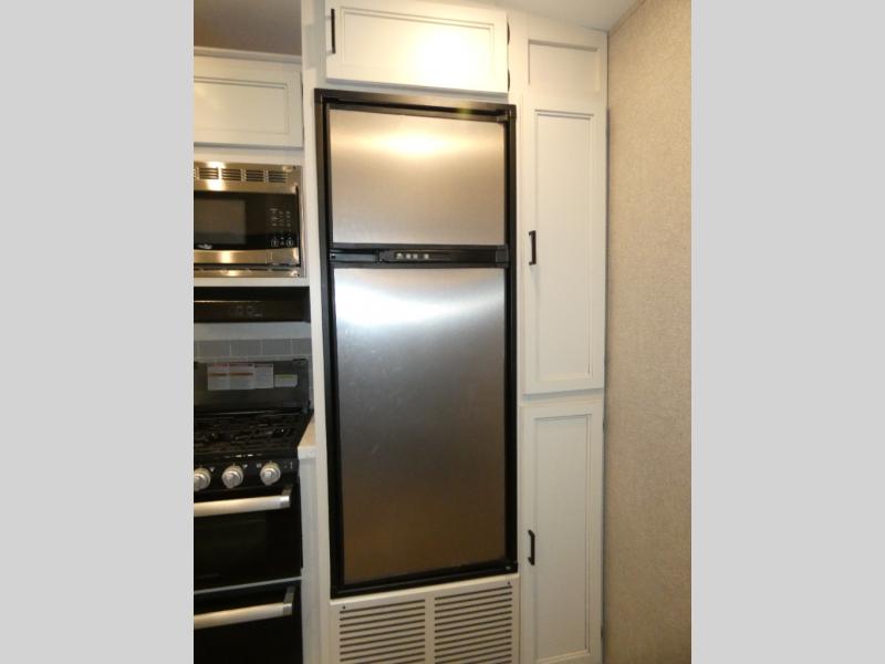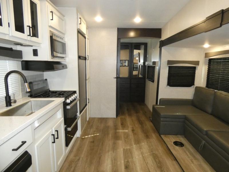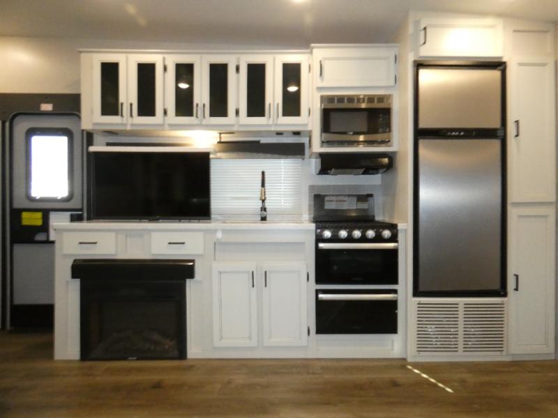 You will be such a happy camper in this Open Range Light fifth wheel! With two private sleeping areas, a master suite up front and a bunkhouse in the back, you will be able to spend every night in comfort, and the large slide in the main living area makes it easy for all of you to come together to relax. There are many amenities in the kitchen so that you can prepare a delicious meal. You could use the 17" gas oven with three-burner range to create a full dinner, and the microwave can be used to heat up leftovers in a pinch. Store your juice in the 8-cubic foot refrigerator, and since the LED HDTV with lift and fireplace are included within the kitchen area, you will have such an enjoyable time making meals.