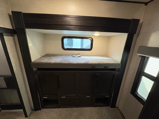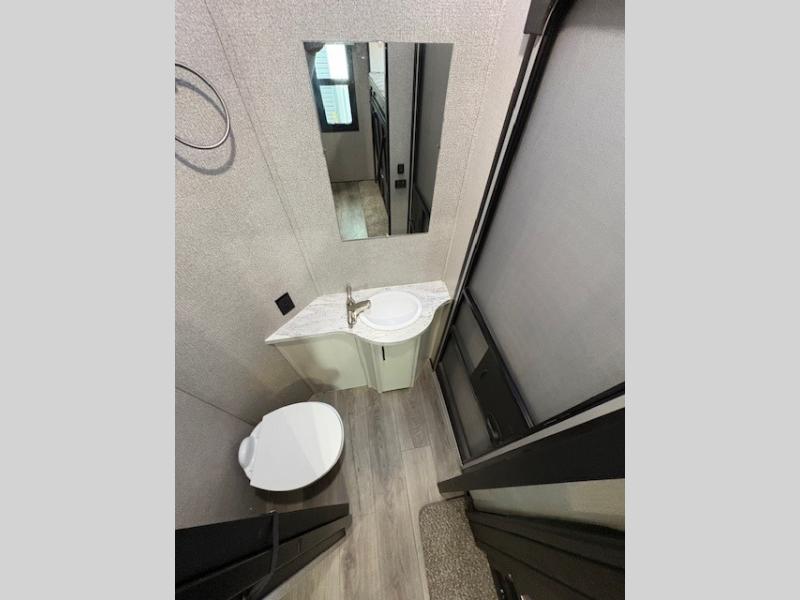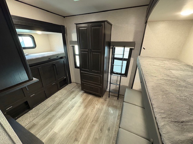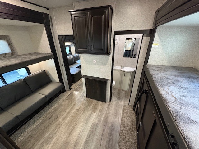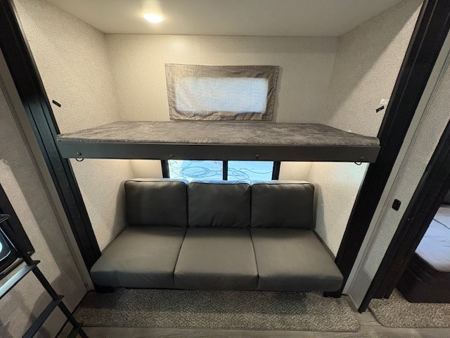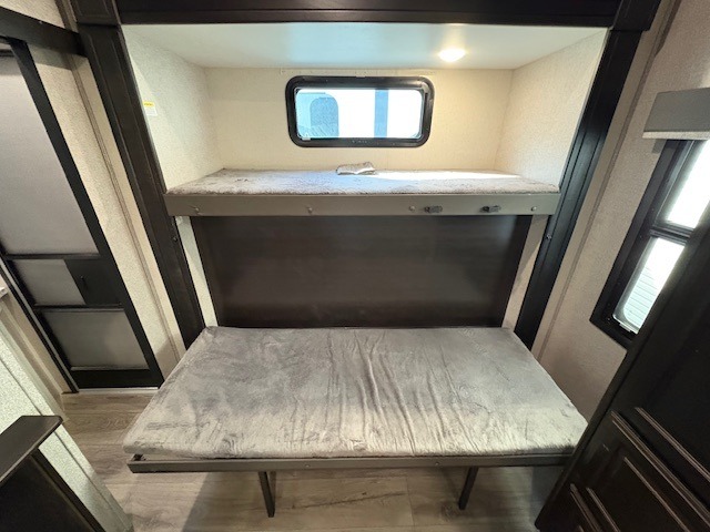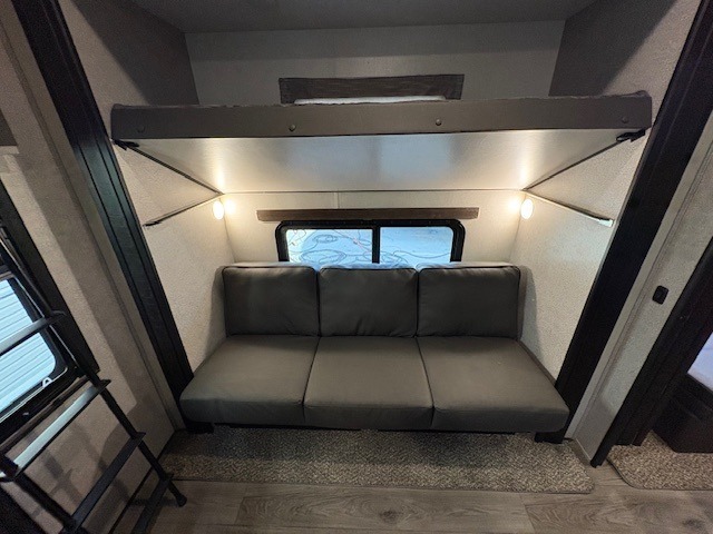 The whole gang can head to the campsite in this Open Range fifth wheel! The front master suite has a comfortable queen bed with nightstands on either side, a dresser, a large closet, and an area prepped to add the optional washer and dryer so that your clothes can look their best the entire time. The dual-entry bathroom has a linen closet to store your towels and an entrance into the private bedroom. The kitchen island will make your meal prep easier, and the free-standing table with chairs is the perfect place to enjoy your meals as well as play a few card games. The rear bunkhouse has two sets of bunk beds, a wardrobe, an entertainment center with a flip-up desk for you to get some work done while away, and its own half bathroom!