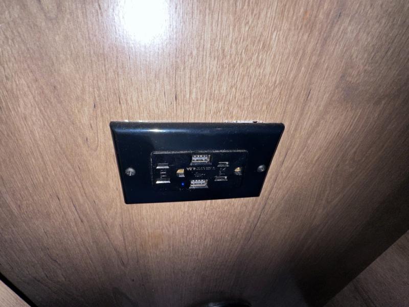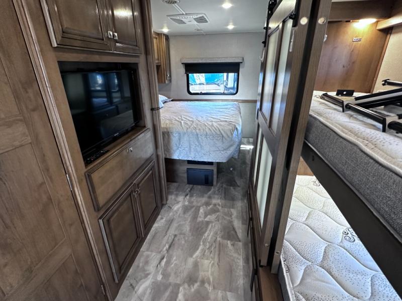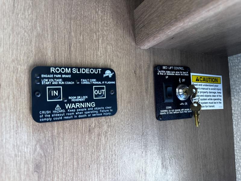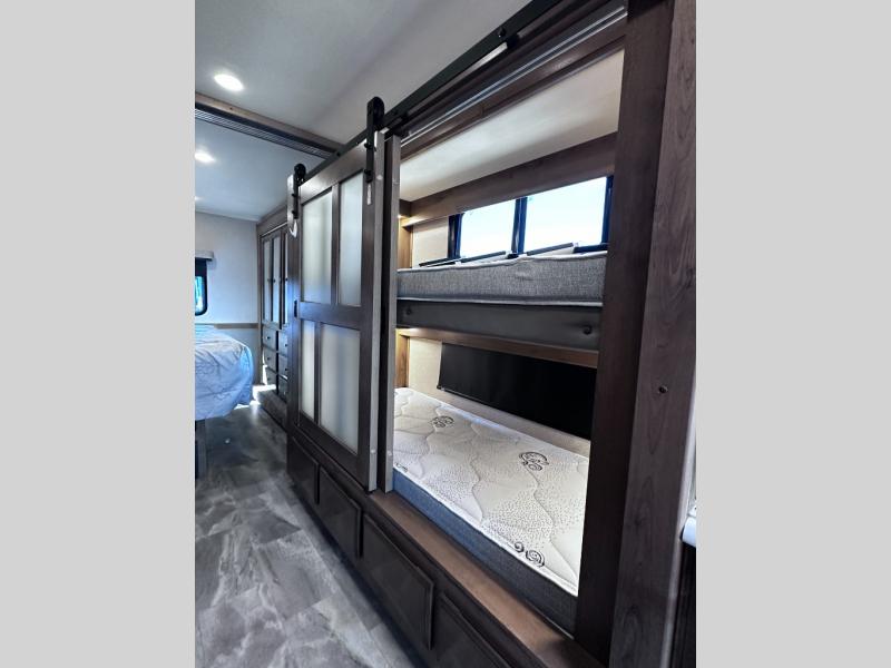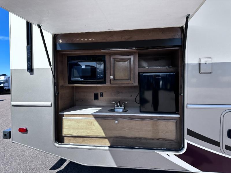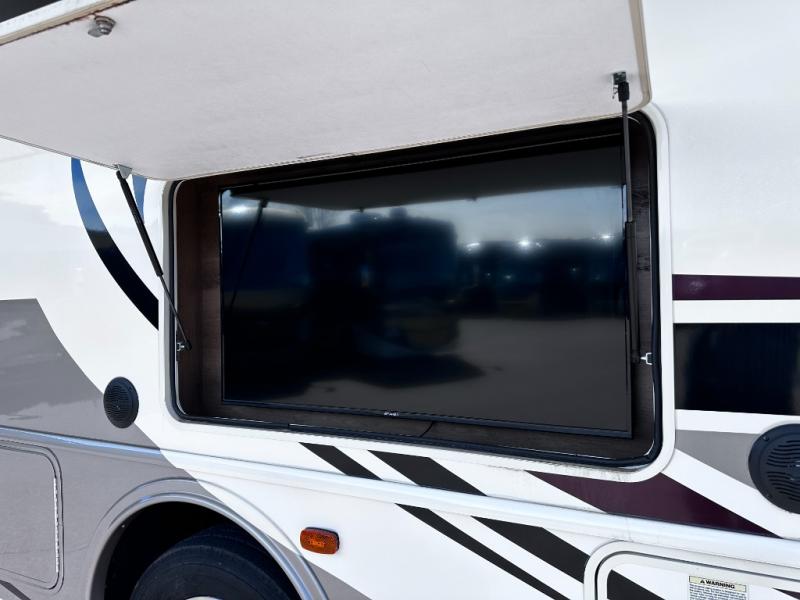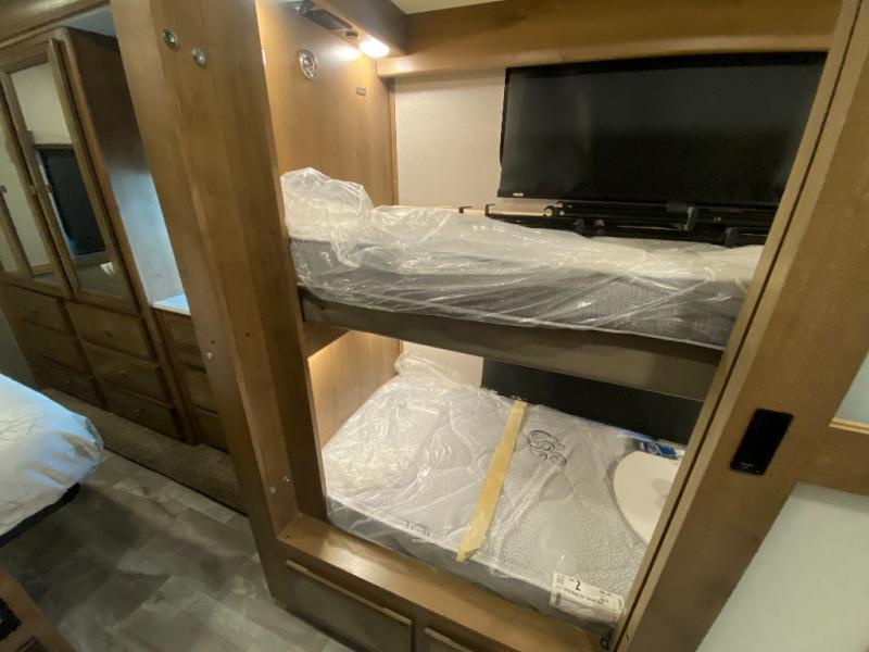 If you've been looking for a motorhome that can sleep all the grandkids, take a look at this unit with bunk beds, plus a Hide-a-Loft drop-down queen bed! There is even a 32" bunk TV so the kids can watch their morning cartoons. The full bath is conveniently located right across the bunks for nighttime restroom breaks, and the full-wall slide opens up the whole coach so no one will trip over the napping dog on the floor. Whether you're making a casserole in the oven, or heating up leftovers in the exterior microwave, you will easily be able to keep your crew fed and happy. Spending time outdoors will be enjoyable with the exterior entertainment center and the legged electric awning with LED lights!
