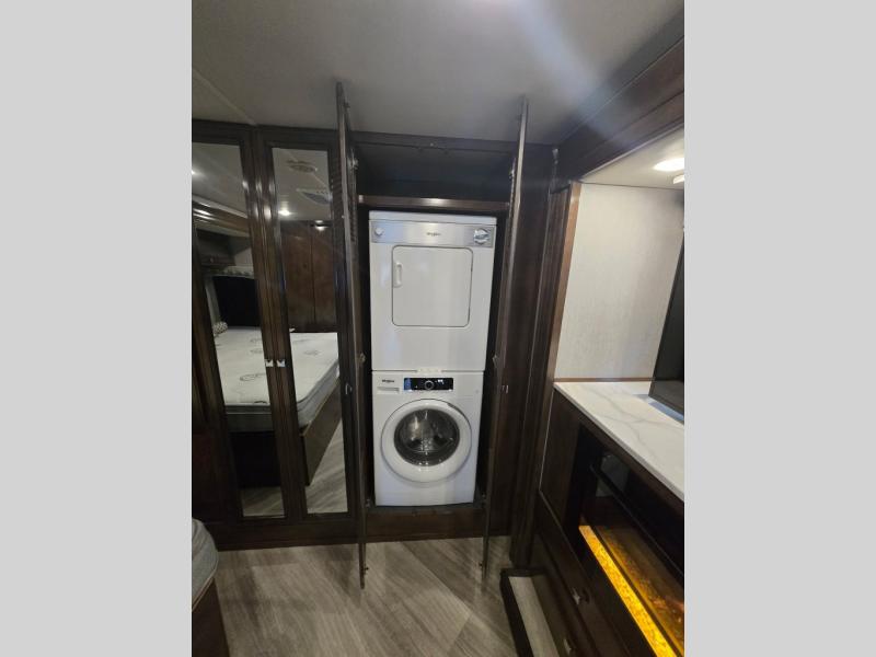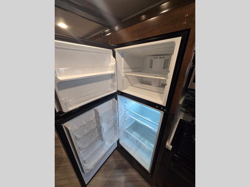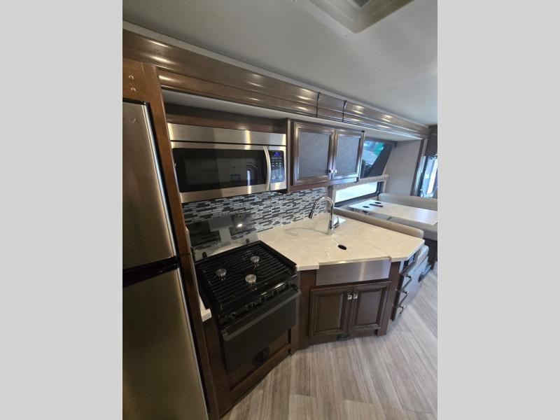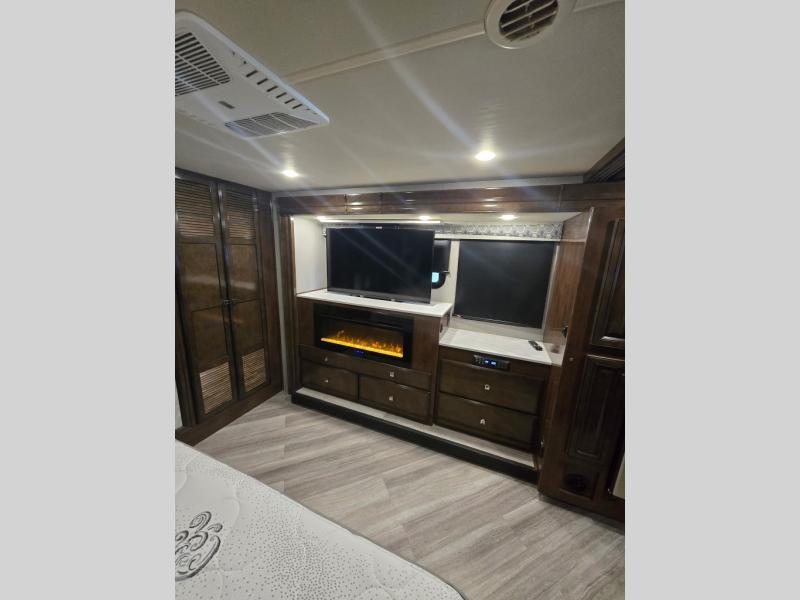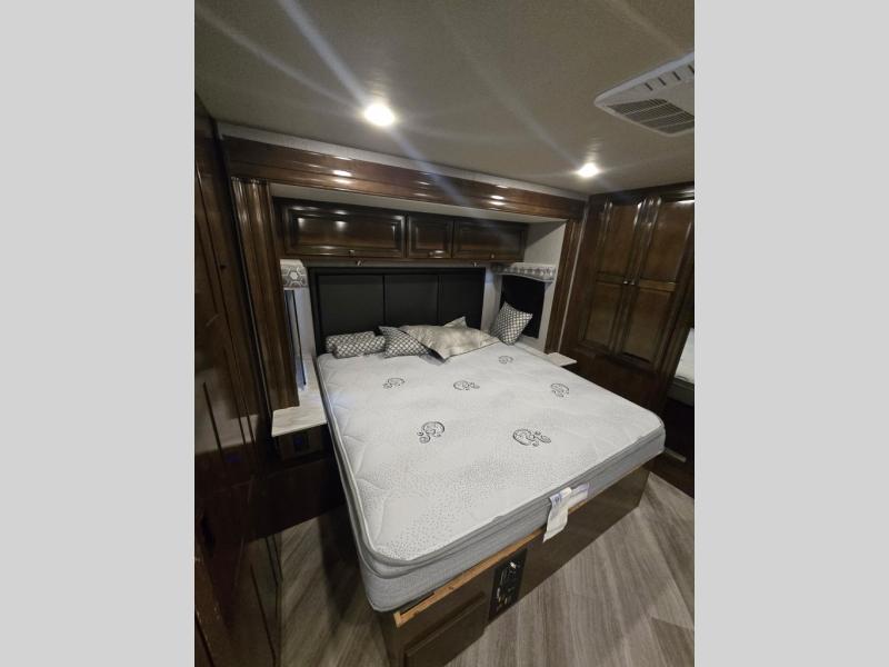 You will certainly have to check out the great class and luxury that comes on this Invicta Class A gas motorhome! This coach is completely full of amazing features, and you will find extra interior living space from the full-wall slide on the driver's side and the RV king bed slide in the rear private bedroom. Creating all of your family's favorite dinnertime meals will be a breeze with the exceptional kitchen amenities, like the stainless steel residential refrigerator, convection microwave, stainless steel farmhouse sink, and three-burner cooktop. And to top it all off, you will have plenty of entertainment choices for your late-night gatherings with the bedroom TV and fireplace, the living room 40" LED Smart TV, and the exterior 50" LED TV.