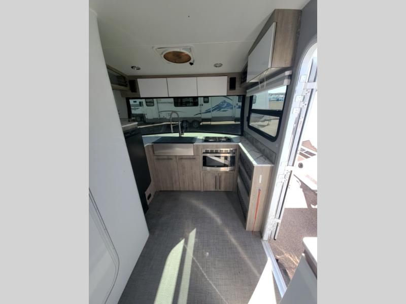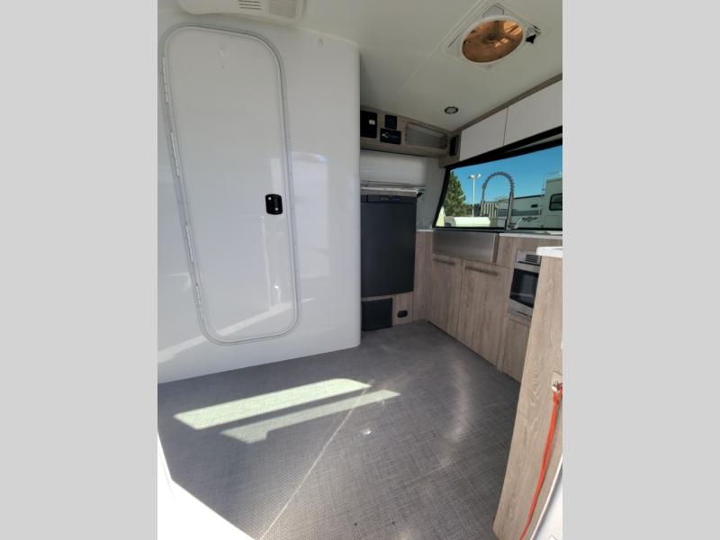 With any Sol travel trailer by inTech RV you will find strong, durable construction consisting of lightweight aluminum that is easier to tow and resists rust, water, and dents. The Tilt-Forward Design creates more space inside so you can stretch out, and the panoramic windshield gives a great view of the mountains, ocean, or forest! The elegant interior features tinted windows with shades, Infinity woven flooring, and a stainless steel cooktop and microwave. You will stay comfortable year around since these models include a 13.5 BTU A/C and a 16K BTU furnace. The optional Rover Package can also be added that features rugged decals, off-road tires with a 3" lift, two different color choices to choose from, plus more!