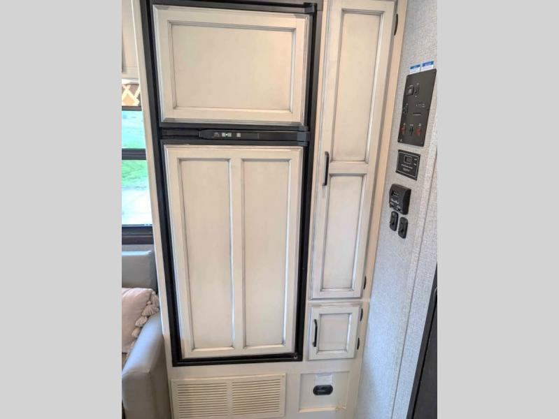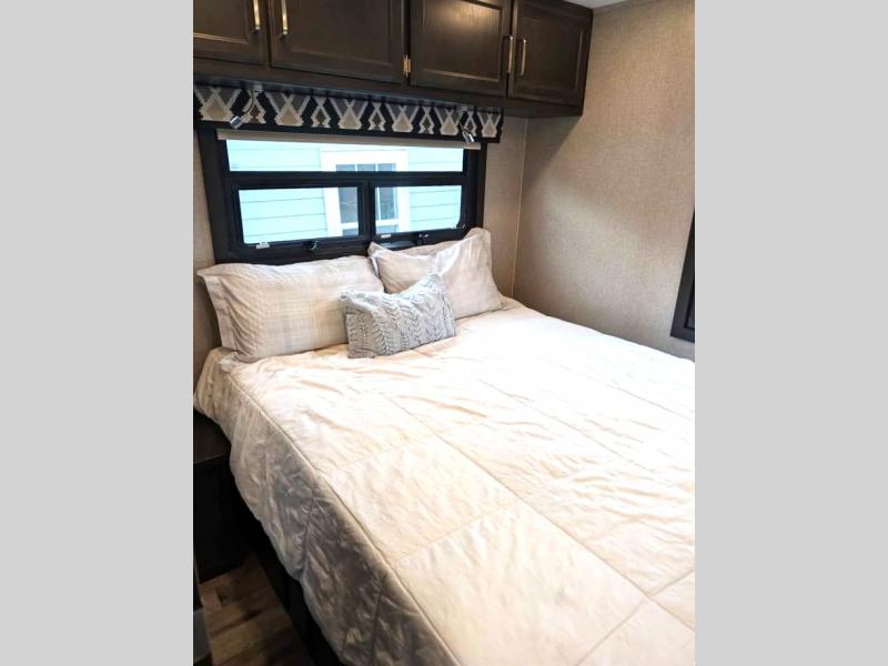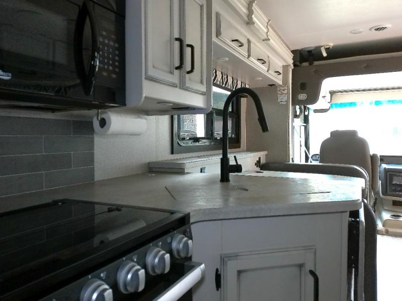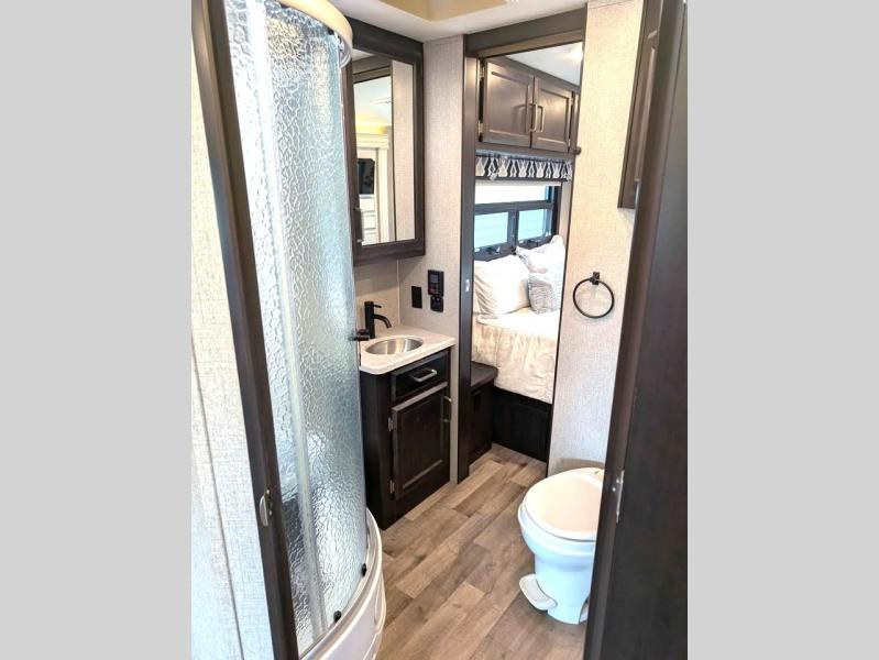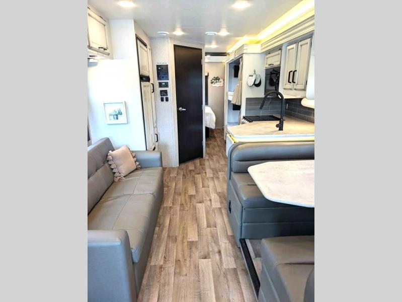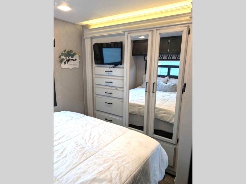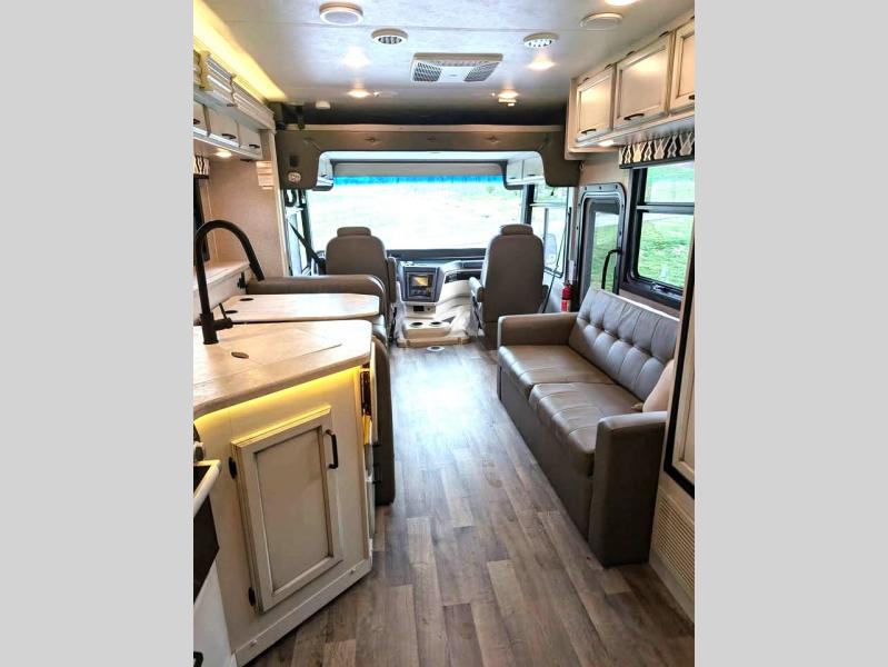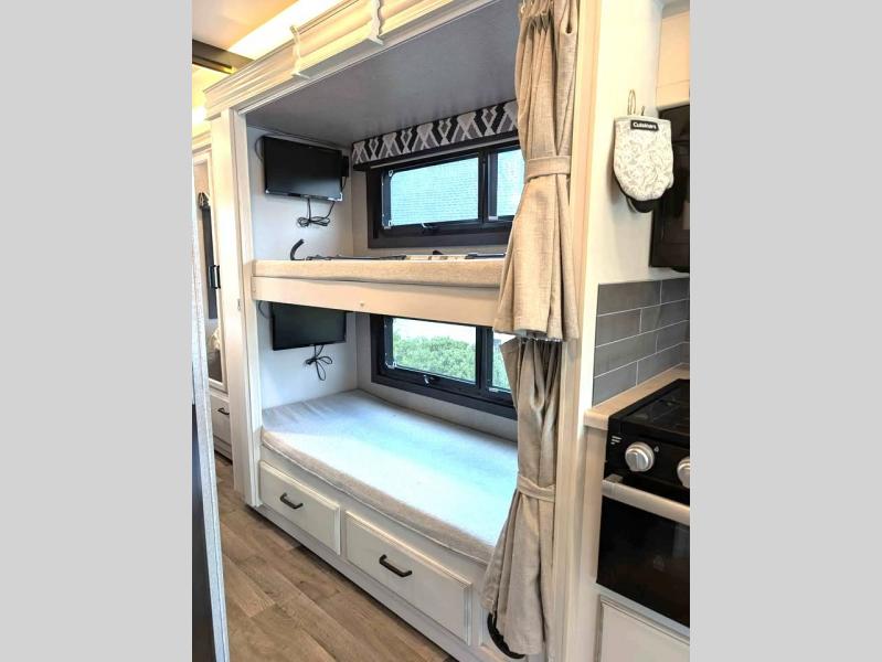 You and your family can travel to a local sporting event with ease or a long vacation in this motorhome. There is sleeping space for six to eight if you decide to utilize the furniture and if you added the drop down overhead bunk option. The kids will love their own bunk bed with a TV while you sleep in privacy in the rear bedroom with access to the full bathroom. The second entry into the bathroom is near the bunks and kitchen area for easy access for all. You can make warm meals to enjoy at the legless dinette table or while sitting on the sofa, and the captain's chairs with a cockpit table. The 39" TV on a lift offers entertainment as well as the exterior LED TV under the 23' electric awning with LED lights.