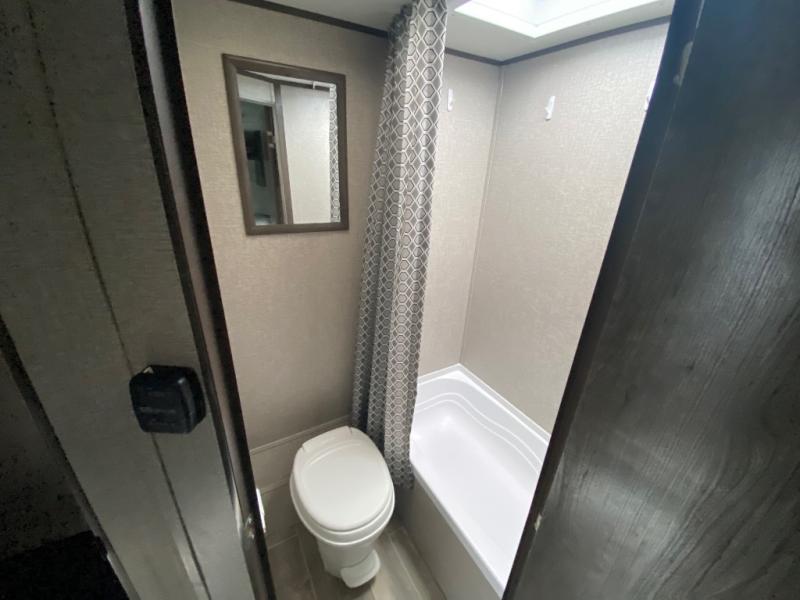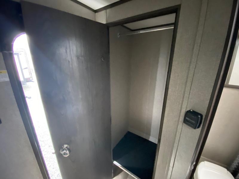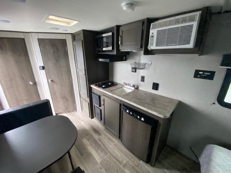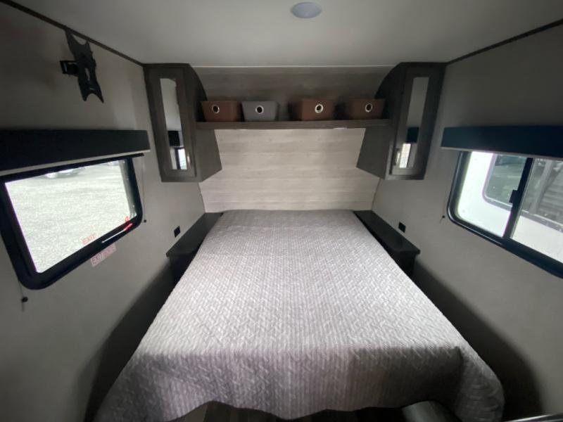 You will love waking up each morning on the walk-around RV queen bed in this Jay Flight SLX 7 travel trailer. The privacy curtain will create a semi-private bedroom so that you can get dressed discretely. Once you've made breakfast on the two-burner cooktop, get freshened up in the private bathroom before heading out to find a trail. When you return, you can hang your jacket in the large entryway wardrobe and grab the cards to play a game at the booth dinette. This model also includes a pantry for snacks, overhead compartments for your belongings, plus outside storage for charcoal and tackle boxes!