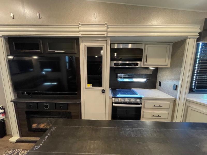 This unique mid-living room fifth wheel features a huge, rustic center bar with a barstool on either side! You will also find in the living room a hide-a-bed sofa and a theater seat across from the entertainment center with a LED fireplace and a 50" HDTV with a JBL sound system, plus a ceiling fan above it all to keep the air circulating from the dual Whisper Quiet air conditioners. The rear kitchen layout makes it easy for you to whip up home cooked meals and store any leftovers in the 21 cu. ft. residential refrigerator with a 1200W inverter or you can switch it out for the optional 13 cu. ft. gas/electric refrigerator, plus there is an outside kitchen if you prefer to breathe in some fresh air while you cook. Wind down your nights by taking a hot shower in the shower with a seat, and then head to the front private bedroom to change into your pajamas that are stored in either the chest or the full wall wardrobe which has shelving and an area prepped to add the optional washer and dryer!