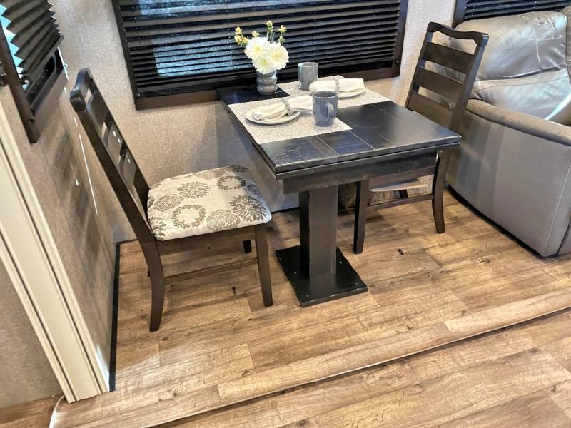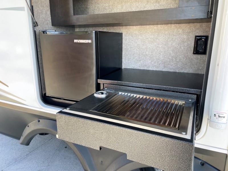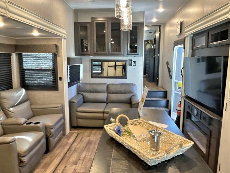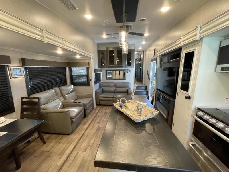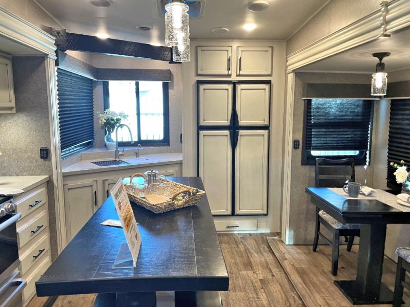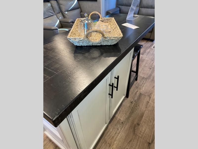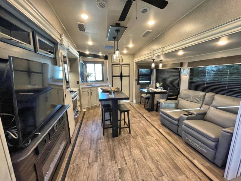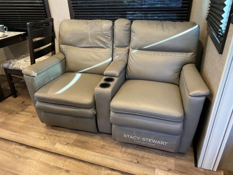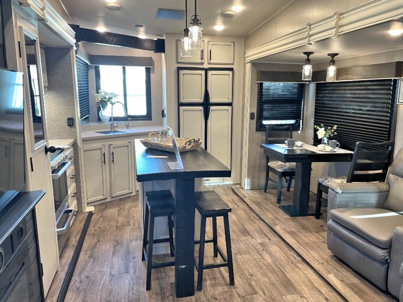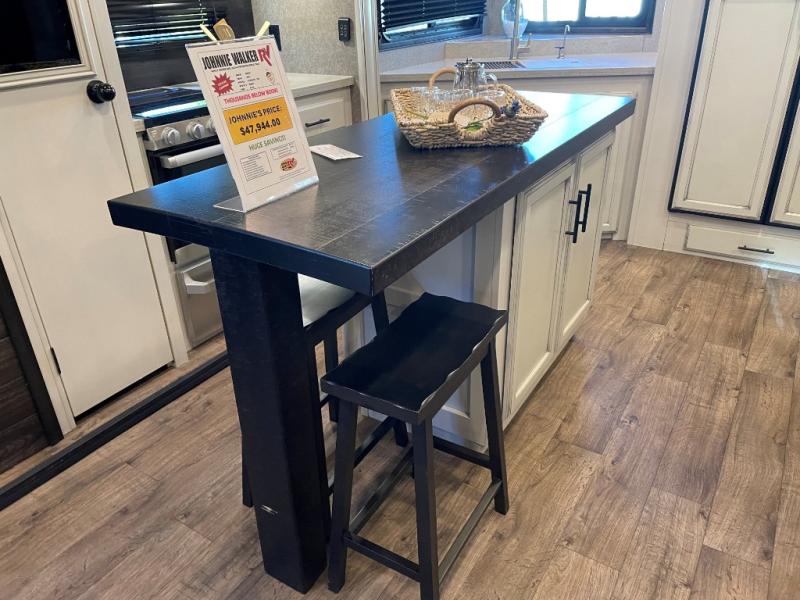 This unique mid-living room fifth wheel features a huge, rustic center bar with a barstool on either side! You will also find in the living room a hide-a-bed sofa and a theater seat across from the entertainment center with a LED fireplace and a 50" HDTV with a JBL sound system, plus a ceiling fan above it all to keep the air circulating from the dual Whisper Quiet air conditioners. The rear kitchen layout makes it easy for you to whip up home cooked meals and store any leftovers in the 21 cu. ft. residential refrigerator with a 1200W inverter or you can switch it out for the optional 13 cu. ft. gas/electric refrigerator, plus there is an outside kitchen if you prefer to breathe in some fresh air while you cook. Wind down your nights by taking a hot shower in the shower with a seat, and then head to the front private bedroom to change into your pajamas that are stored in either the chest or the full wall wardrobe which has shelving and an area prepped to add the optional washer and dryer!