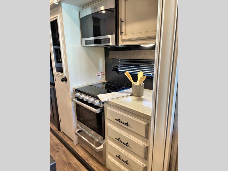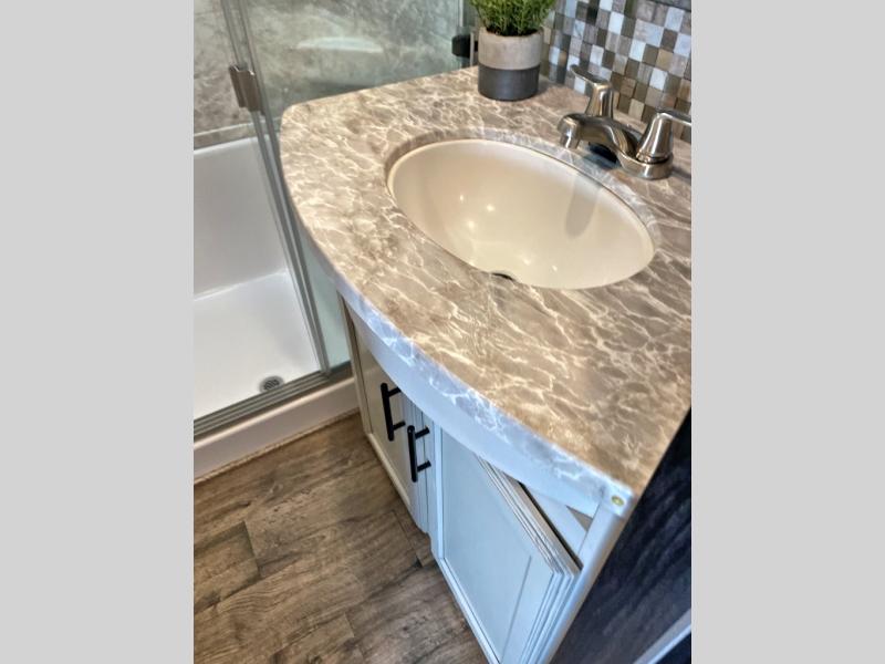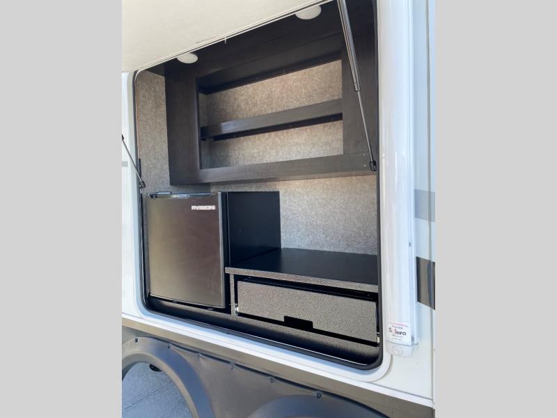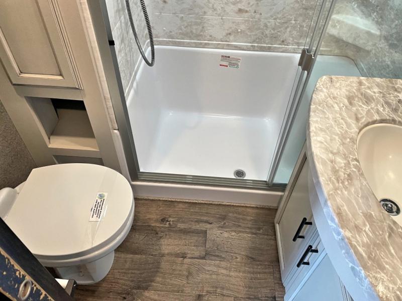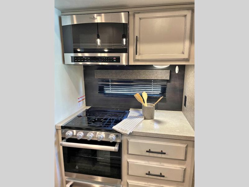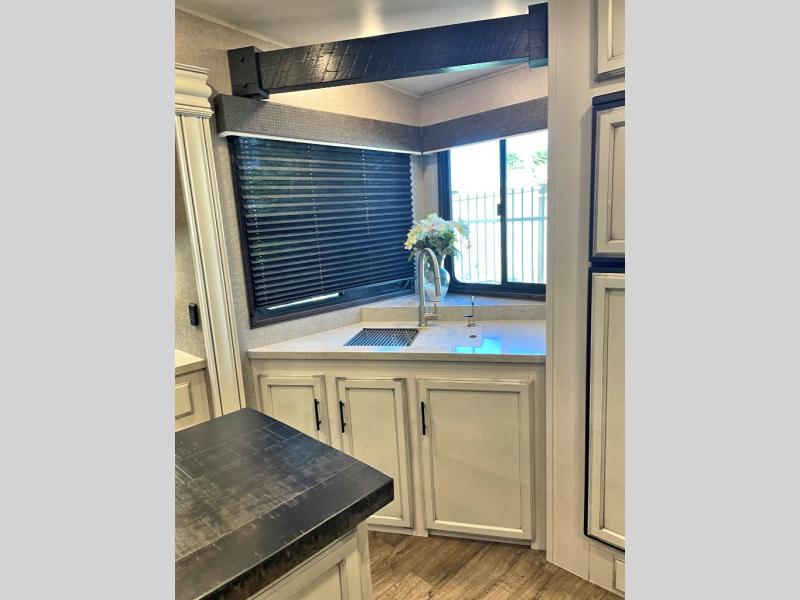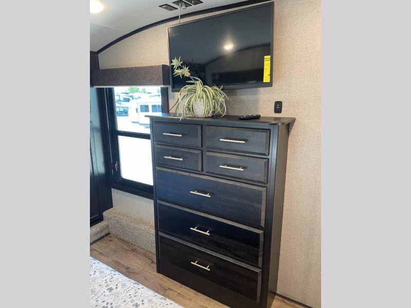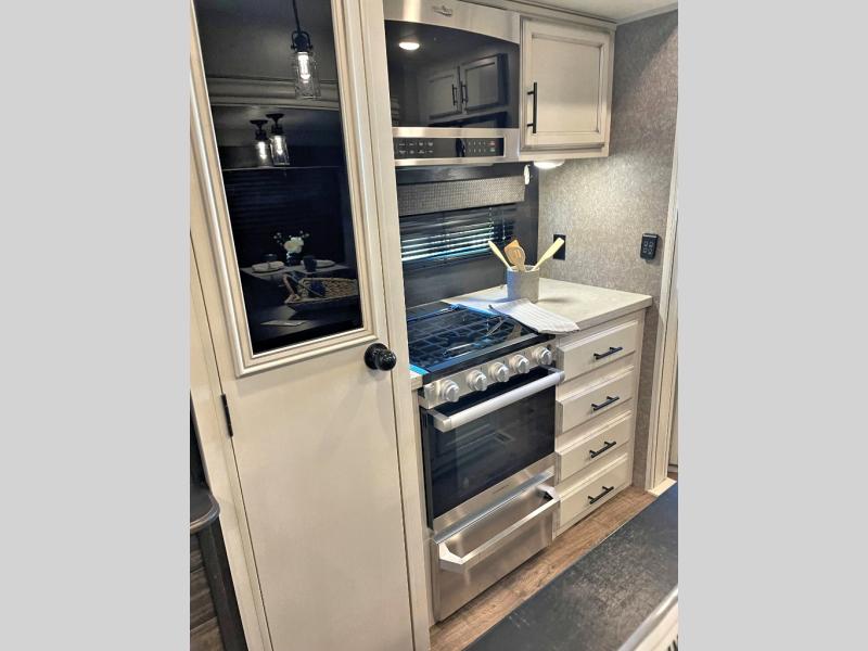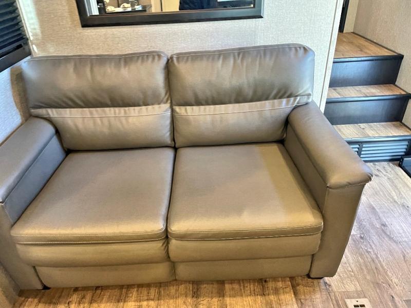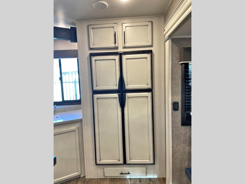 This unique mid-living room fifth wheel features a huge, rustic center bar with a barstool on either side! You will also find in the living room a hide-a-bed sofa and a theater seat across from the entertainment center with a LED fireplace and a 50" HDTV with a JBL sound system, plus a ceiling fan above it all to keep the air circulating from the dual Whisper Quiet air conditioners. The rear kitchen layout makes it easy for you to whip up home cooked meals and store any leftovers in the 21 cu. ft. residential refrigerator with a 1200W inverter or you can switch it out for the optional 13 cu. ft. gas/electric refrigerator, plus there is an outside kitchen if you prefer to breathe in some fresh air while you cook. Wind down your nights by taking a hot shower in the shower with a seat, and then head to the front private bedroom to change into your pajamas that are stored in either the chest or the full wall wardrobe which has shelving and an area prepped to add the optional washer and dryer!