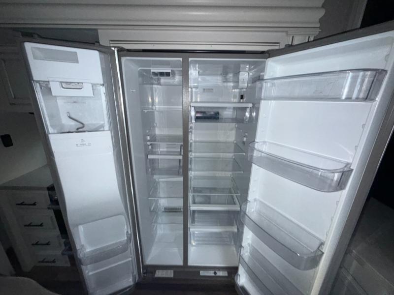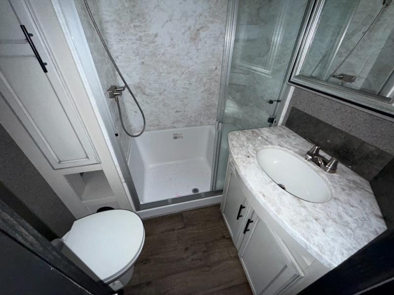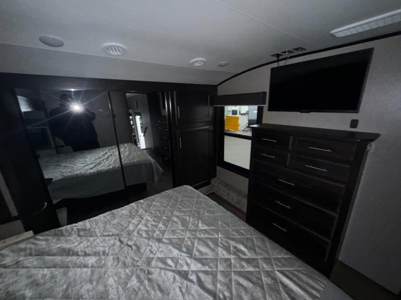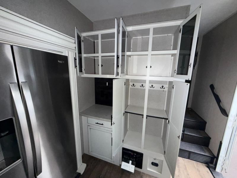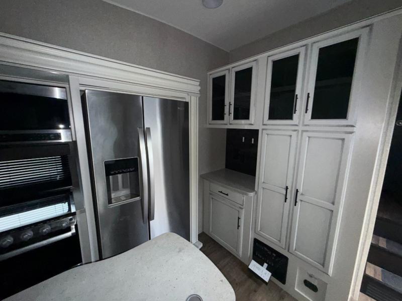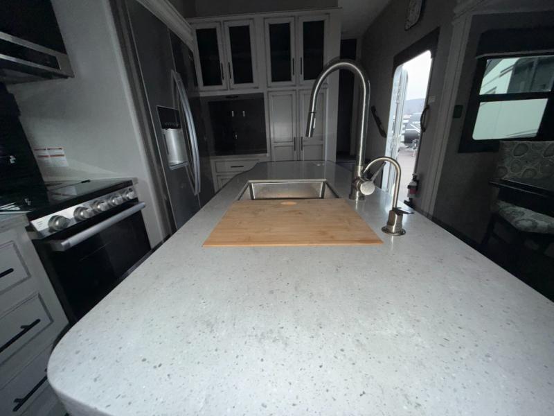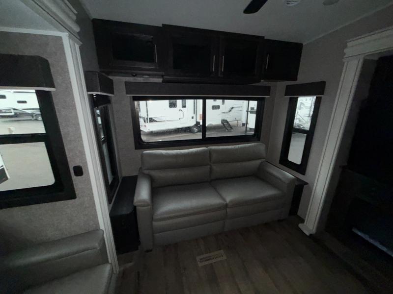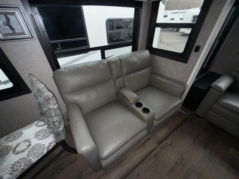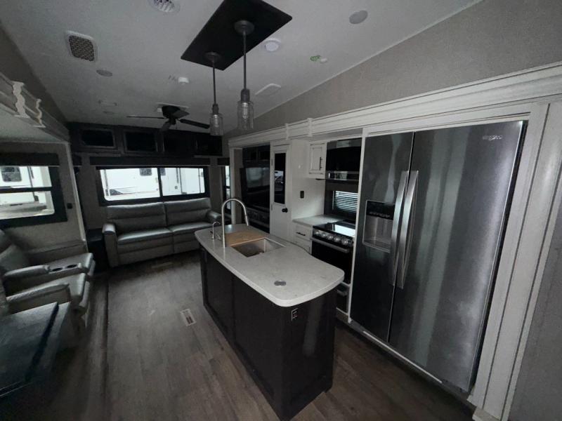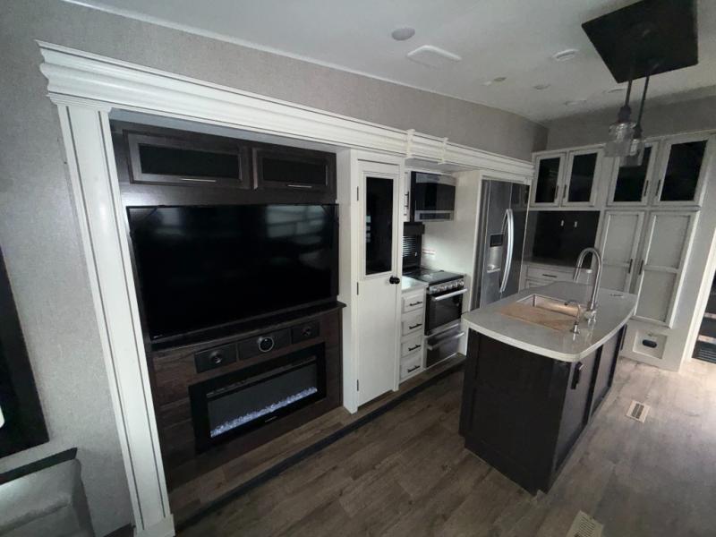 Come see how popular this triple slide fifth wheel is with a rear tri-fold sofa, theater seating, and entertainment center with a fireplace and 50" HDTV in the rear living area! The front private bedroom has a queen bed that can be switched out for an optional king Serta mattress and a front wall wardrobe with shelves and an area prepped for the optional washer and dryer to be added too. The dual Whisper Quiet air conditioners will keep you cool even on those hot summer days when you're preparing dinner with the kitchen island, the 21 cu. ft. residential refrigerator, the walk-in pantry, and the three burner cooktop. There is also a hutch to store your dishes and a coat closet/pantry for your convenience. Freshen up each morning in the full bathroom with the 60" shower with a seat and then head outside to relax underneath one of the two electric awnings!