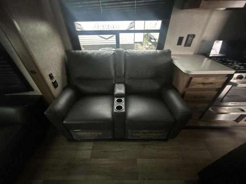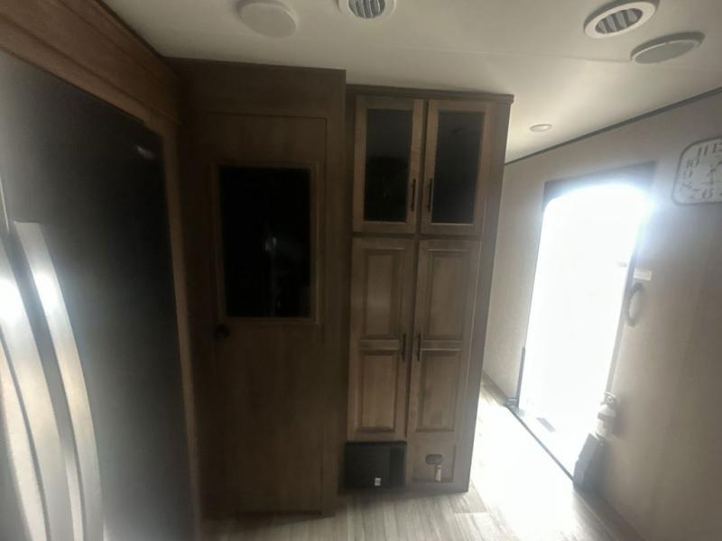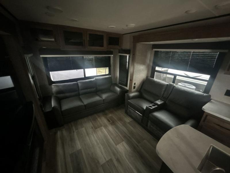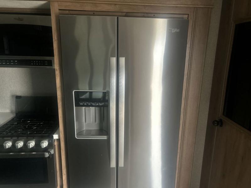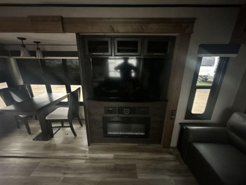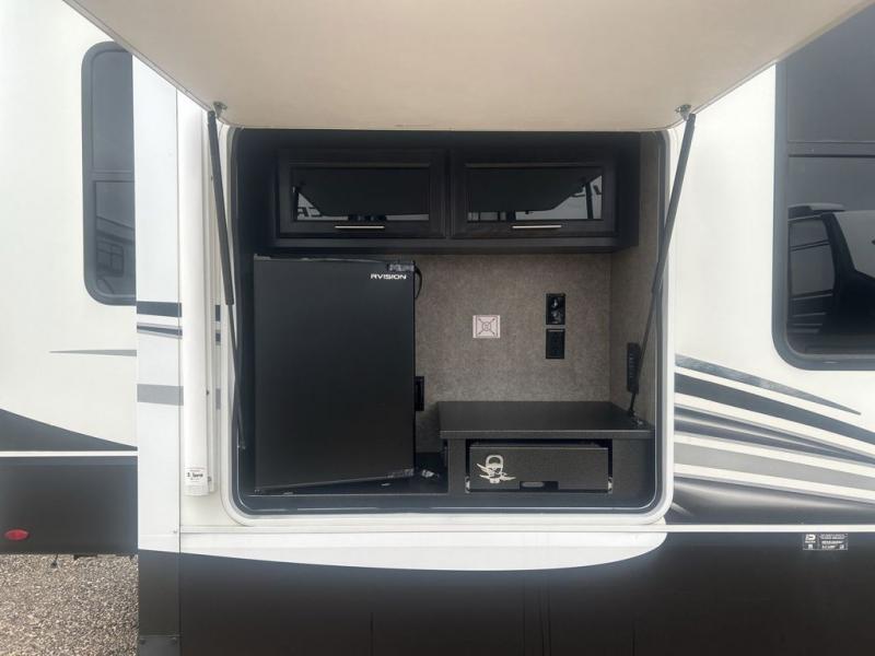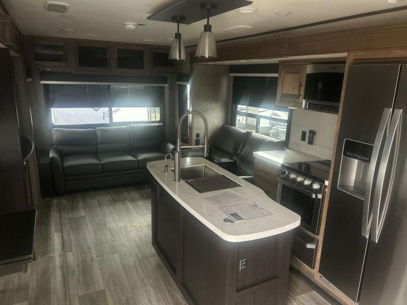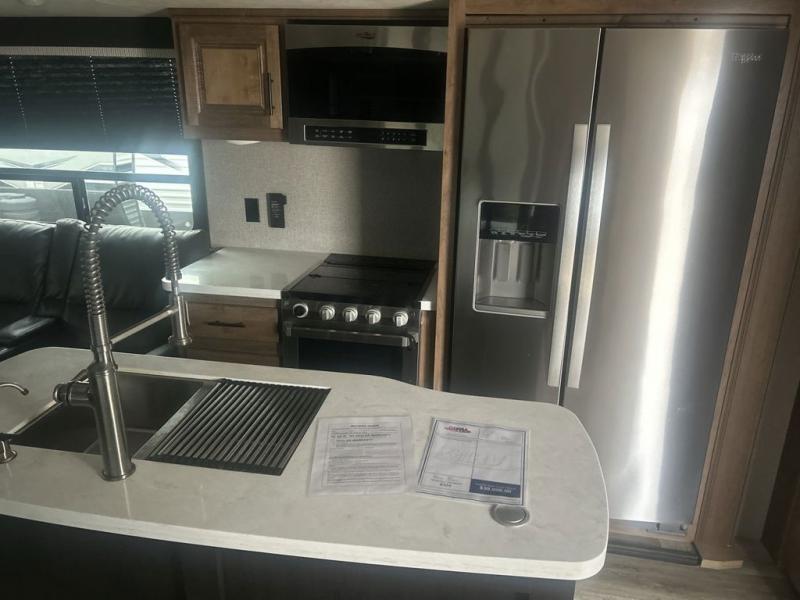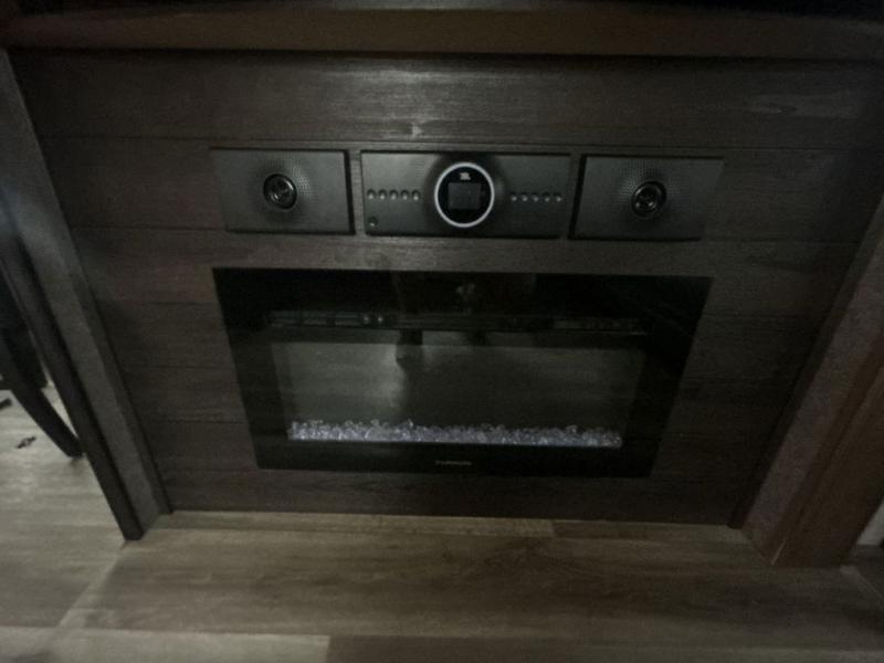 Step inside the spacious rear living area of this fifth wheel and see just how comfortable your next camping trip will be! It features a sofa with tables on either side to set your drinks on and theater seating across from the entertainment center with a fireplace and 50" HDTV with a JBL sound system. The kitchen has everything you will need to whip up a delicious home cooked meal with the kitchen island, the walk-in pantry, the 21 cu. ft. residential refrigerator, and the three burner cooktop, plus there is a microwave for those days when you don't feel like cooking. You can even watch the kids play outside while you cook dinner thanks to the outside kitchen which even has a refrigerator to keep your beverage cool. Everyone can freshen up in the full bathroom with the 60" shower with a seat and a linen closet to store your towels. The front private bedroom has a comfortable queen bed with nightstands on either side for you to place your electronics or glass of water, a dresser with a TV option that can be added, and a wardrobe that is prepped for the optional washer and dryer to be added too!