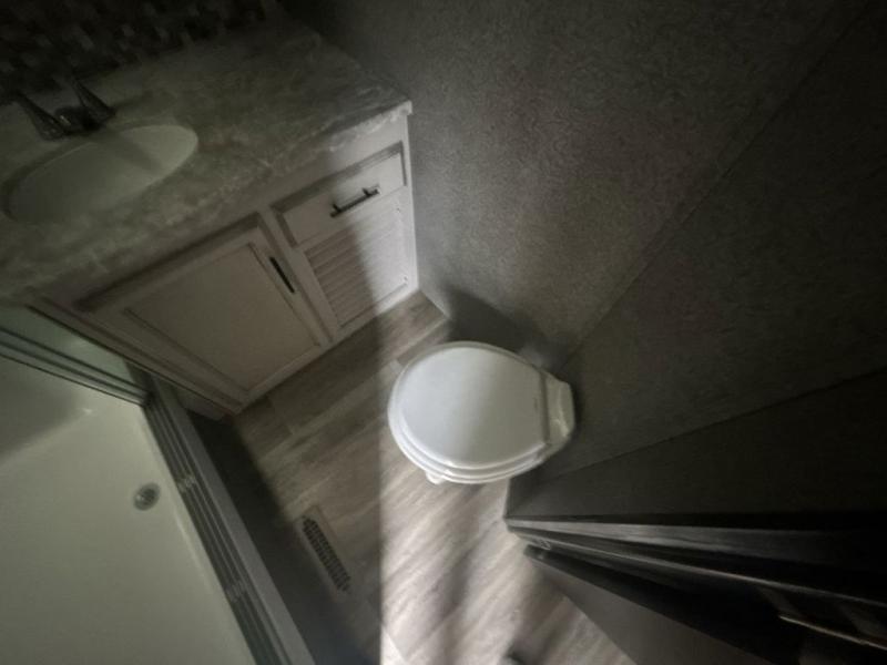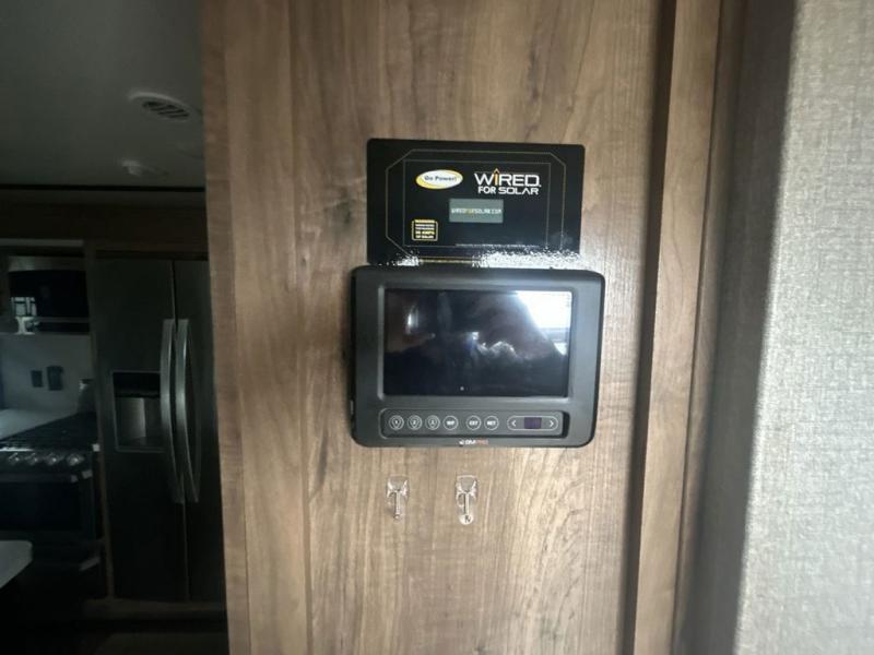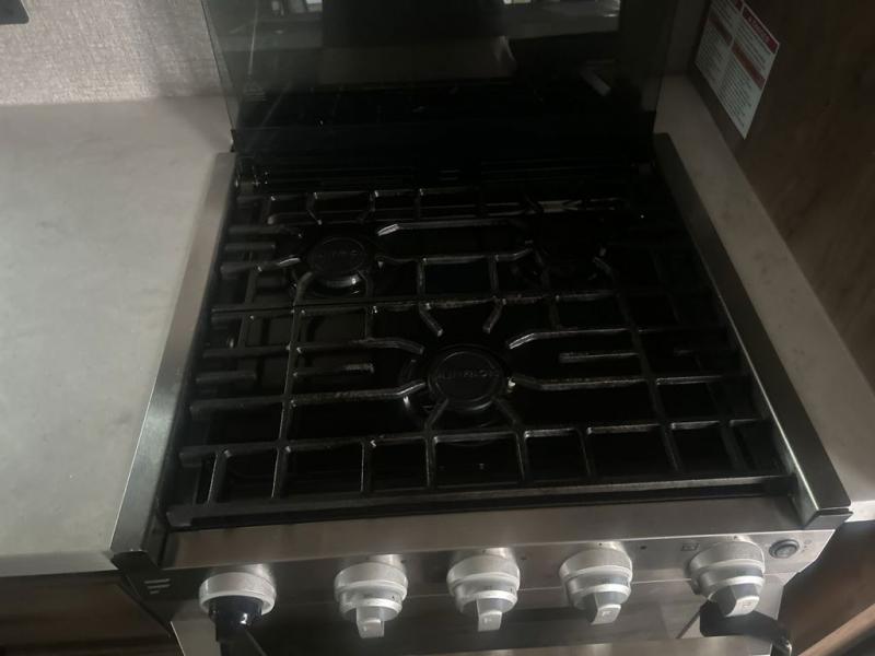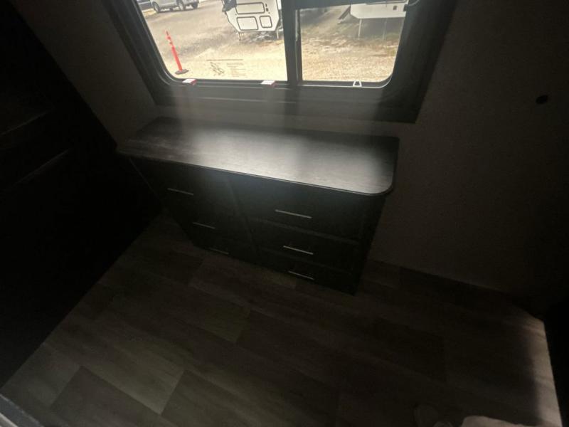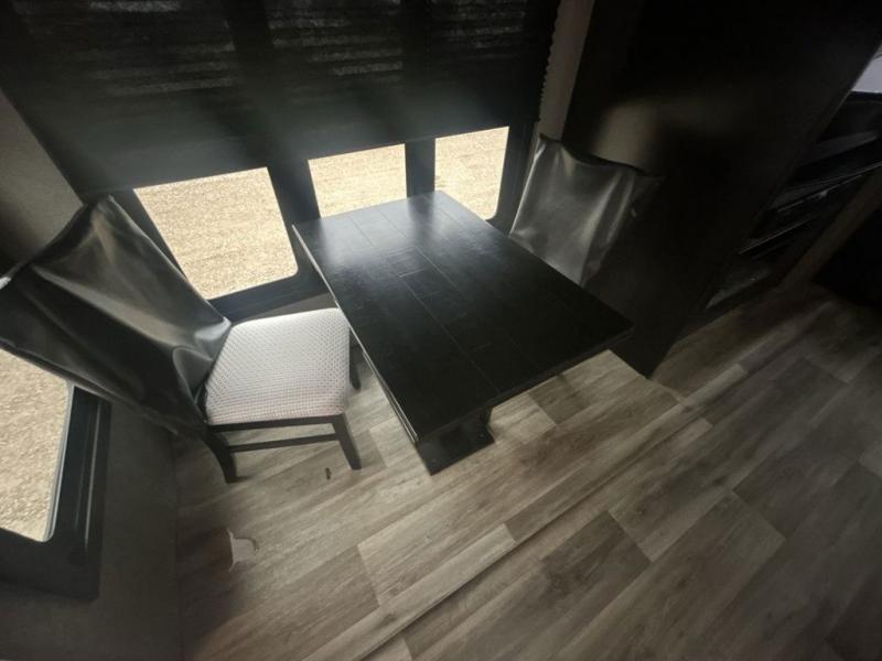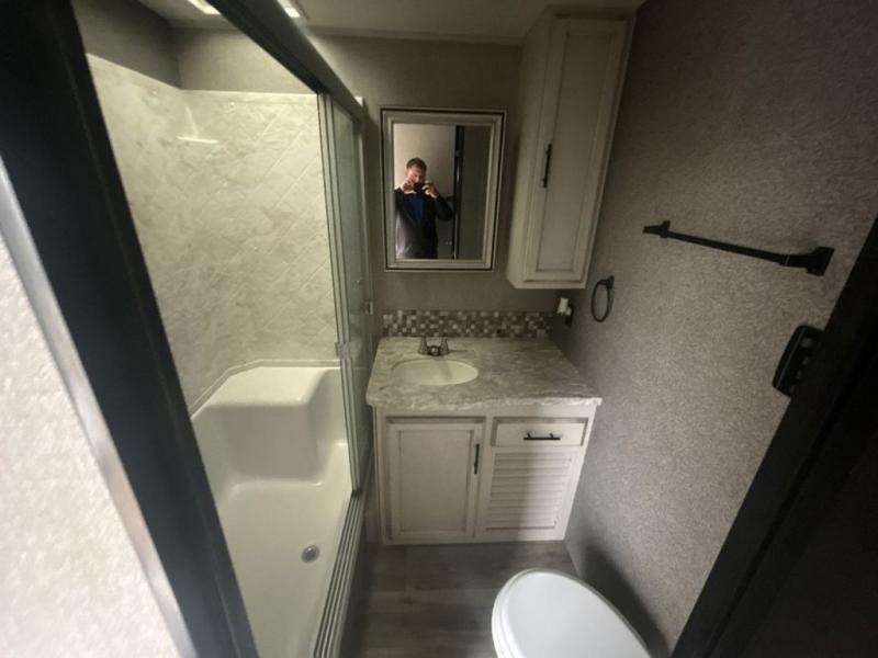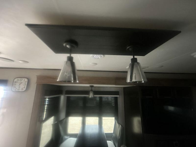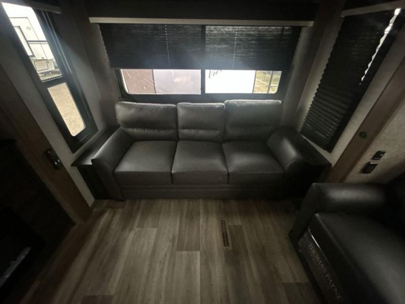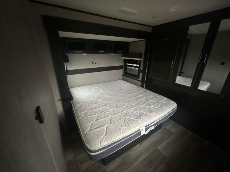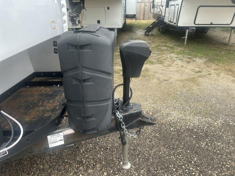 Step inside the spacious rear living area of this fifth wheel and see just how comfortable your next camping trip will be! It features a sofa with tables on either side to set your drinks on and theater seating across from the entertainment center with a fireplace and 50" HDTV with a JBL sound system. The kitchen has everything you will need to whip up a delicious home cooked meal with the kitchen island, the walk-in pantry, the 21 cu. ft. residential refrigerator, and the three burner cooktop, plus there is a microwave for those days when you don't feel like cooking. You can even watch the kids play outside while you cook dinner thanks to the outside kitchen which even has a refrigerator to keep your beverage cool. Everyone can freshen up in the full bathroom with the 60" shower with a seat and a linen closet to store your towels. The front private bedroom has a comfortable queen bed with nightstands on either side for you to place your electronics or glass of water, a dresser with a TV option that can be added, and a wardrobe that is prepped for the optional washer and dryer to be added too!