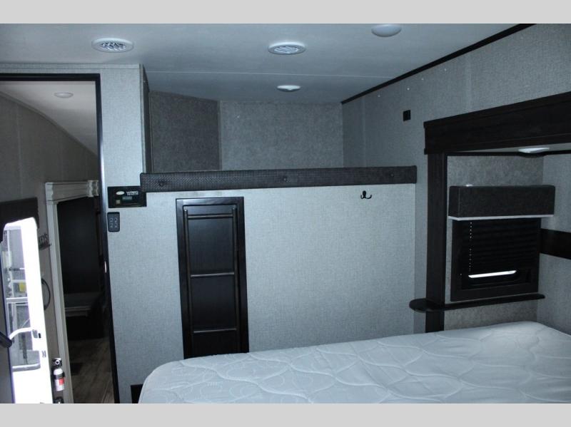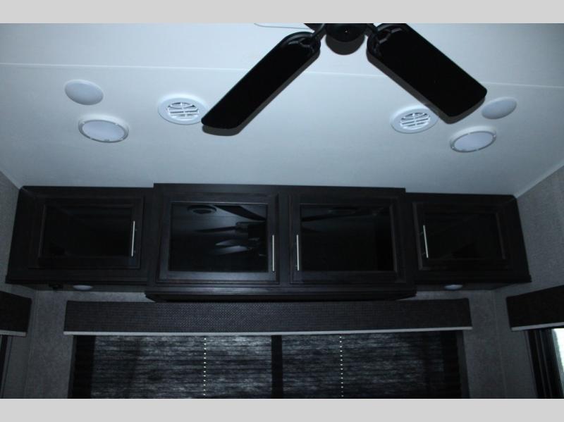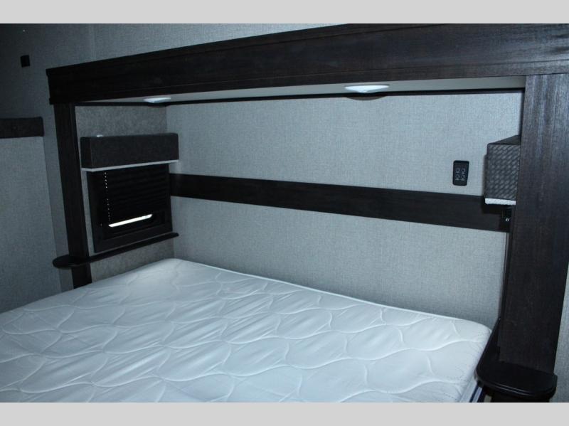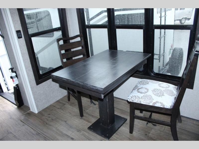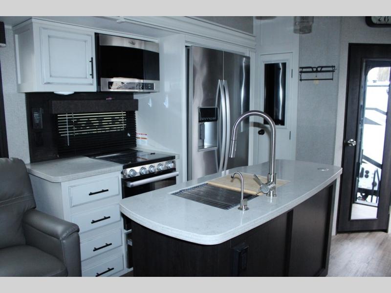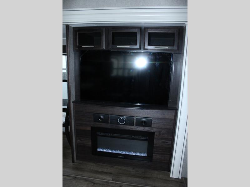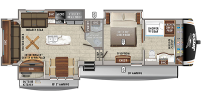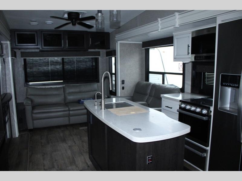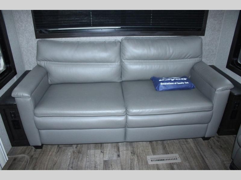 Check out the industry's first front full bathroom and half bathroom with a loft above it in this fifth wheel! Inside the front bathroom is a shower with a seat and a walk-in closet with an area prepped to add the optional washer and dryer, plus it leads right into the private bedroom that has a queen bed but can be switched out for the optional king Serta mattress. The kitchen island will make meal prepping easy and the free standing dinette is a great place to enjoy your meals then play a card game or two. The rear living area features a tri-fold sofa that can be used for seating during the day and a sleeping space at night, and theater seating across from the entertainment center with a fireplace and 50" HDTV with a JBL sound system. Outside you will find many handy features like the two electric awnings, the electric auto-leveling, the JAY COMMAND Smart RV technology, and the pass-through storage area!