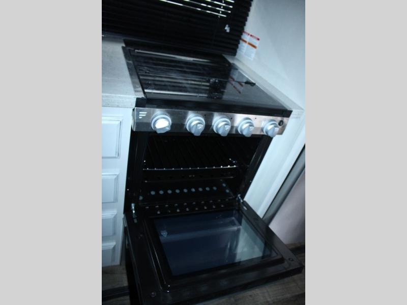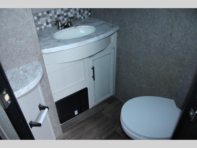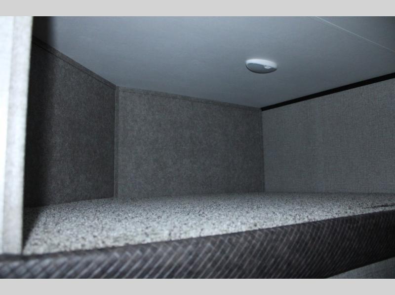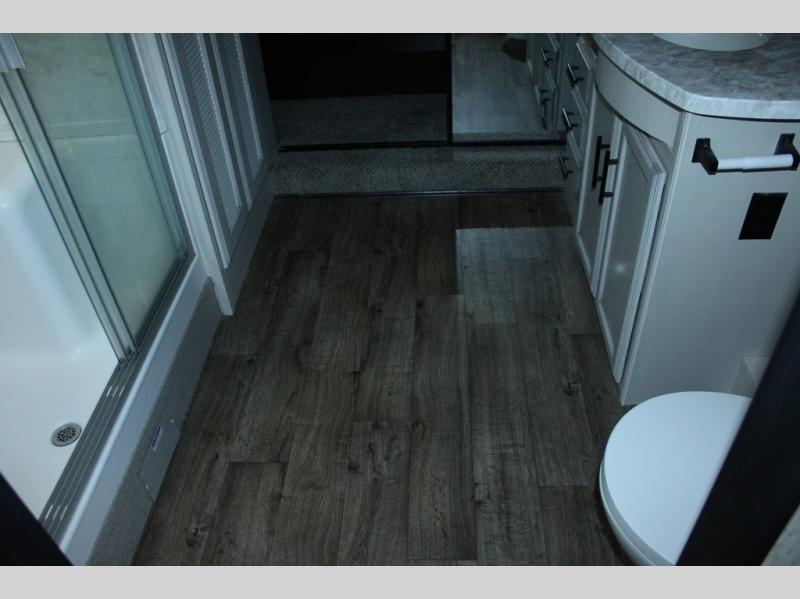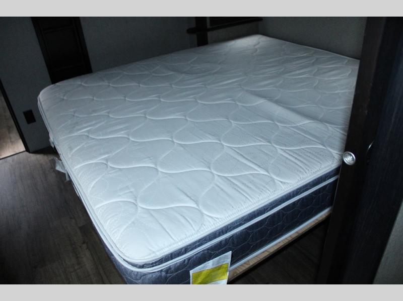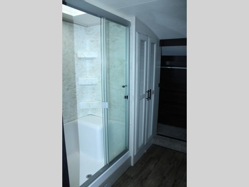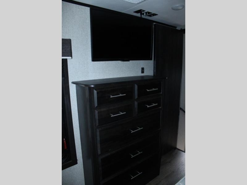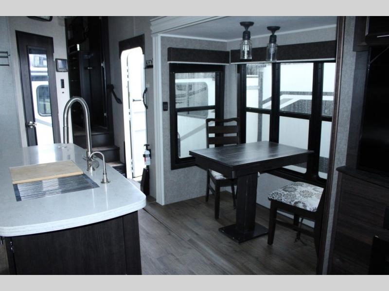 Check out the industry's first front full bathroom and half bathroom with a loft above it in this fifth wheel! Inside the front bathroom is a shower with a seat and a walk-in closet with an area prepped to add the optional washer and dryer, plus it leads right into the private bedroom that has a queen bed but can be switched out for the optional king Serta mattress. The kitchen island will make meal prepping easy and the free standing dinette is a great place to enjoy your meals then play a card game or two. The rear living area features a tri-fold sofa that can be used for seating during the day and a sleeping space at night, and theater seating across from the entertainment center with a fireplace and 50" HDTV with a JBL sound system. Outside you will find many handy features like the two electric awnings, the electric auto-leveling, the JAY COMMAND Smart RV technology, and the pass-through storage area!
