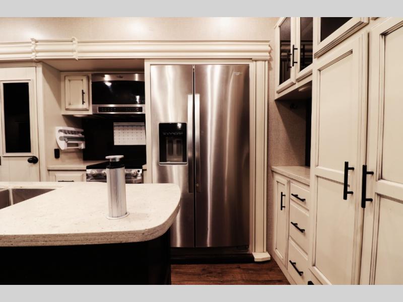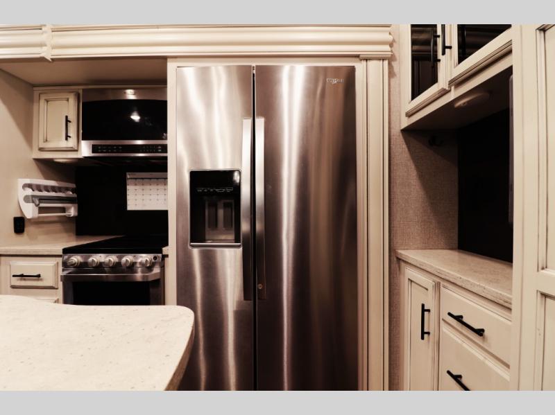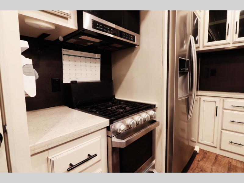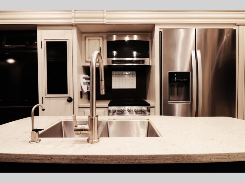 Kitchen island with multi-functional sink, large full-size refrigerator (12-volt in many models), three-burner stove/oven and abundant counter & pantry space.