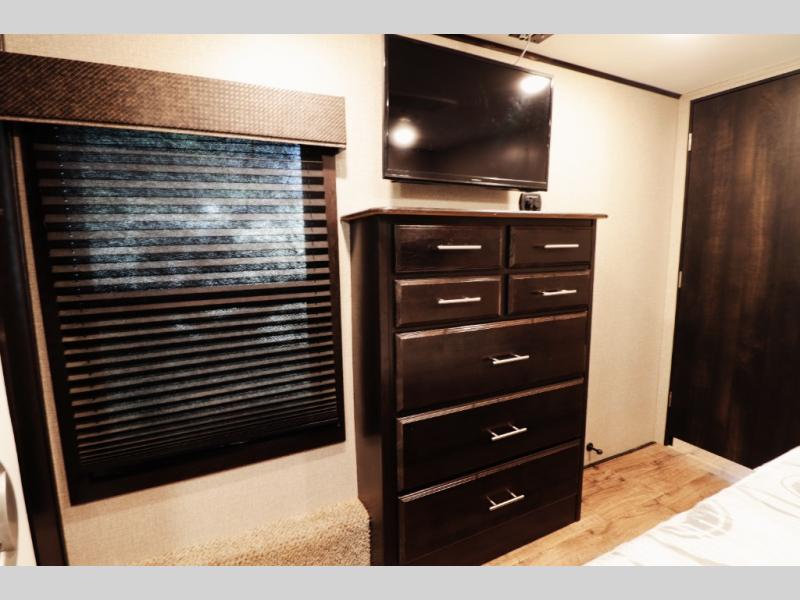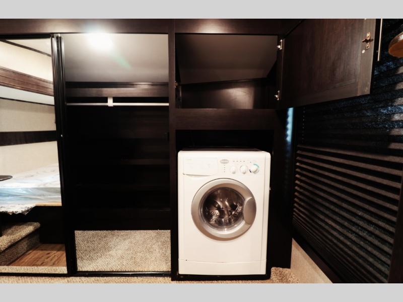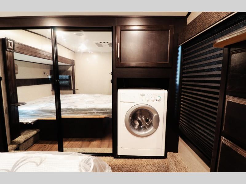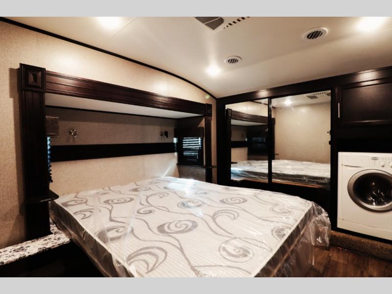 Master suite up front with a king-size bed slide (upgrade option), walk-in wardrobe/closet and washer/dryer prep—perfect for couples wanting comfort or families needing dedicated adult space.