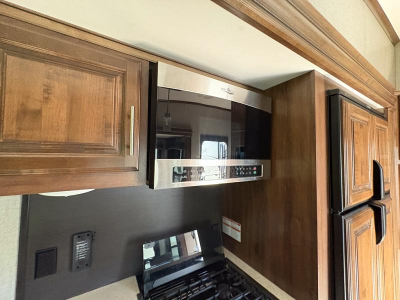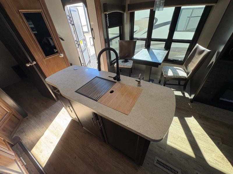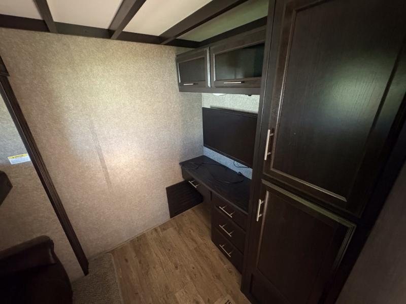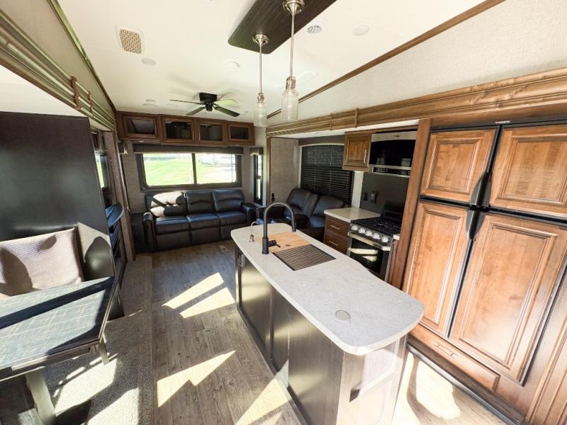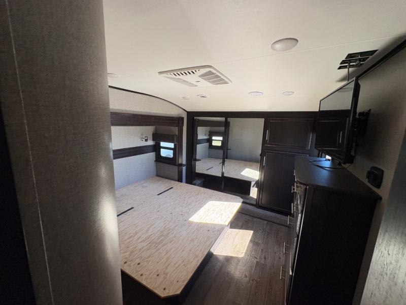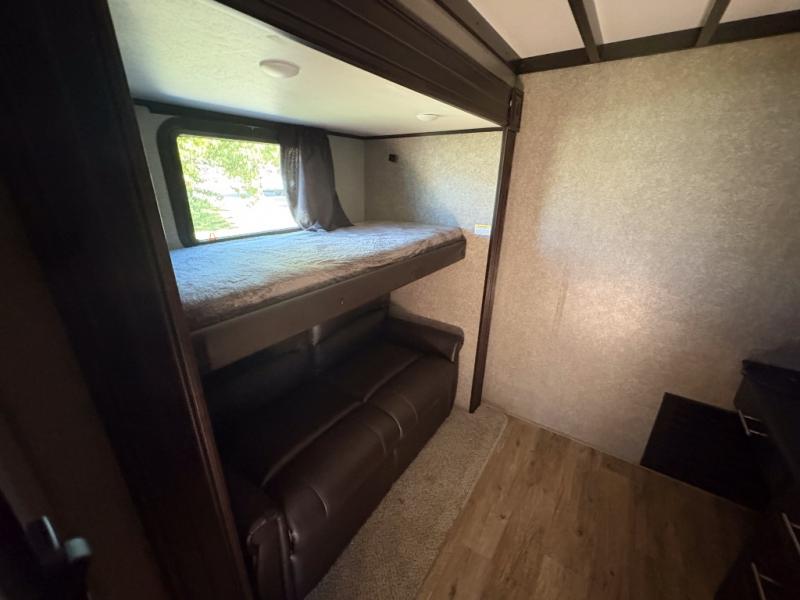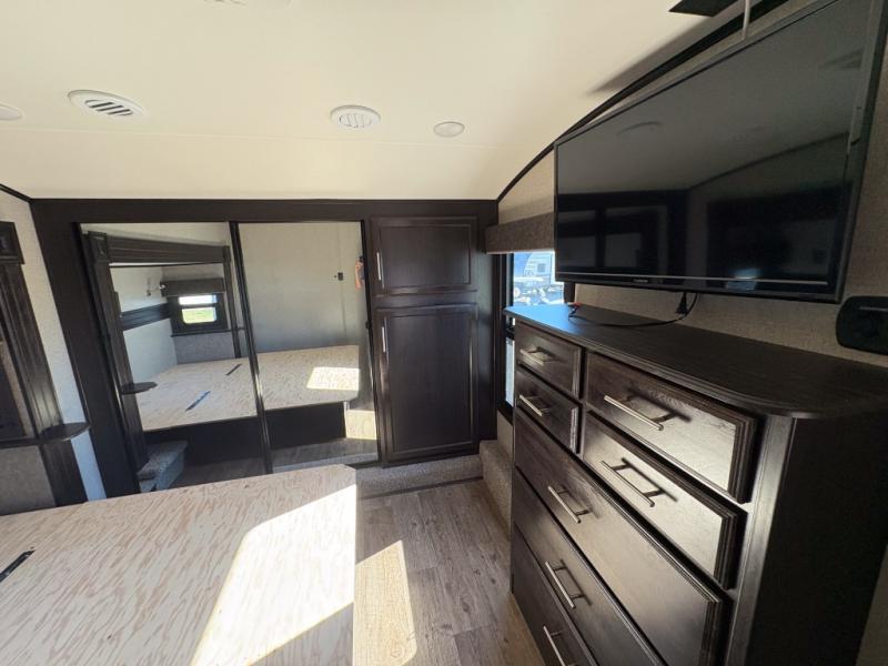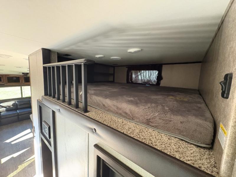 Find your favorite campsite then load up this two bedroom fifth wheel! The front private bedroom features a comfortable queen bed that can be switched out for an optional king Serta mattress, a walk-in closet with shelving and an area prepped for the optional washer and dryer. The second bedroom has a desk for you to get some work done, a hide-a-bed sofa with a top bunk and a 64" x 76" loft above it all. You can prepare your best meals in the kitchen with the island, the 21 cu. ft. residential refrigerator, and the three burner cooktop, and then comfortably enjoy eating them at the free standing table with chairs. The rear living area has a tri-fold sofa and theater seating across from an entertainment center with a fireplace and a 50" HDTV with a JBL sound system, plus there is a ceiling fan above it all to circulate the cool air from the dual Whisper Quiet air conditioners. You will stay protected underneath one of the two power awnings while you cook at the outside kitchen or prepare a beverage at the outside wet bar with a pull-out countertop!