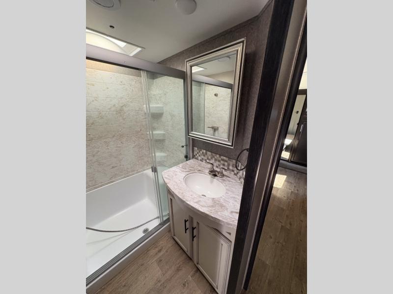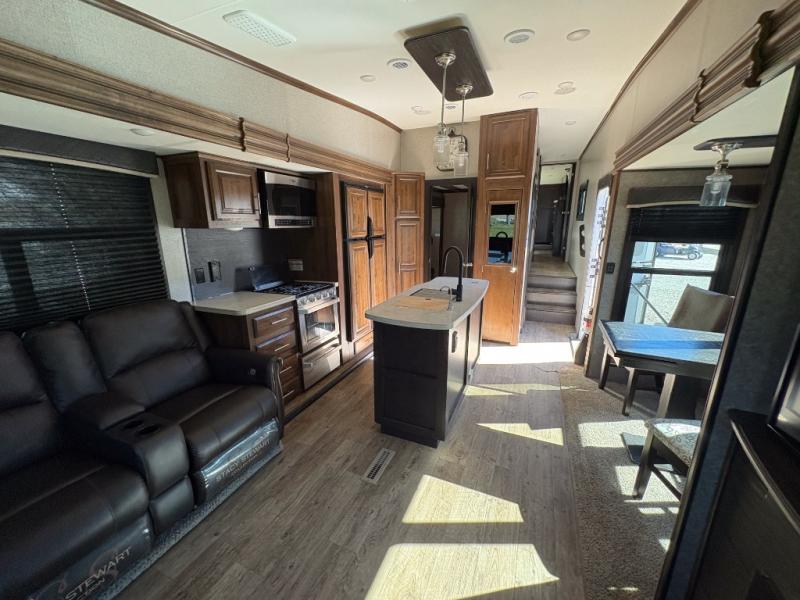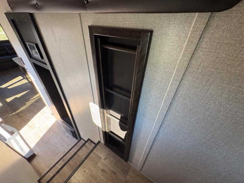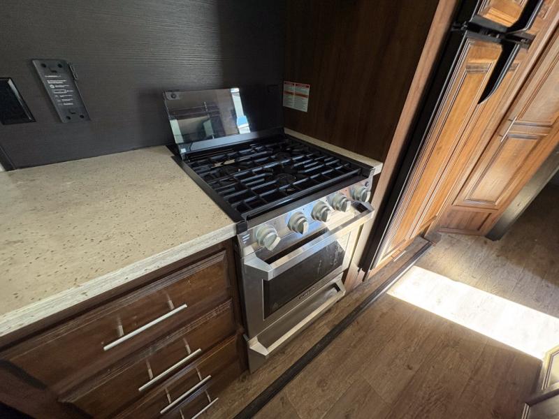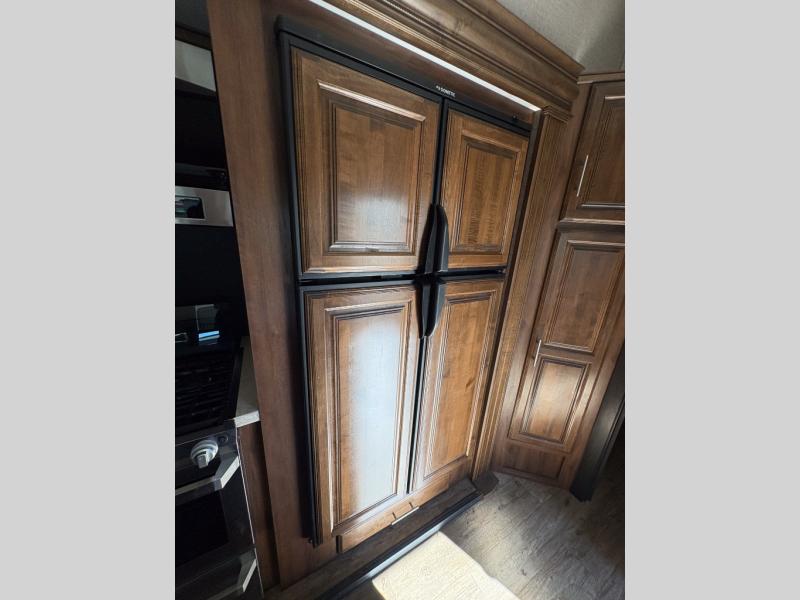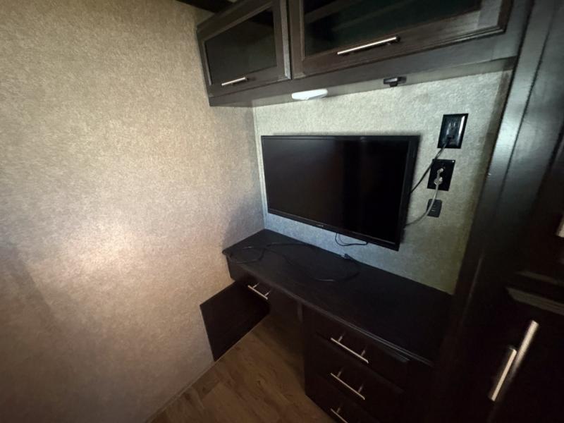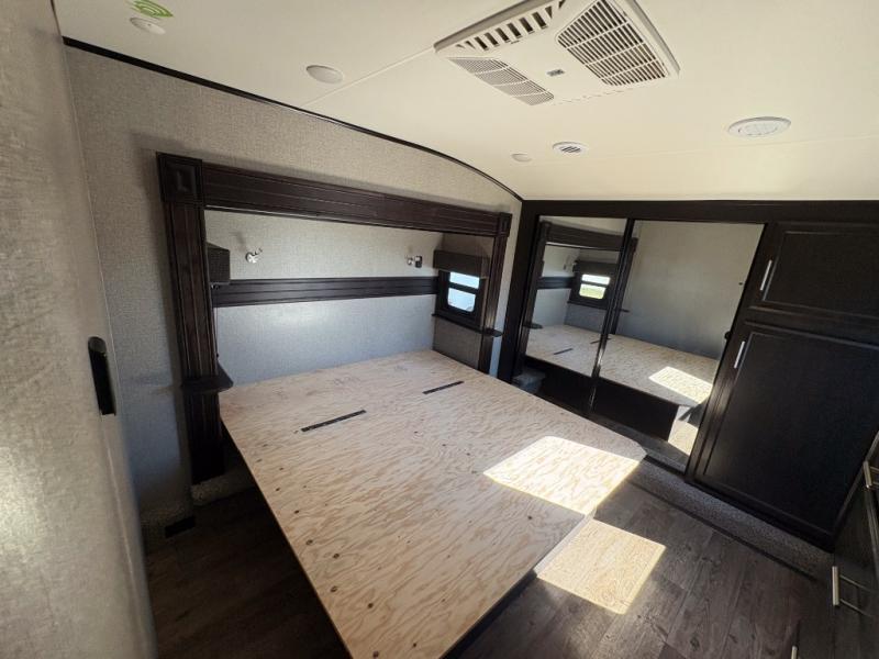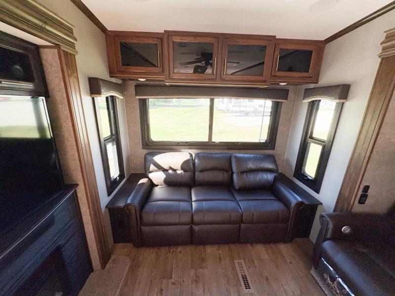 Find your favorite campsite then load up this two bedroom fifth wheel! The front private bedroom features a comfortable queen bed that can be switched out for an optional king Serta mattress, a walk-in closet with shelving and an area prepped for the optional washer and dryer. The second bedroom has a desk for you to get some work done, a hide-a-bed sofa with a top bunk and a 64" x 76" loft above it all. You can prepare your best meals in the kitchen with the island, the 21 cu. ft. residential refrigerator, and the three burner cooktop, and then comfortably enjoy eating them at the free standing table with chairs. The rear living area has a tri-fold sofa and theater seating across from an entertainment center with a fireplace and a 50" HDTV with a JBL sound system, plus there is a ceiling fan above it all to circulate the cool air from the dual Whisper Quiet air conditioners. You will stay protected underneath one of the two power awnings while you cook at the outside kitchen or prepare a beverage at the outside wet bar with a pull-out countertop!
