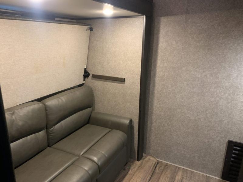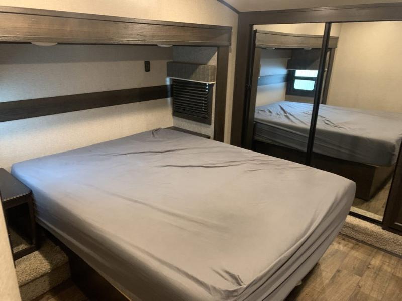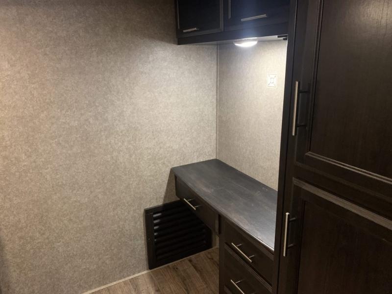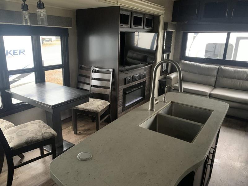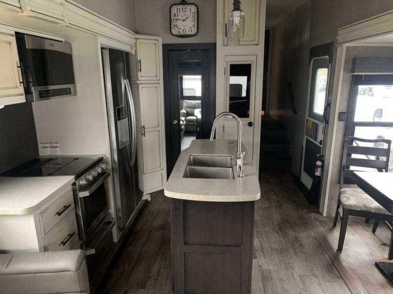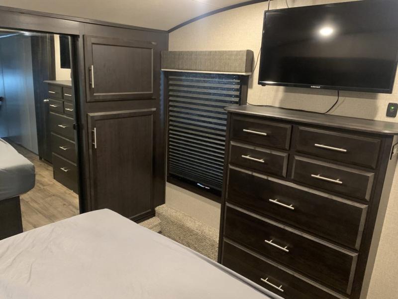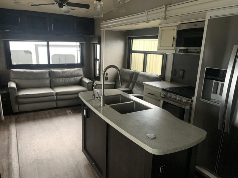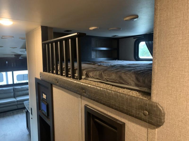 Find your favorite campsite then load up this two bedroom fifth wheel! The front private bedroom features a comfortable queen bed that can be switched out for an optional king Serta mattress, a walk-in closet with shelving and an area prepped for the optional washer and dryer. The second bedroom has a desk for you to get some work done, a hide-a-bed sofa with a top bunk and a 64" x 76" loft above it all. You can prepare your best meals in the kitchen with the island, the 21 cu. ft. residential refrigerator, and the three burner cooktop, and then comfortably enjoy eating them at the free standing table with chairs. The rear living area has a tri-fold sofa and theater seating across from an entertainment center with a fireplace and a 50" HDTV with a JBL sound system, plus there is a ceiling fan above it all to circulate the cool air from the dual Whisper Quiet air conditioners. You will stay protected underneath one of the two power awnings while you cook at the outside kitchen or prepare a beverage at the outside wet bar with a pull-out countertop!