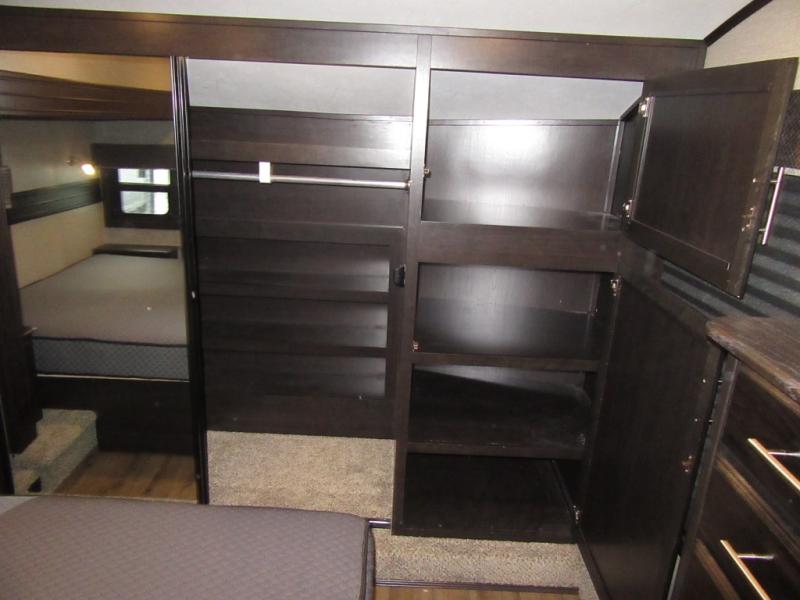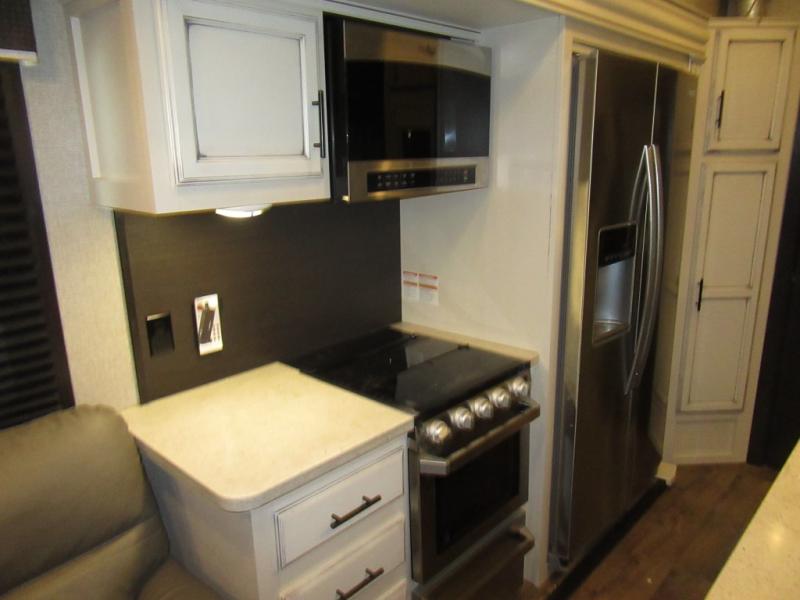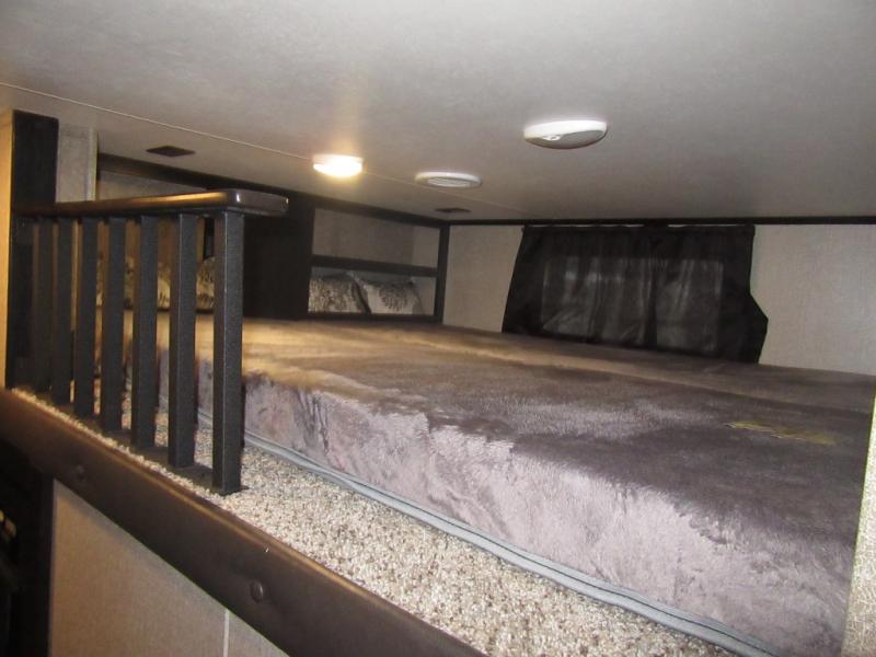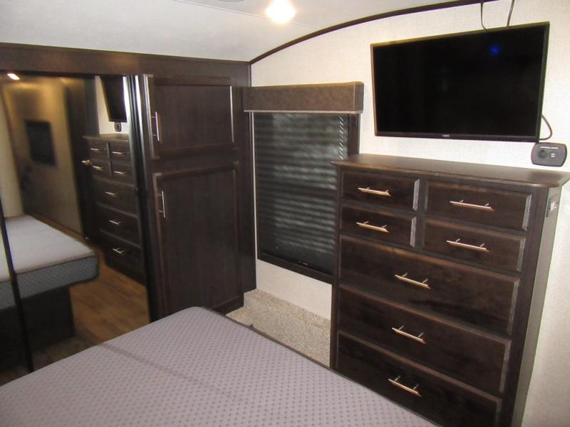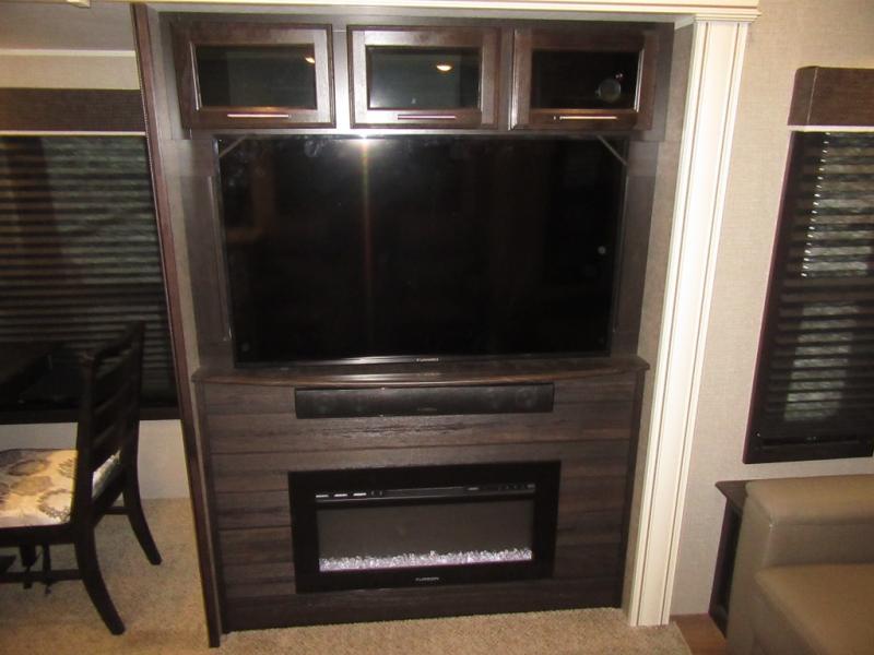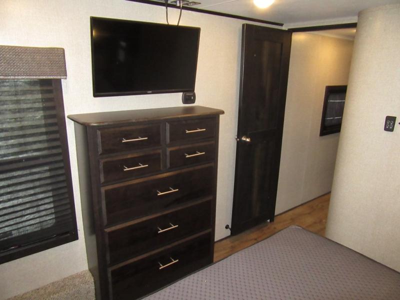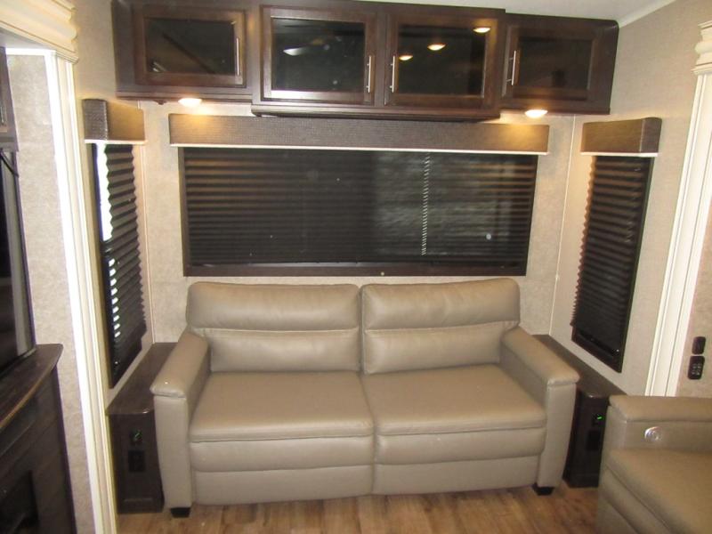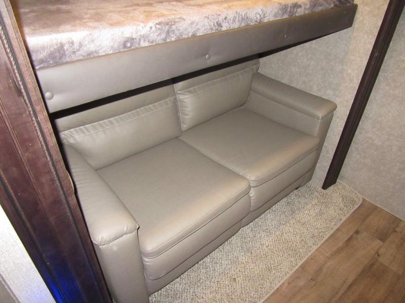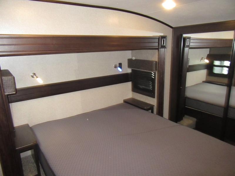 Find your favorite campsite then load up this two bedroom fifth wheel! The front private bedroom features a comfortable queen bed that can be switched out for an optional king Serta mattress, a walk-in closet with shelving and an area prepped for the optional washer and dryer. The second bedroom has a desk for you to get some work done, a hide-a-bed sofa with a top bunk and a 64" x 76" loft above it all. You can prepare your best meals in the kitchen with the island, the 21 cu. ft. residential refrigerator, and the three burner cooktop, and then comfortably enjoy eating them at the free standing table with chairs. The rear living area has a tri-fold sofa and theater seating across from an entertainment center with a fireplace and a 50" HDTV with a JBL sound system, plus there is a ceiling fan above it all to circulate the cool air from the dual Whisper Quiet air conditioners. You will stay protected underneath one of the two power awnings while you cook at the outside kitchen or prepare a beverage at the outside wet bar with a pull-out countertop!