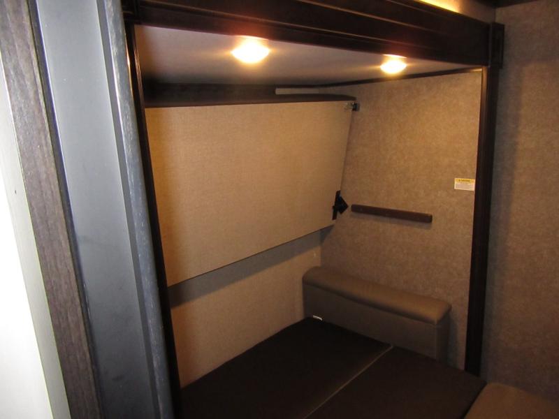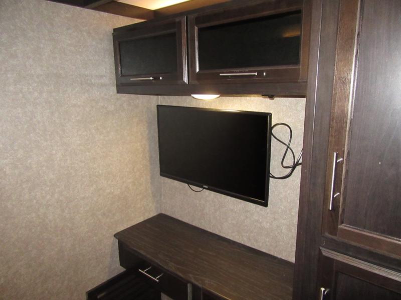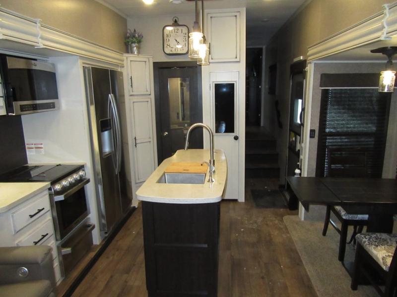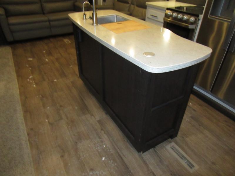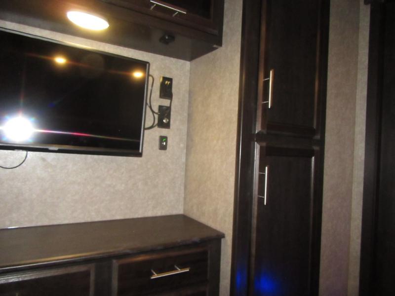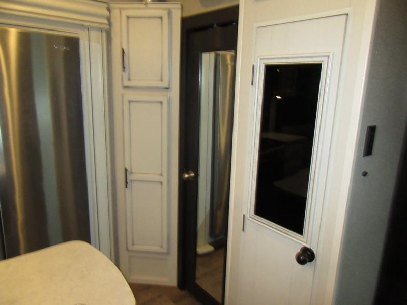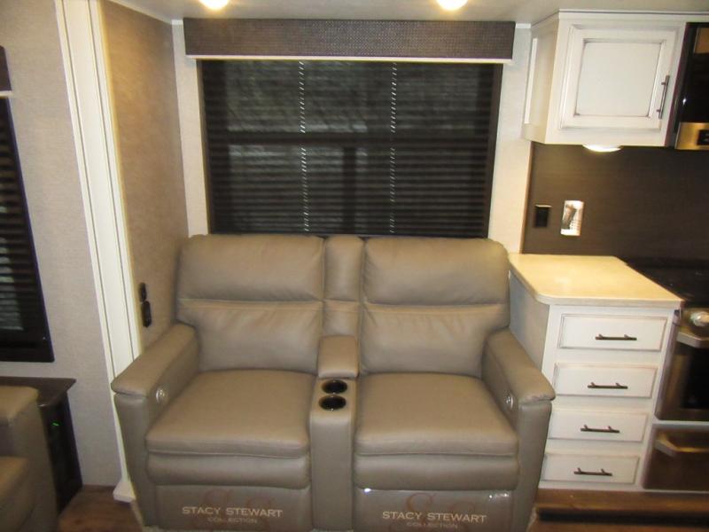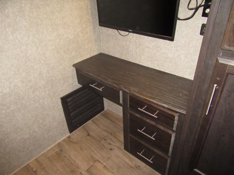 Find your favorite campsite then load up this two bedroom fifth wheel! The front private bedroom features a comfortable queen bed that can be switched out for an optional king Serta mattress, a walk-in closet with shelving and an area prepped for the optional washer and dryer. The second bedroom has a desk for you to get some work done, a hide-a-bed sofa with a top bunk and a 64" x 76" loft above it all. You can prepare your best meals in the kitchen with the island, the 21 cu. ft. residential refrigerator, and the three burner cooktop, and then comfortably enjoy eating them at the free standing table with chairs. The rear living area has a tri-fold sofa and theater seating across from an entertainment center with a fireplace and a 50" HDTV with a JBL sound system, plus there is a ceiling fan above it all to circulate the cool air from the dual Whisper Quiet air conditioners. You will stay protected underneath one of the two power awnings while you cook at the outside kitchen or prepare a beverage at the outside wet bar with a pull-out countertop!