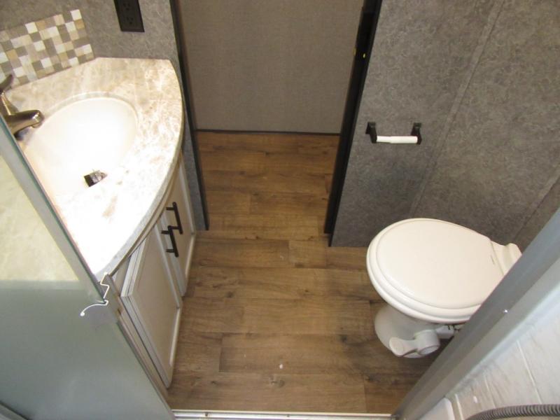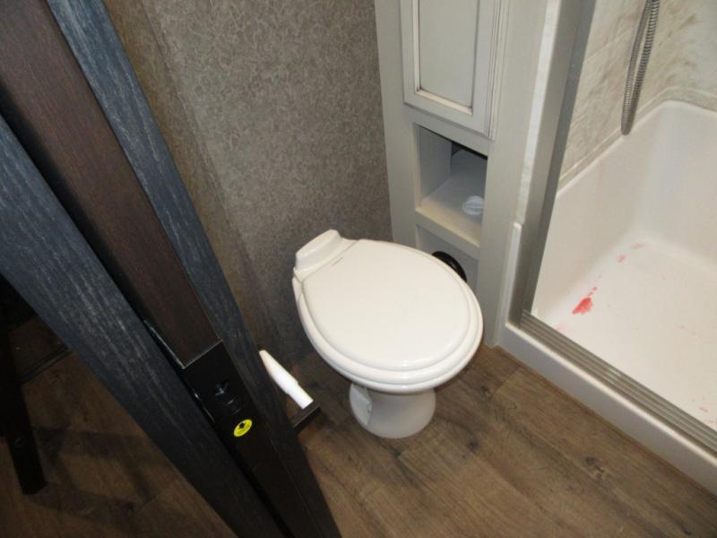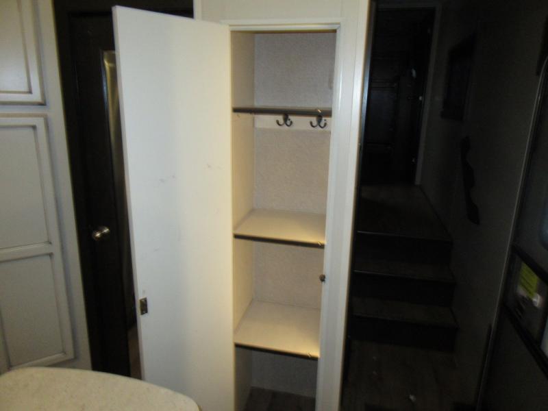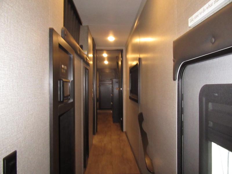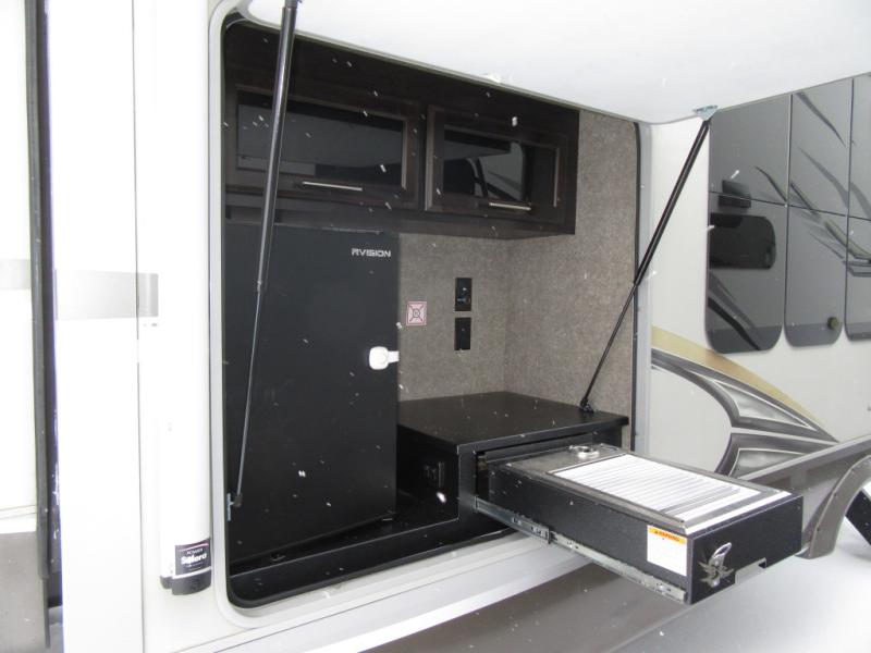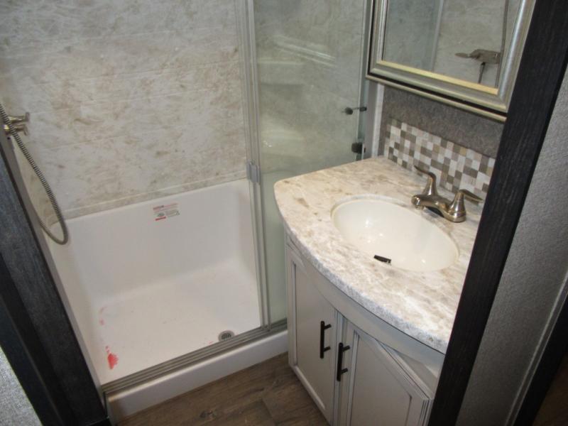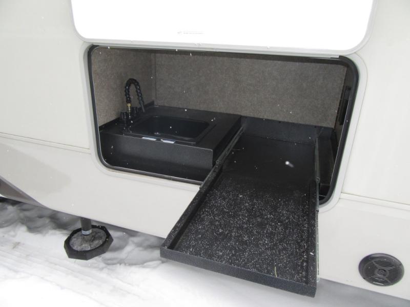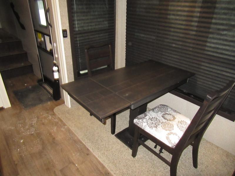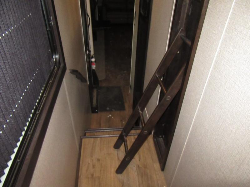 Find your favorite campsite then load up this two bedroom fifth wheel! The front private bedroom features a comfortable queen bed that can be switched out for an optional king Serta mattress, a walk-in closet with shelving and an area prepped for the optional washer and dryer. The second bedroom has a desk for you to get some work done, a hide-a-bed sofa with a top bunk and a 64" x 76" loft above it all. You can prepare your best meals in the kitchen with the island, the 21 cu. ft. residential refrigerator, and the three burner cooktop, and then comfortably enjoy eating them at the free standing table with chairs. The rear living area has a tri-fold sofa and theater seating across from an entertainment center with a fireplace and a 50" HDTV with a JBL sound system, plus there is a ceiling fan above it all to circulate the cool air from the dual Whisper Quiet air conditioners. You will stay protected underneath one of the two power awnings while you cook at the outside kitchen or prepare a beverage at the outside wet bar with a pull-out countertop!