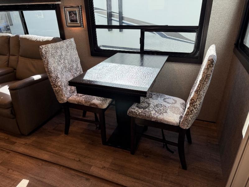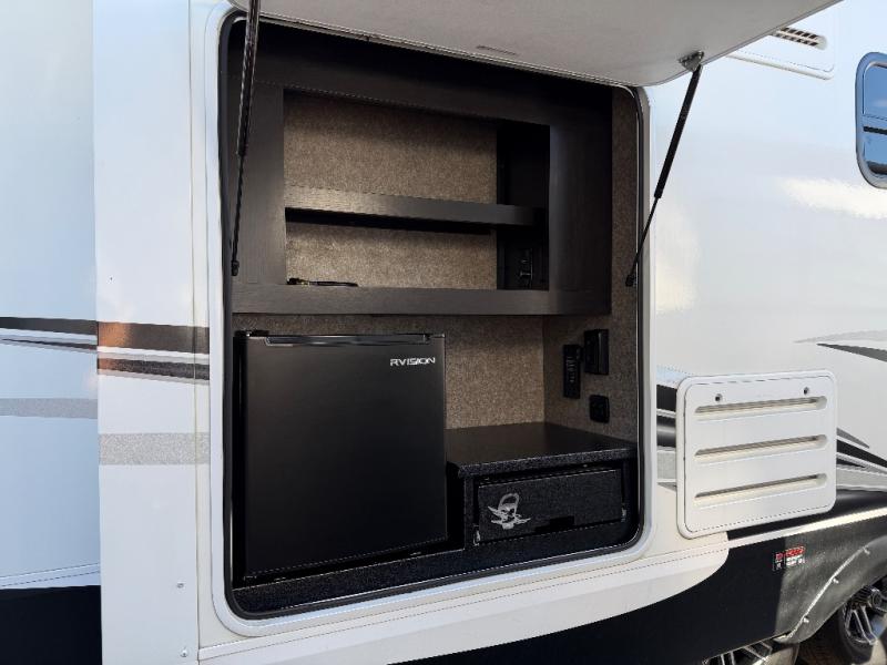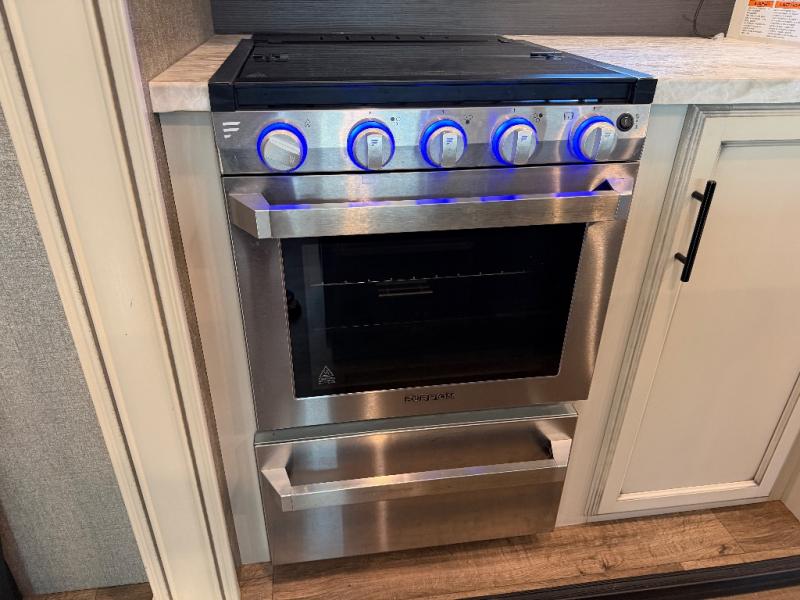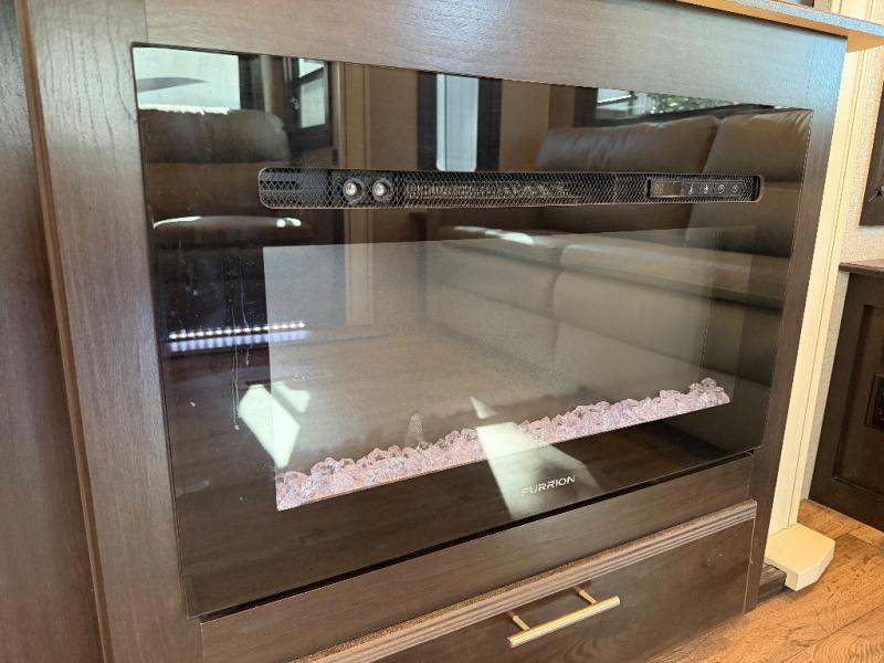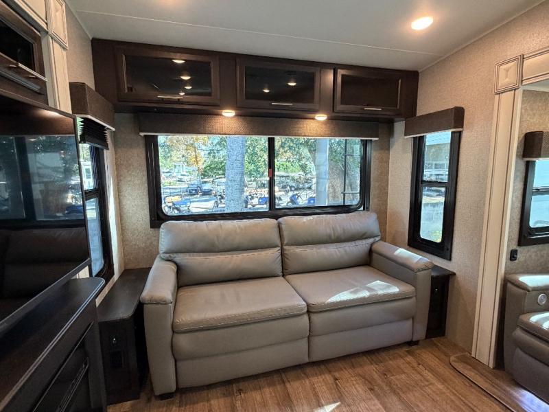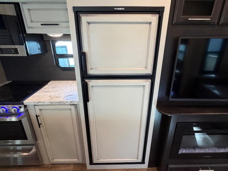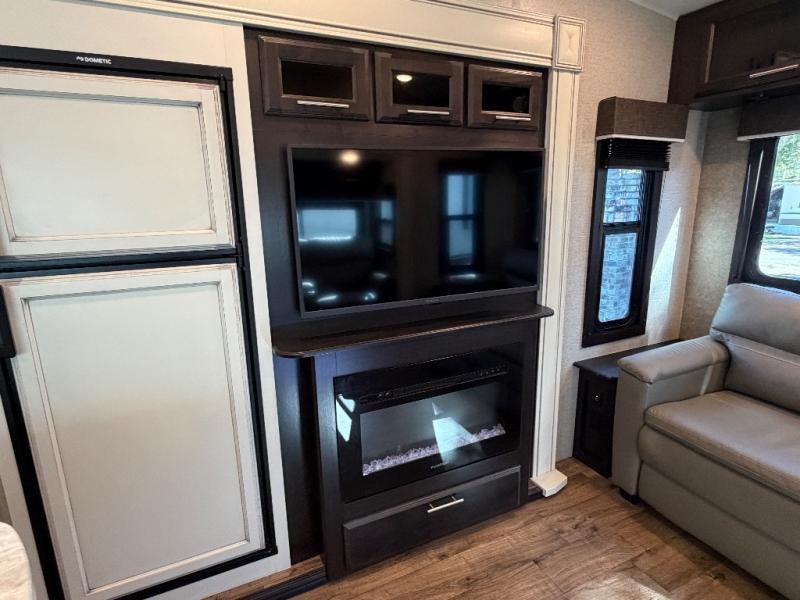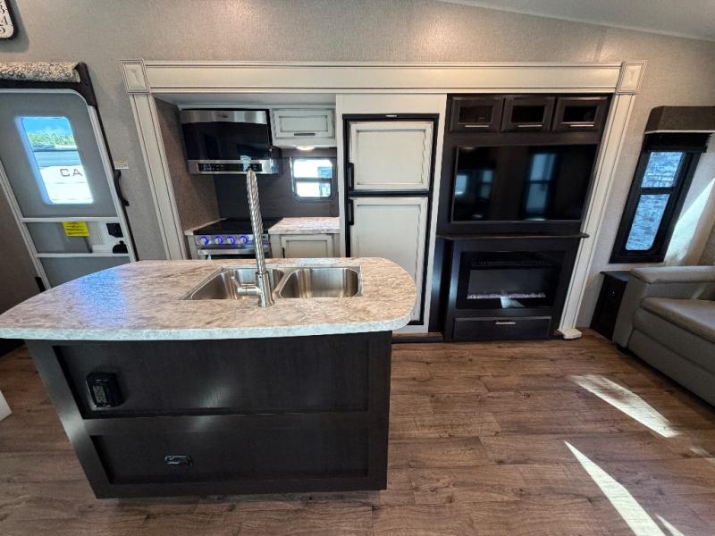 Enjoy the open concept design of the Jayco Eagle HT 28.5RSTS fifth wheel, featuring dual opposing slides that expand the main living area for a roomy and inviting feel. The tri-fold sofa offers extra sleeping space for guests, while the entertainment center with an LED fireplace creates a cozy atmosphere perfect for relaxing after a long day of adventure.