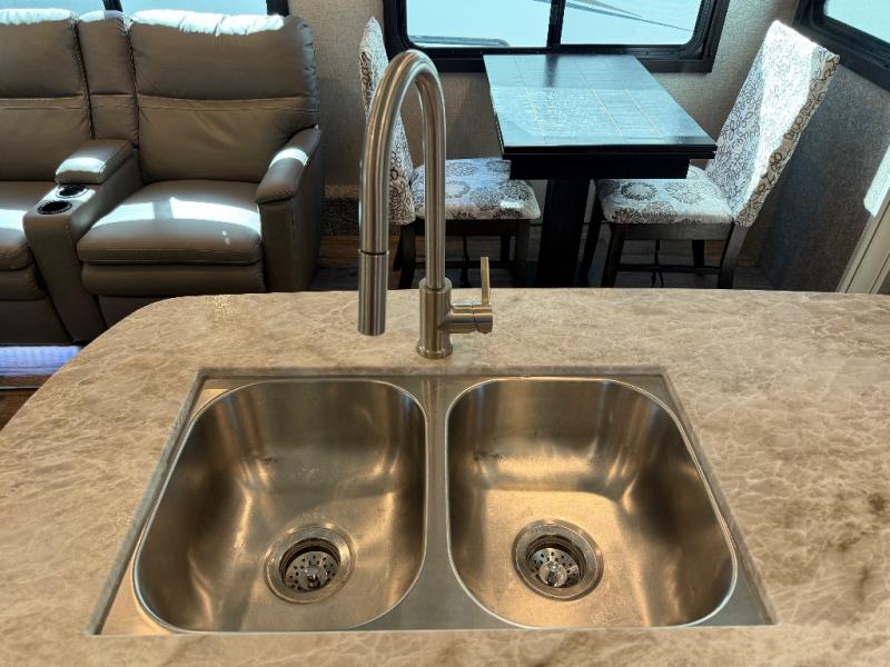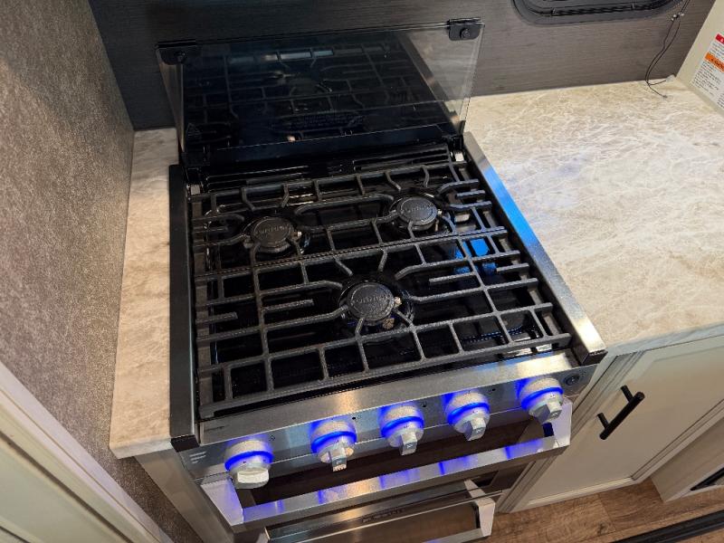 The centerpiece of this layout is the kitchen island with a large stainless steel sink and extra counter space for meal prep. Cook up your favorite dishes on the stainless steel range or step outside to the outdoor kitchen to make breakfast in the fresh air. The free-standing table with chairs makes a great place for meals or game nights.