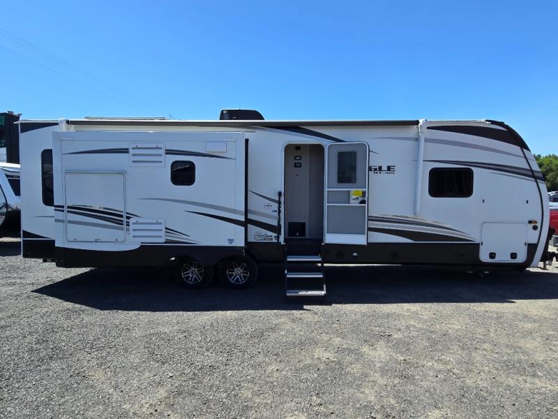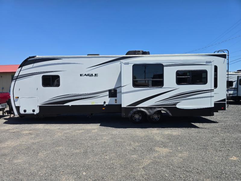 Take one look at this popular half-ton-towable Eagle HT travel trailer, and you'll be hooked! The dual opposing slides in the main living area create an open floorplan you are sure to love. You can easily prepare meals indoors on the stainless steel range or on the outside kitchen that includes a hybrid grill and a mini-fridge. This model includes plenty of storage, including a convertible coat closet, a walk-in pantry, plus a huge pass-through storage outside for your larger camp gear!
