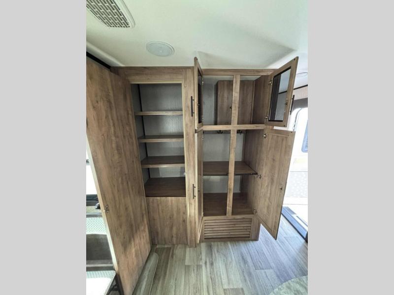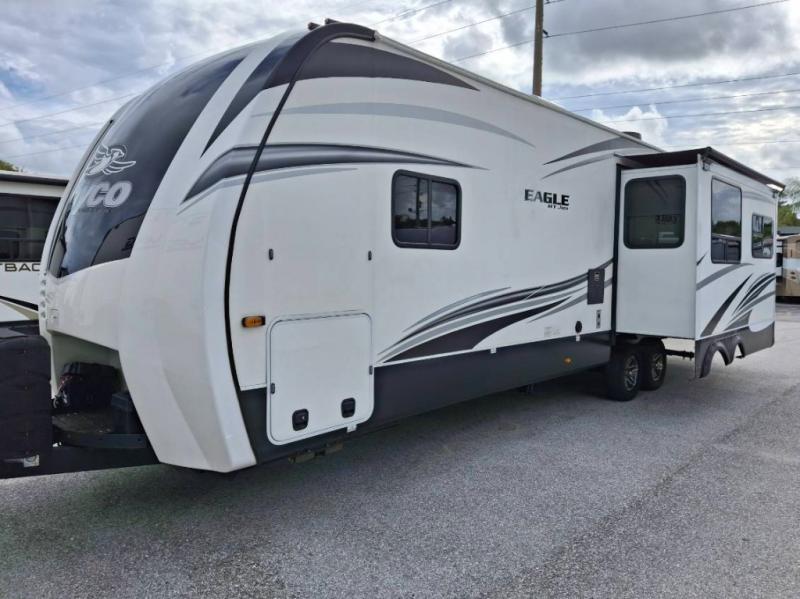 Take one look at this popular half-ton-towable Eagle HT travel trailer, and you'll be hooked! The dual opposing slides in the main living area create an open floorplan you are sure to love. You can easily prepare meals indoors on the stainless steel range or on the outside kitchen that includes a hybrid grill and a mini-fridge. This model includes plenty of storage, including a convertible coat closet, a walk-in pantry, plus a huge pass-through storage outside for your larger camp gear!