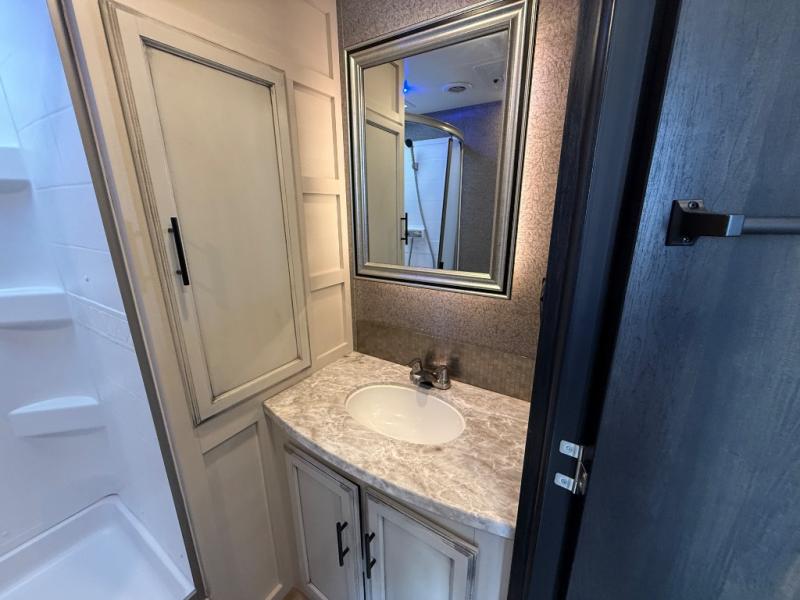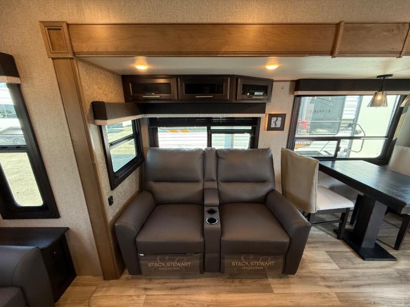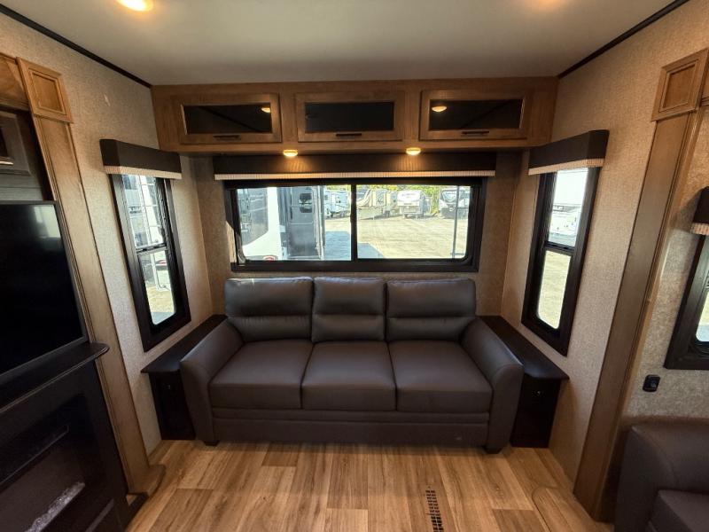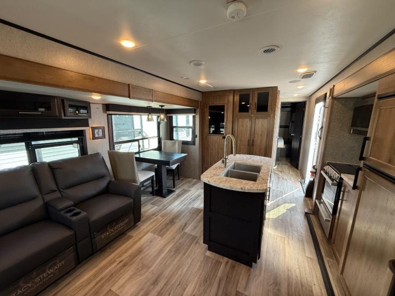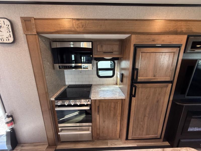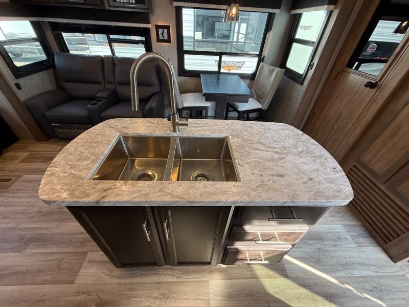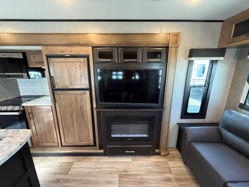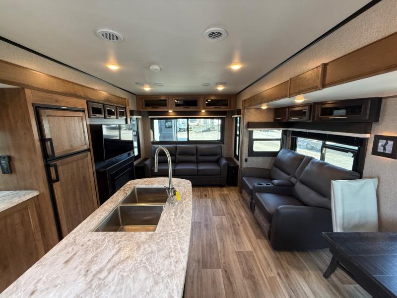 With each Jayco Eagle HT fifth wheel or travel trailer, you will enjoy all-season camping with the Climate Shield zero-degree tested weather protection that includes a fully enclosed and heated underbelly. The industry-exclusive HELIX Cooling System with a 15,000 BTU "Whisper Quiet" A/C system provides a quieter and more efficient system for your comfort. These models include the JAYCOMMAND Smart RV system powered by BMPRO which allows you to control your unit's functions right from your smartphone or tablet. Inside, you will enjoy the residential queen Serta mattress with under-bed storage, the bathroom skylight to allow natural light in, the stainless steel kitchen sink, and dual USB charging ports in the kitchen and bedroom so that you can keep your gadgets charged and ready to go.