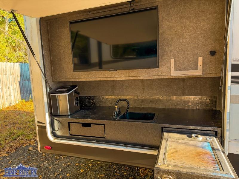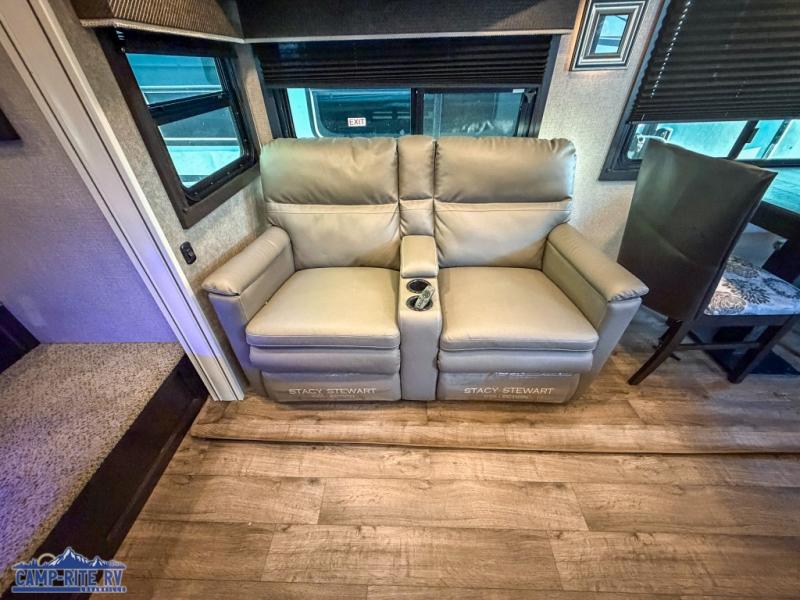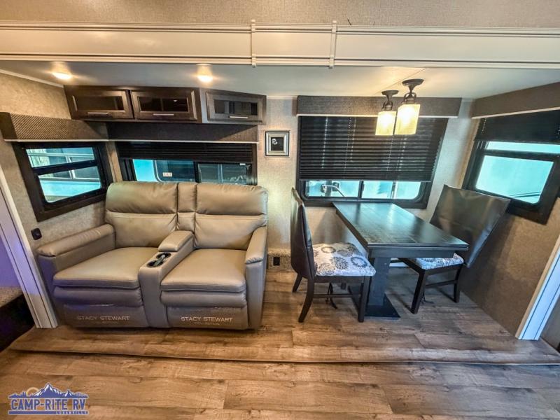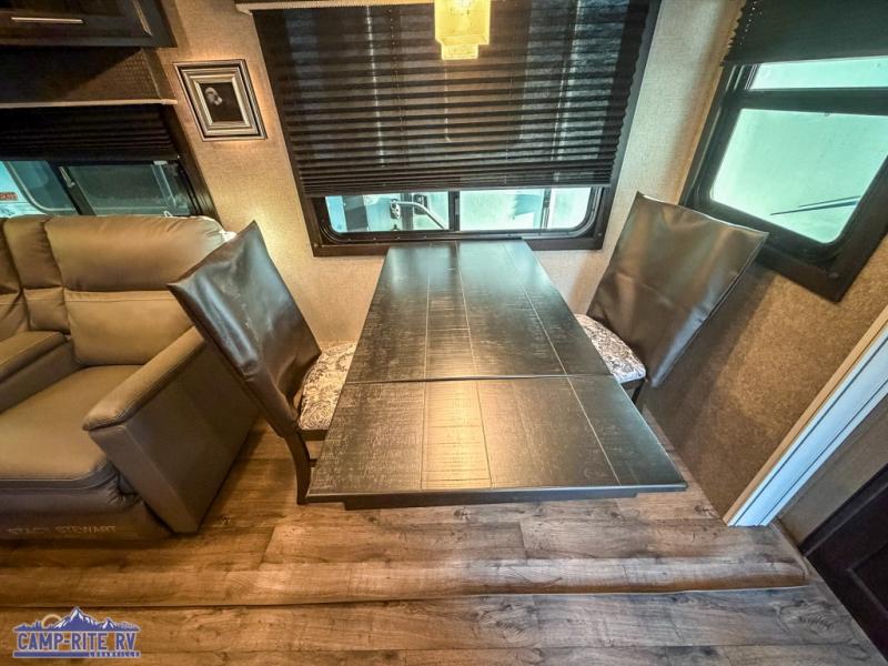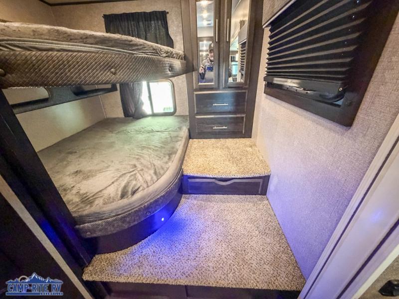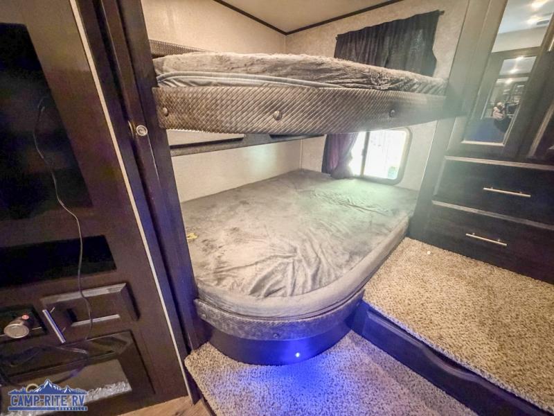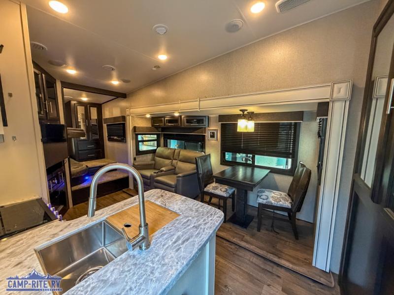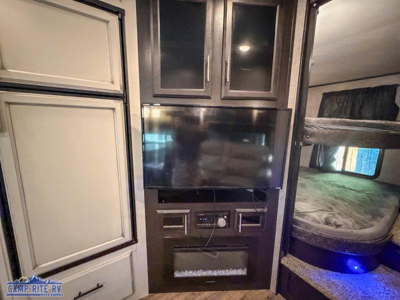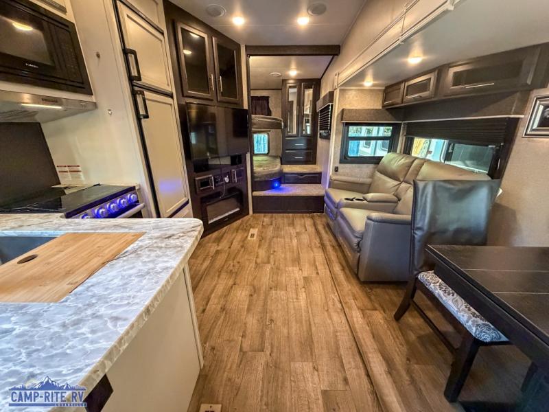 This Eagle HT fifth wheel is one for the whole family! You can easily sleep nine people each night thanks to the added double-size bunks in the private bunkhouse. The bunks can hold up to 600 pounds, and they feature storage space at the top bunk. You and your spouse will have your own master suite up front with a private entrance into the dual-entry bath. The tri-fold sofa and booth dinette have a great view of the LED HDTV, and you can choose to add the optional fireplace for a more at-home feel. Cook up your best dinners on the stainless steel range, or use the outside kitchen if you're wanting fresh air. The 19' electric awning is sure to provide a comfortable outdoor living space, and you'll find six exterior storage compartments for all your gear!